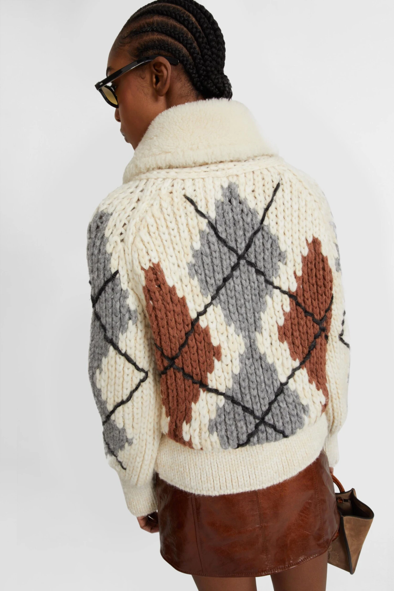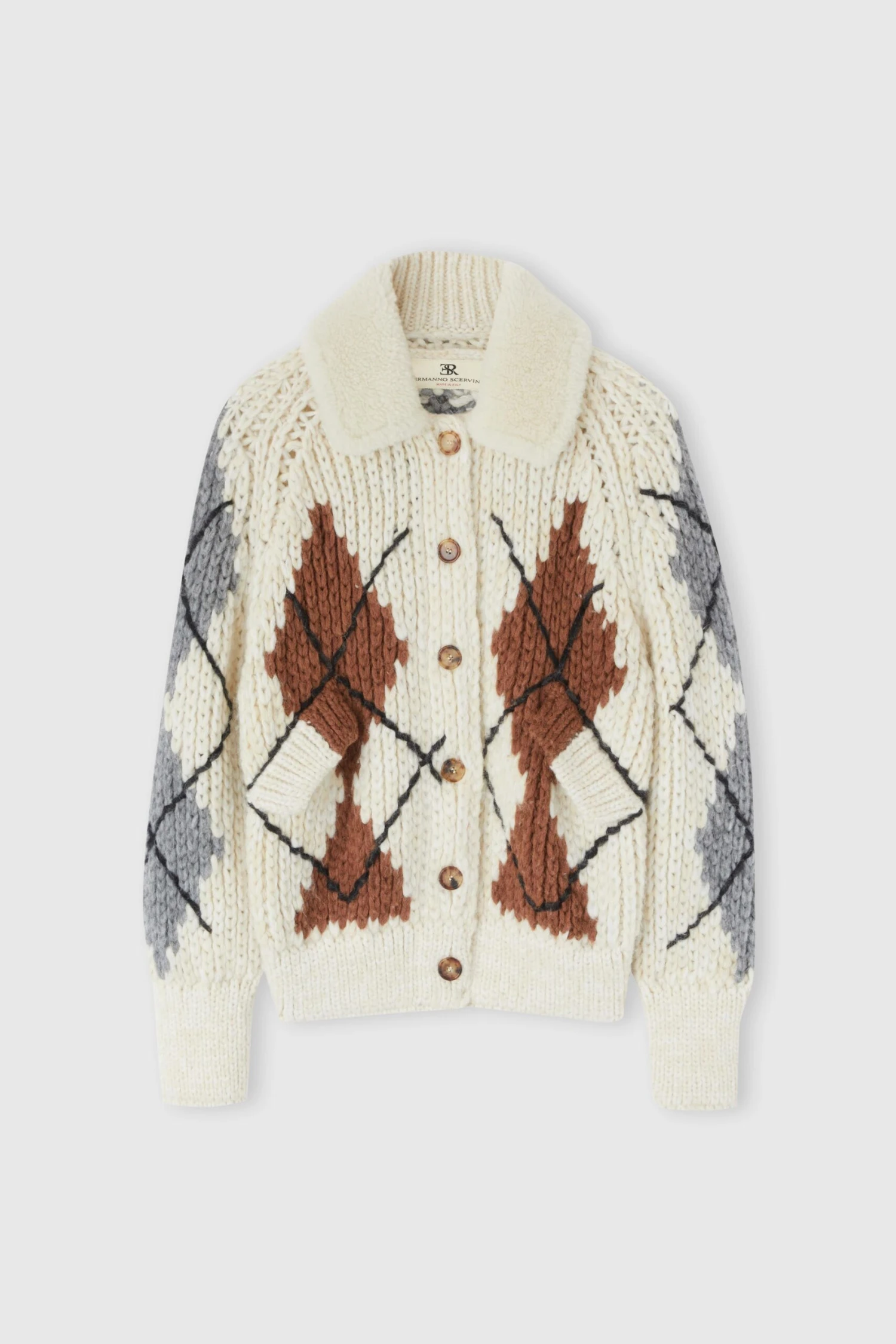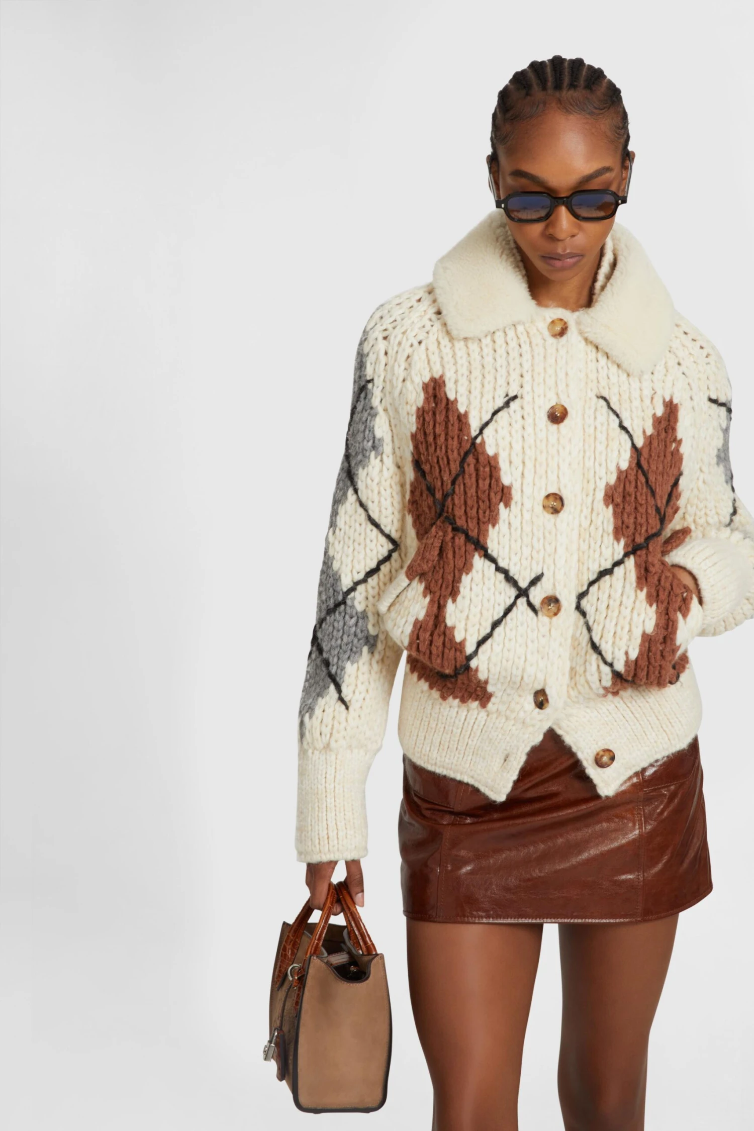 Ermanno Scervino knitwear stands out for its artisanal excellence and refined taste, and this cardigan is an emblematic expression of this. Crafted from a rich blend of alpaca, cashmere, mohair and wool, it envelops you with warmth and lightness, offering a soft and full-bodied hand. The braided workmanship combines with an exclusive reinterpretation of the argyle motif: on the front the design is composed of brown tones, while on the sleeves it is declined in grey, creating a refined chromatic contrast. The graphics, inspired by English architecture, are a distinctive sign of the brand’s creative vision. The overlapping sheepskin collar adds a sophisticated material detail, while the contrasting horn summarys complete the garment with an authentic and decisive touch.