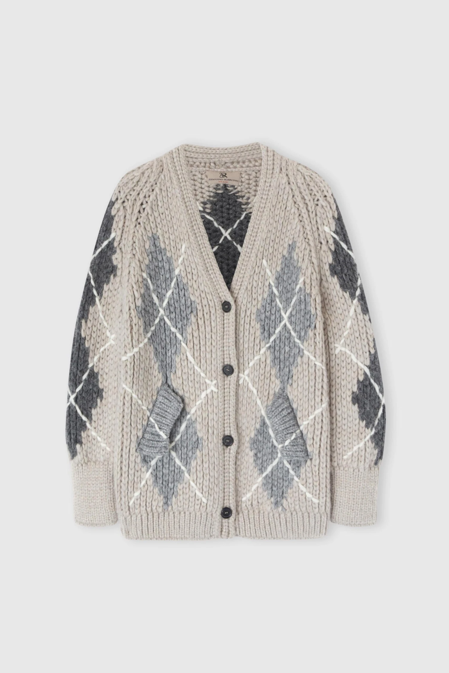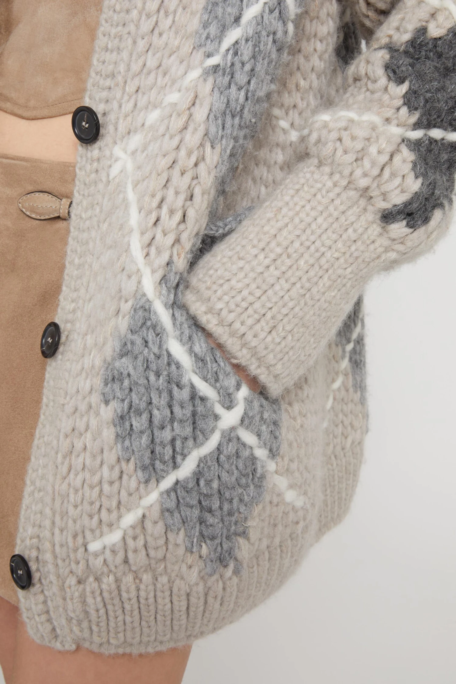 The distinctive element of the garment is the argyle motif, which develops harmoniously on the front, on the back and along the sleeves. Ideal for wearing over flowing shirts or silk tops for a highly effective material contrast, this cardigan lends itself to multiple stylistic interpretations, from the most casual to the most elegant.