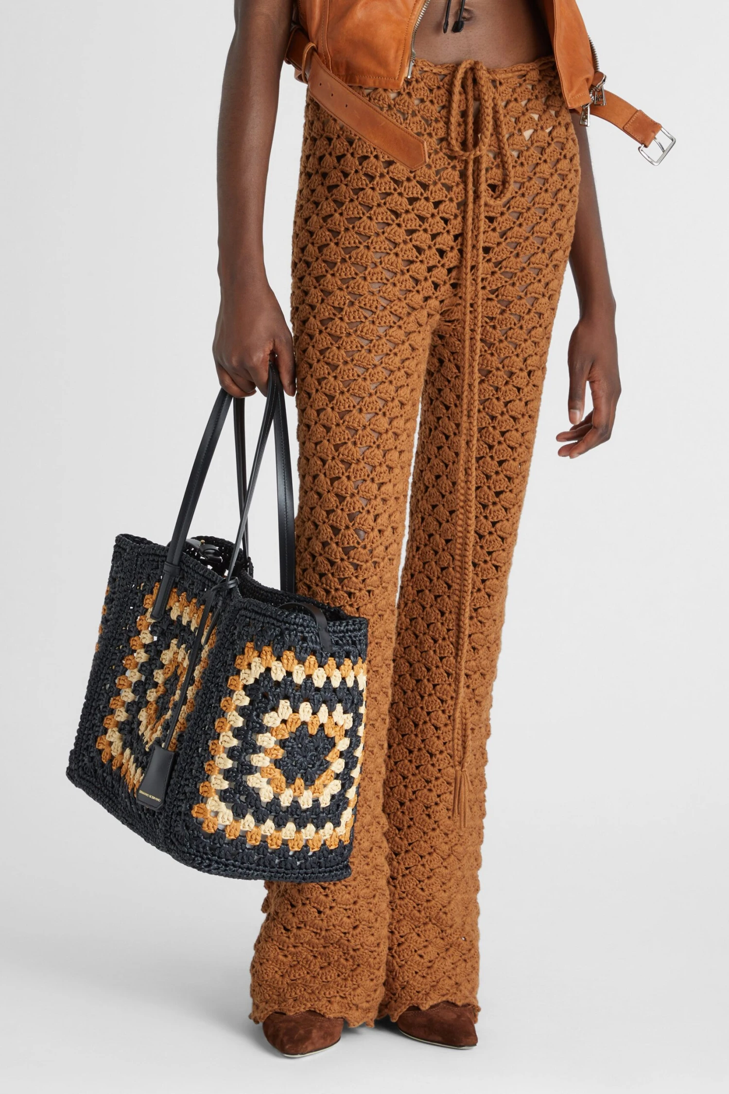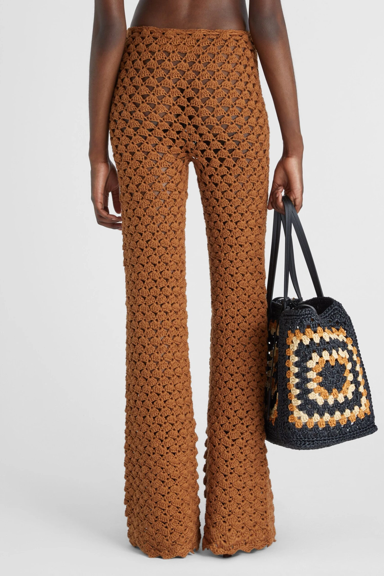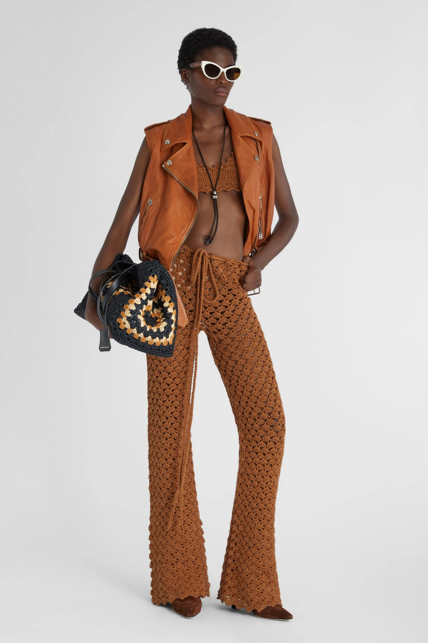 Slightly flair brown trousers, in crochet made by hand in pure cotton. The crochet work follows the fan stitch. The closure consists of a drawstring on the belt, adjustable with two ribbons, also made by hand in braided crochet.