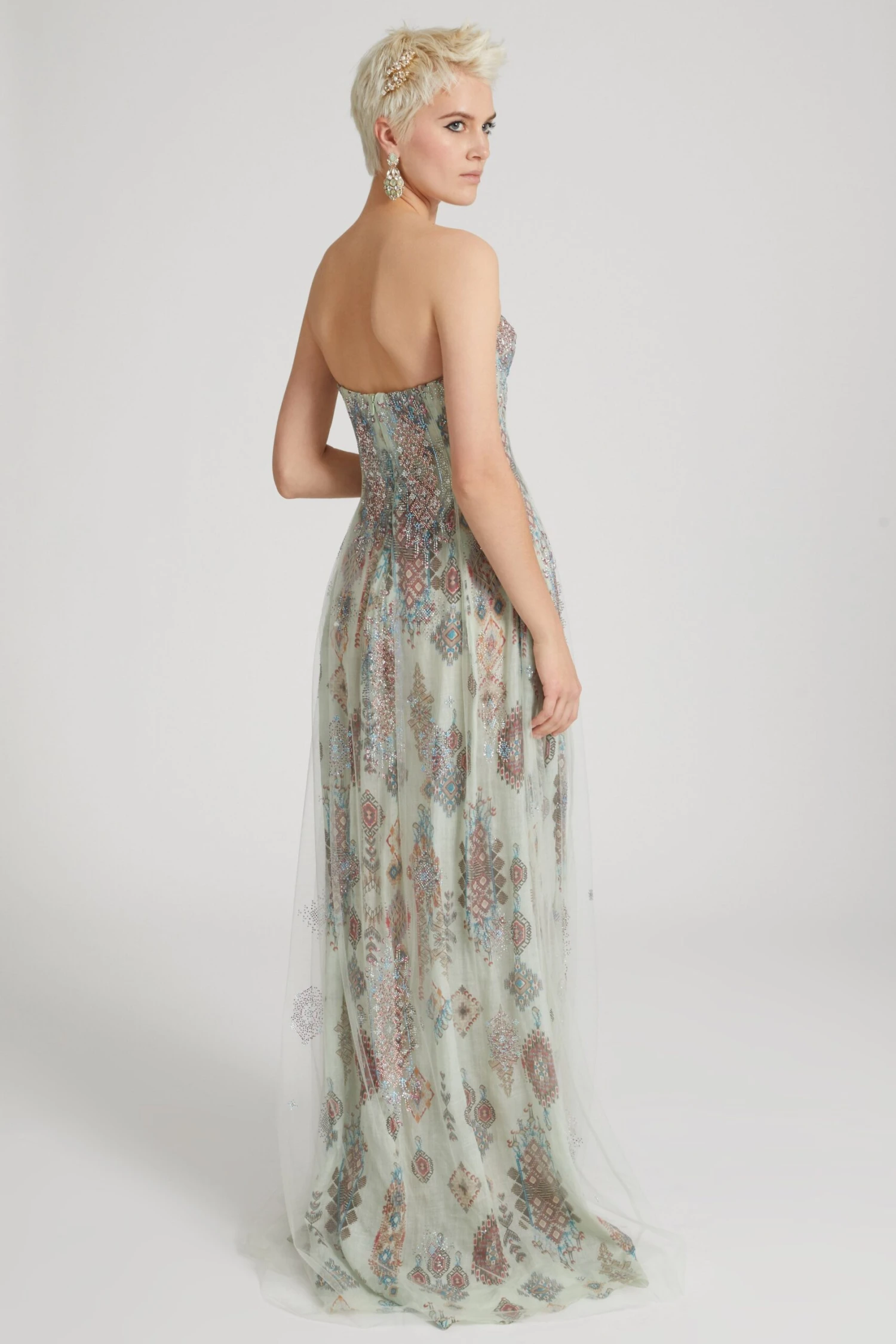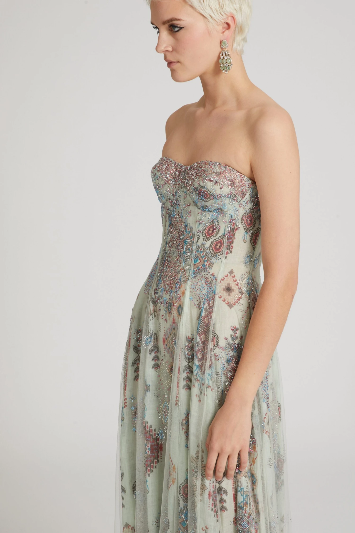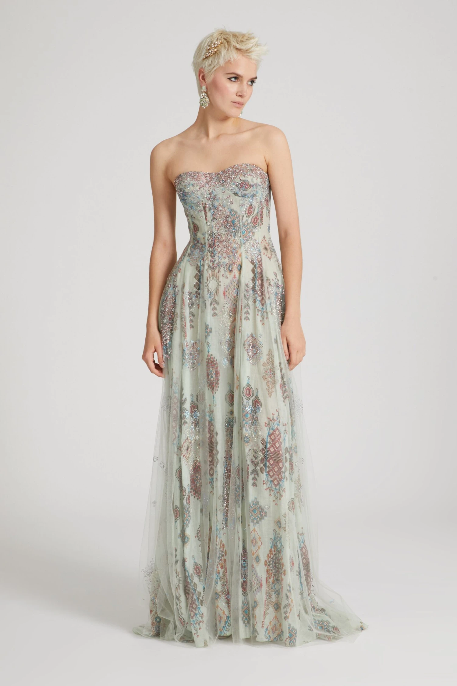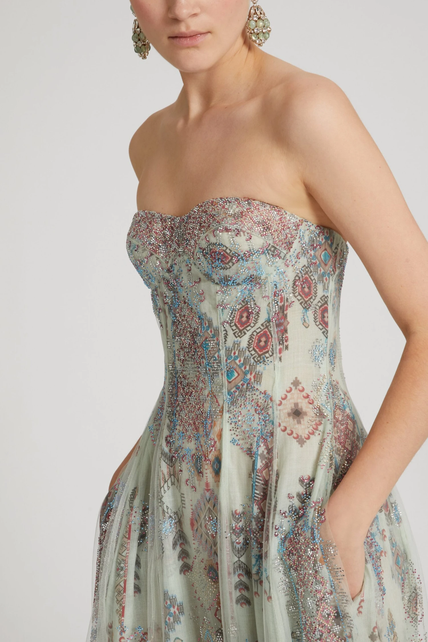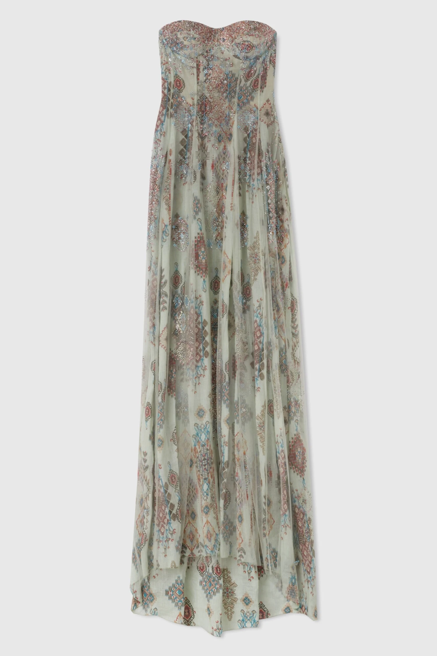 Bustier dress in ramie with hidden back zip and wide skirt. The garment is made by layering two layers: the first underneath, in ramie with an all over geometric print, the second, on top, in semi-transparent toulle with crystals applied in correspondence with the print to give light points and a three-dimensional effect.