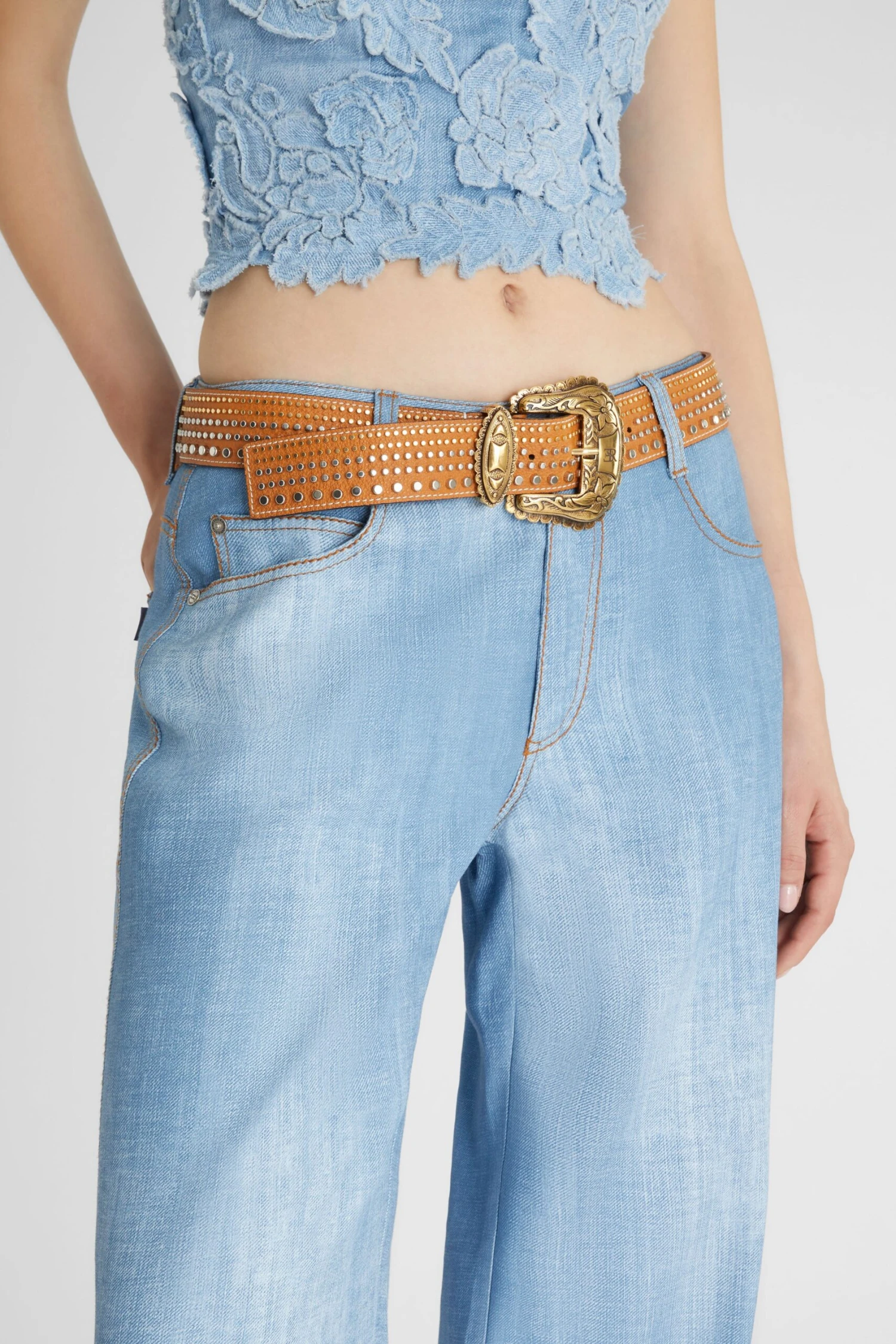 4cm calfskin belt, enriched by a country-style buckle and tip: aged galvanic and engraved floral motif. The belt also features an application of flat and round studs of different sizes and galvanic on the entire surface.
