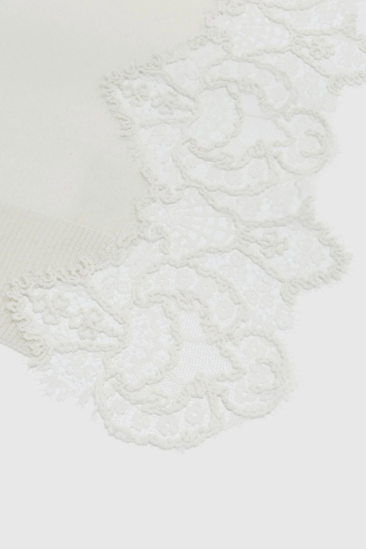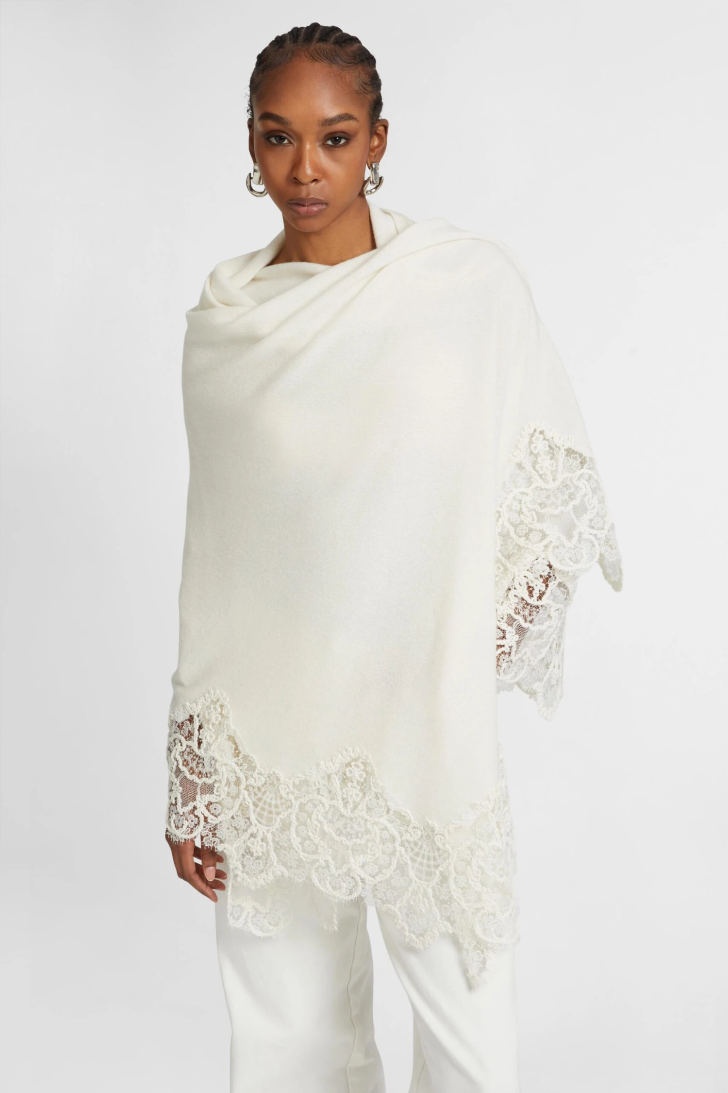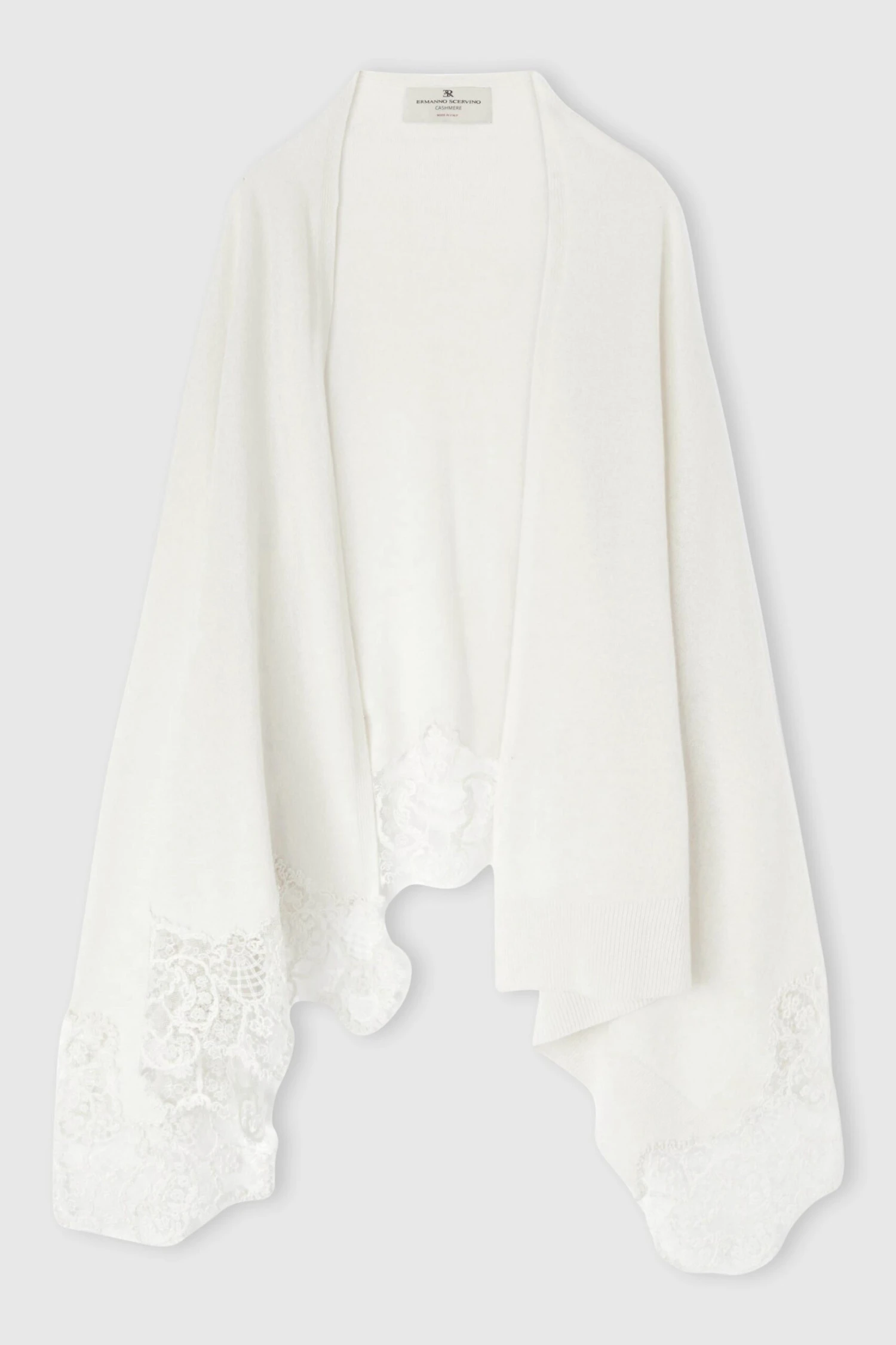 What makes this piece unique is the precious wool rebrode lace edge, applied by hand with artisanal care. The floral motif, exclusive to the maison, develops with a three-dimensional design and rich in reliefs that gives a distinctive, couture note to the yarn. The texture of the lace dialogues harmoniously with the soft, full surface of the cashmere, creating a sophisticated, effective contrast.
