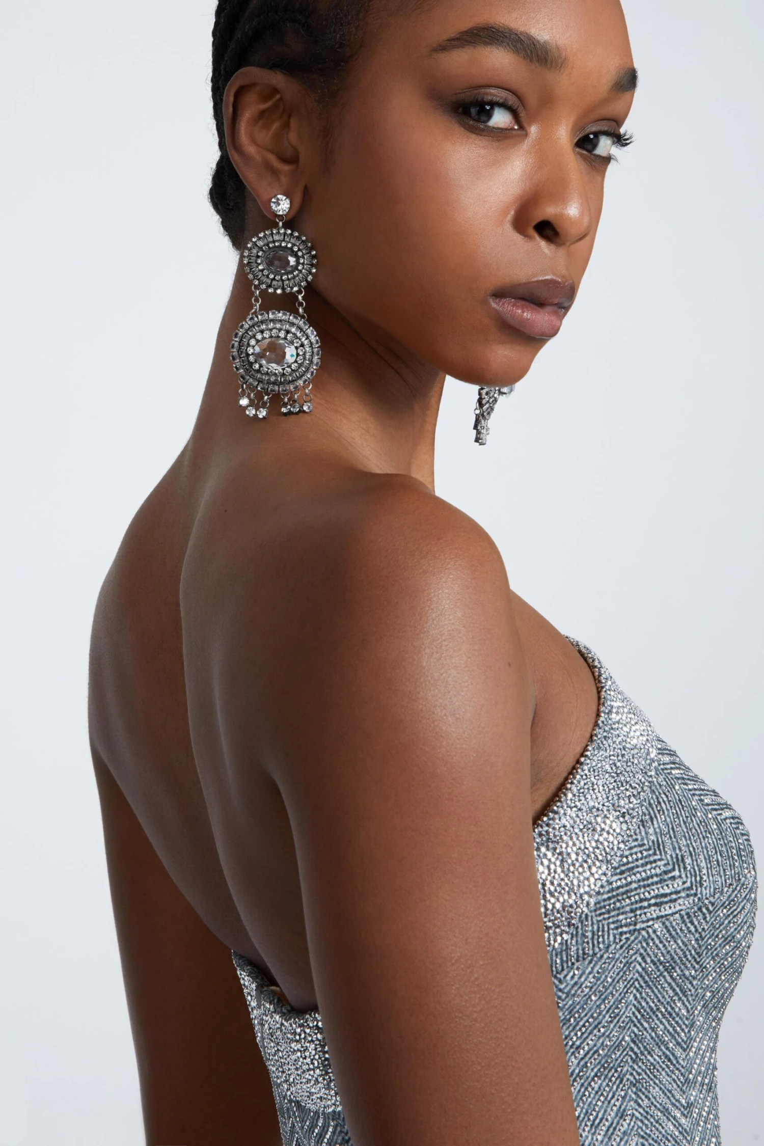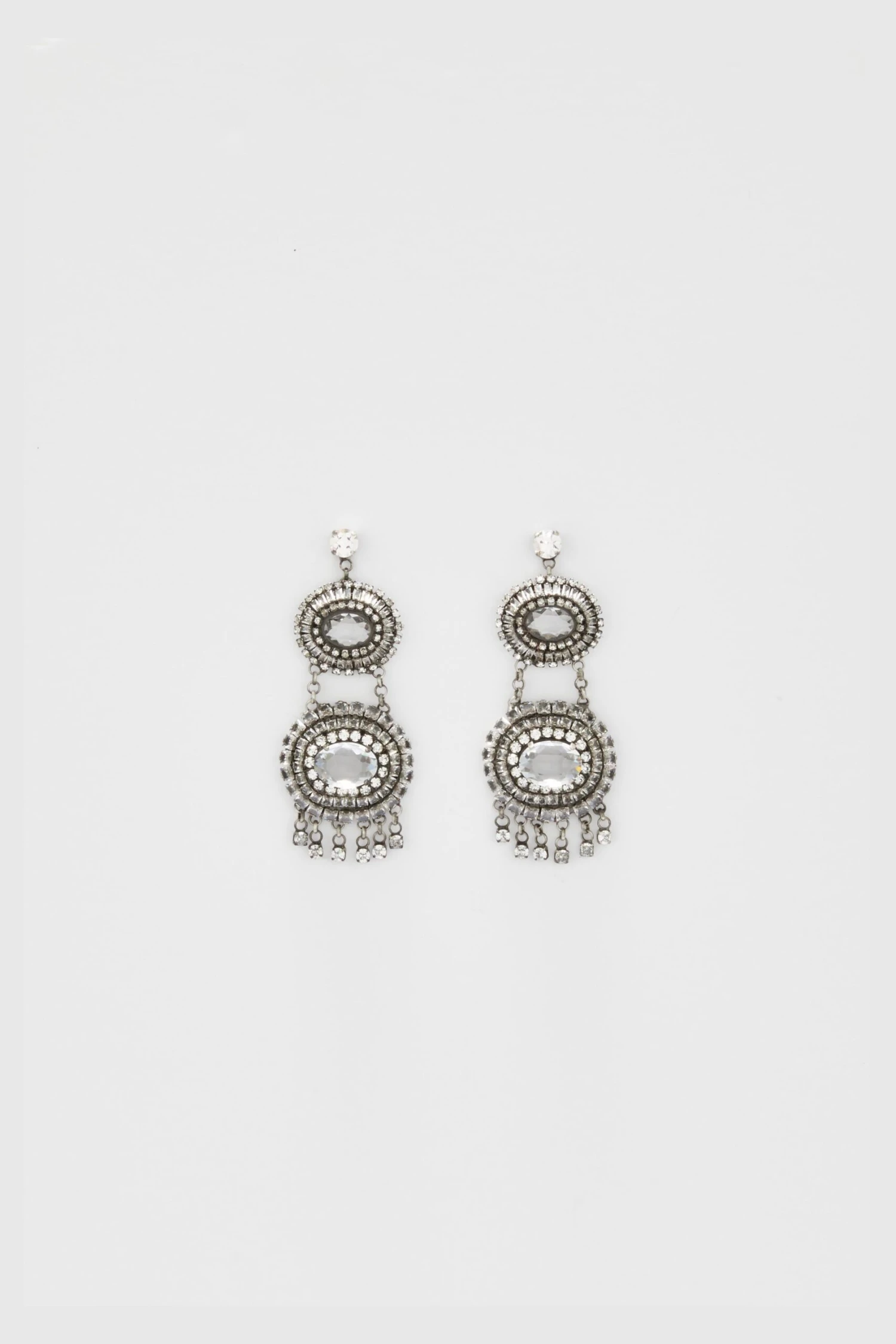 Full of charm and opulence, these chandelier earrings by Ermanno Scervino reinterpret the Byzantine aesthetic with a luminous and contemporary elegance. The pendant structure develops in a double oval frame: a smaller one, close to the lobe, and a larger one that completes the design vertically, both adorned with hand-set crystals. The overlapping of the shapes creates a refined play of volumes and reflections, in perfect harmony with the spirit of the collection. An accessory that gives light and personality even to the most essential look.