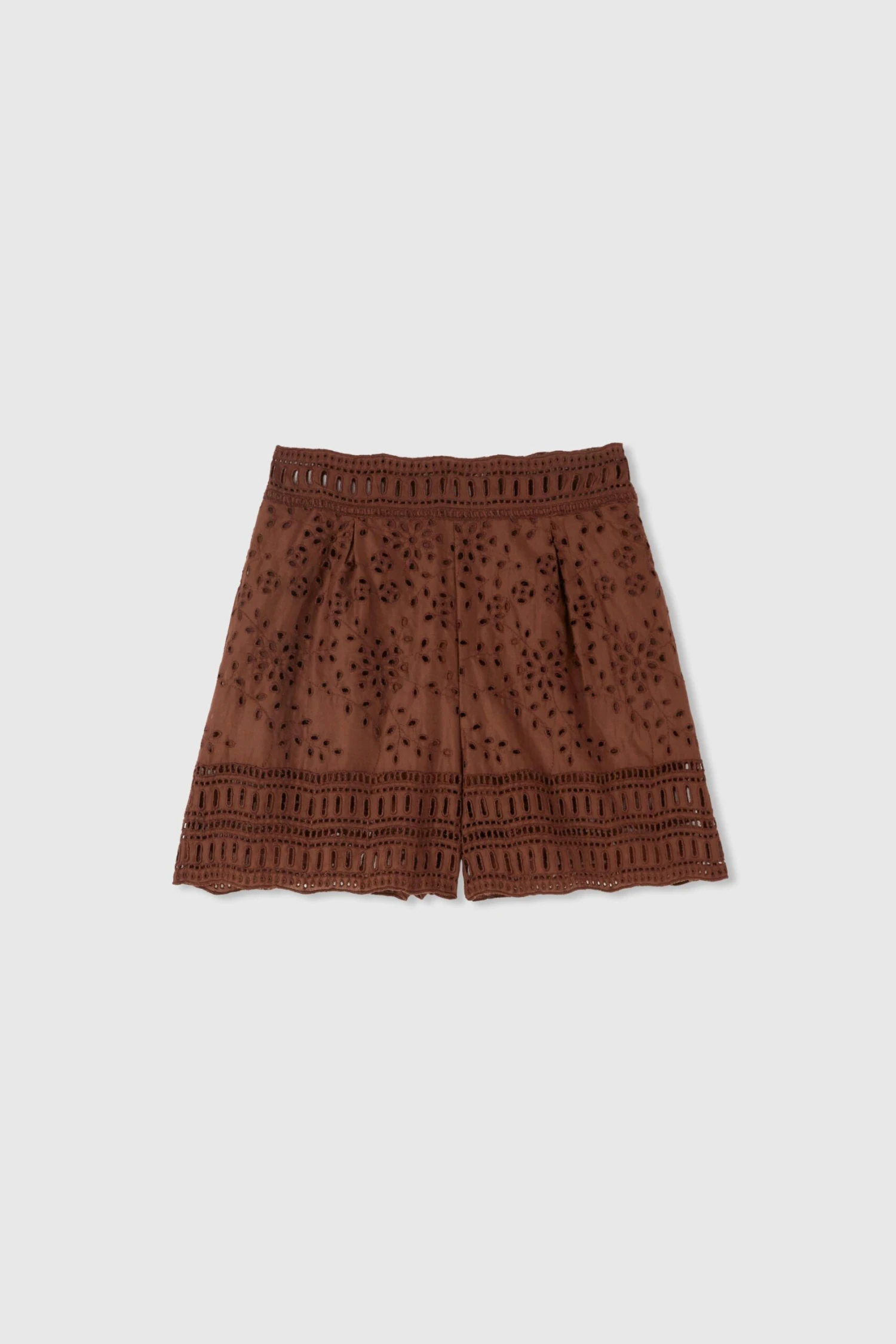Cotton blend shorts with hidden side zip. The garment is embellished with an all over sangallo workmanship with an alternating floral motif on the bottom and on the belt with a geometric pattern, with scalloped finished edges.