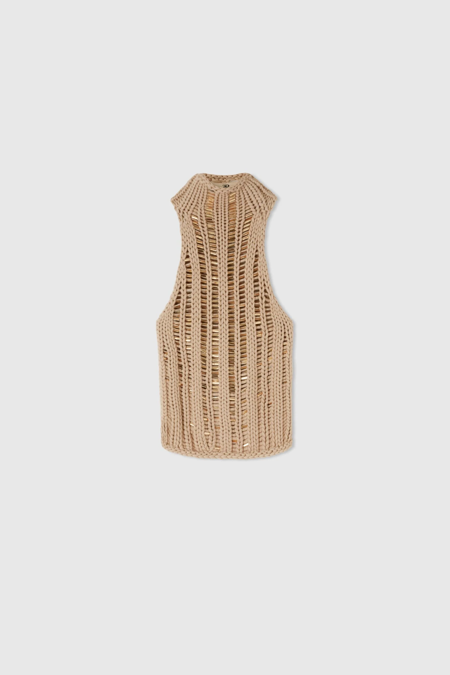 Top in cotton blend knit, worked with vertical braids alternating with the application of rectangular crystals in tone, degrade from the neck to the bottom for a play of light.
