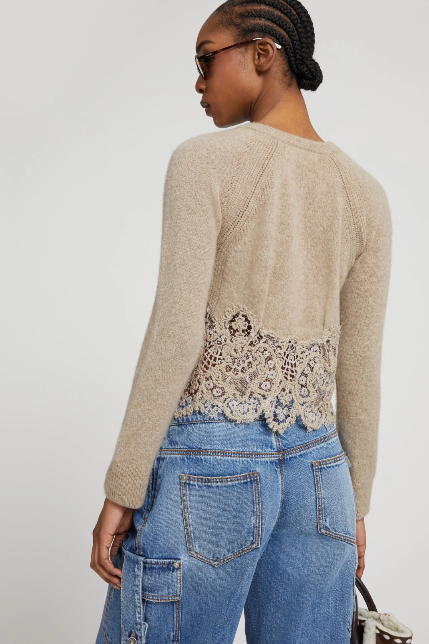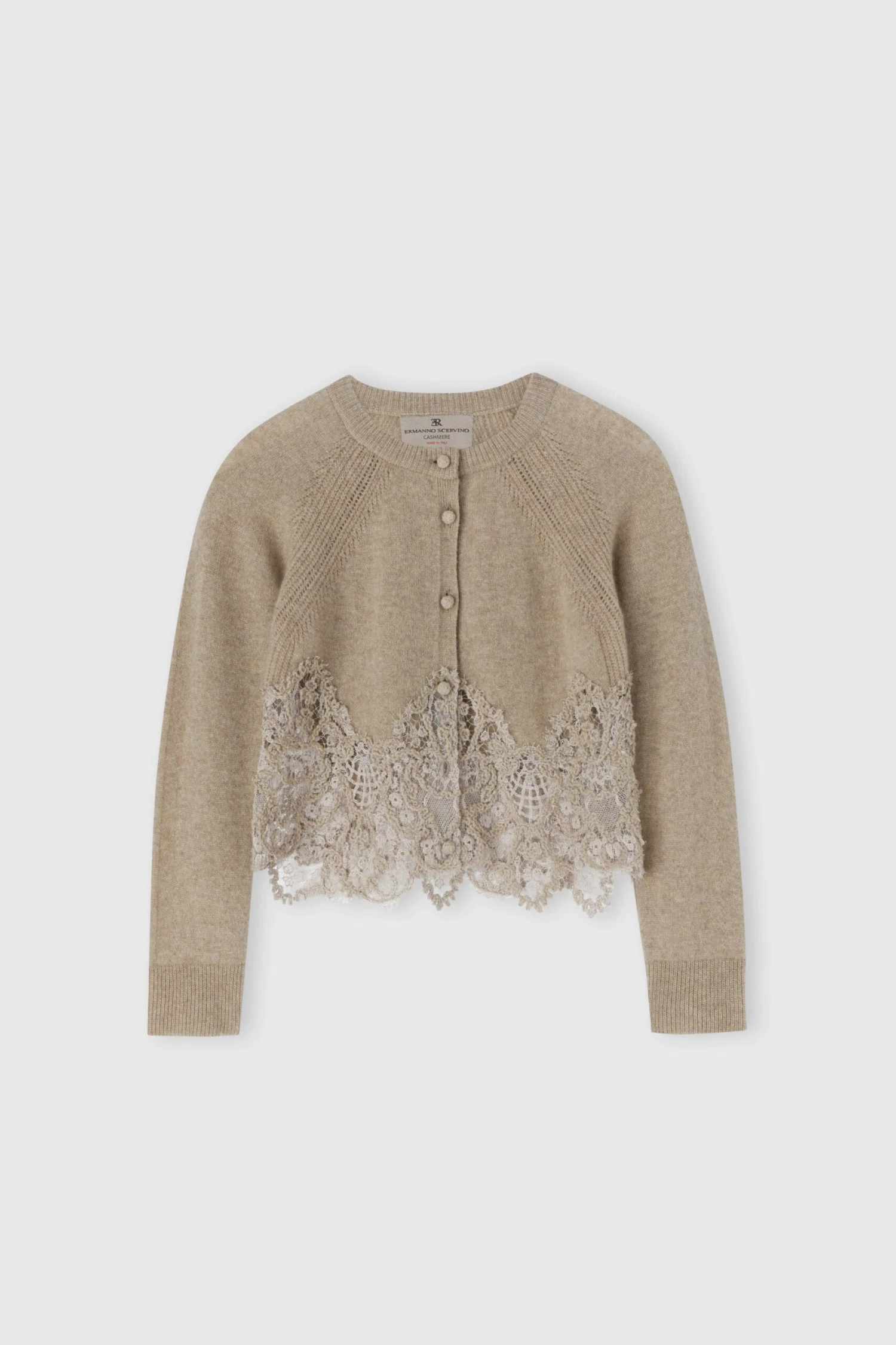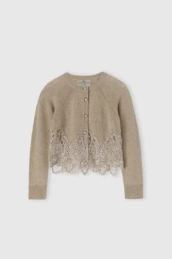 The edge of the collar and cuffs is worked in tight ribbing, ensuring adherence and comfort without sacrificing the softness of the yarn. The bottom is embellished with a delicate inlay in tone-on-tone wool rebrode lace, applied by hand: the floral motif, designed exclusively by the maison, gracefully expresses the romantic and artisanal identity of the brand. The front summarys, wrapped in the same fabric as the cardigan, complete the garment with a sign of chromatic coherence and sartorial care.