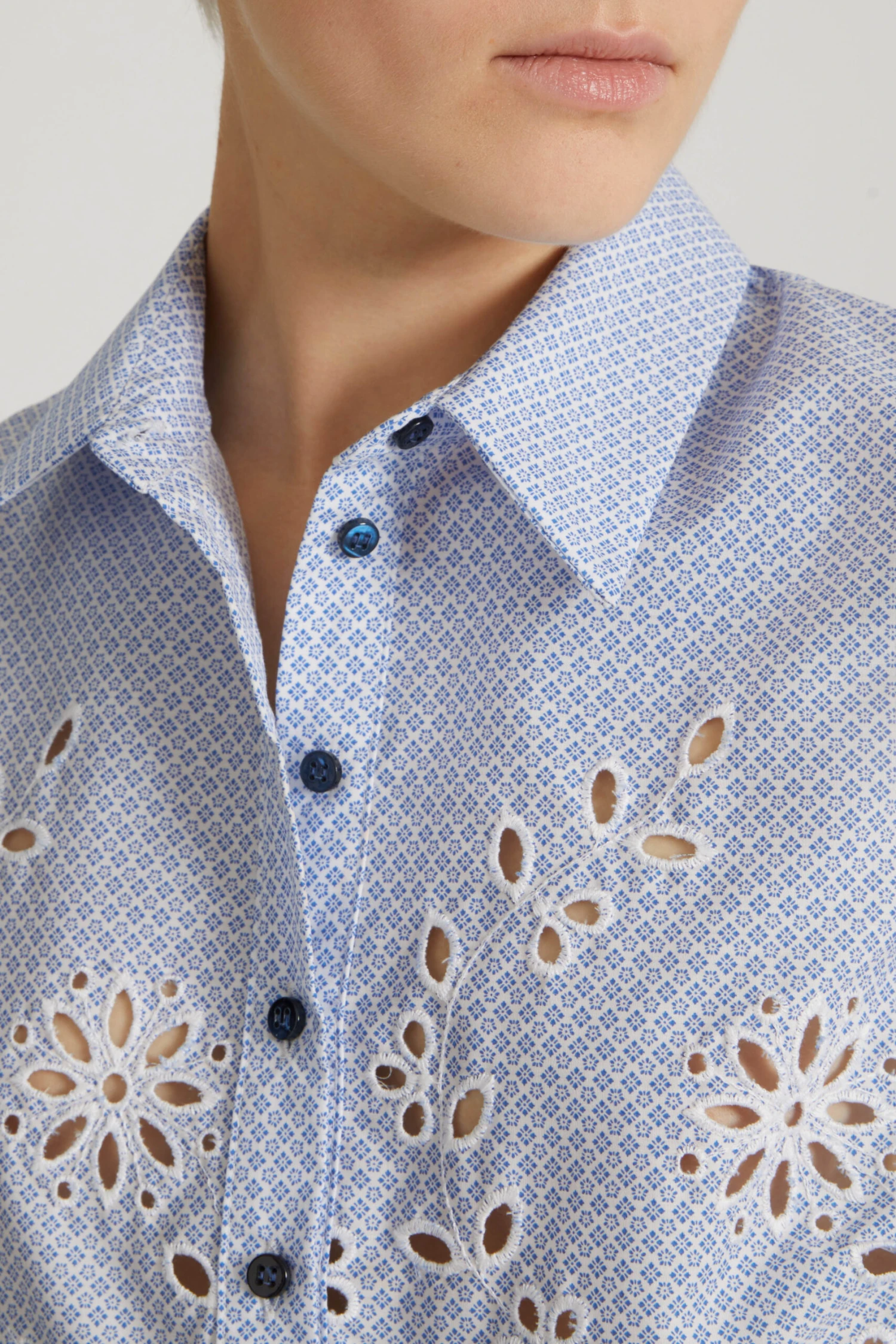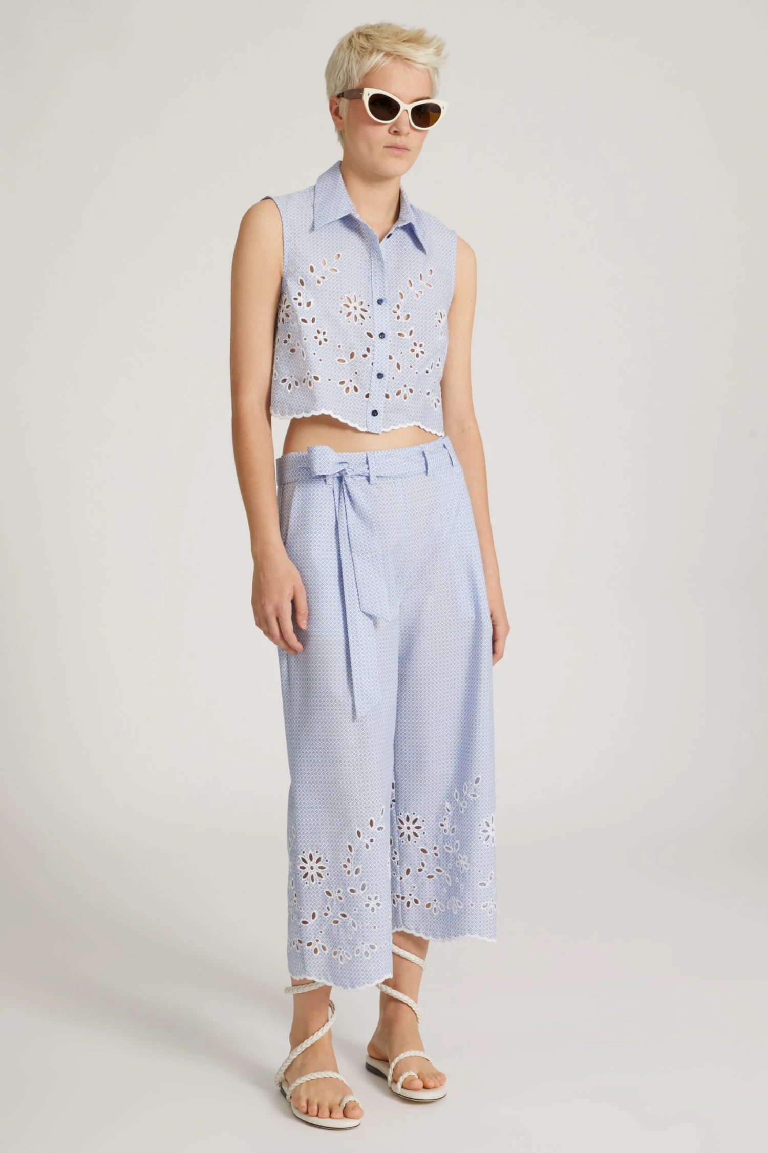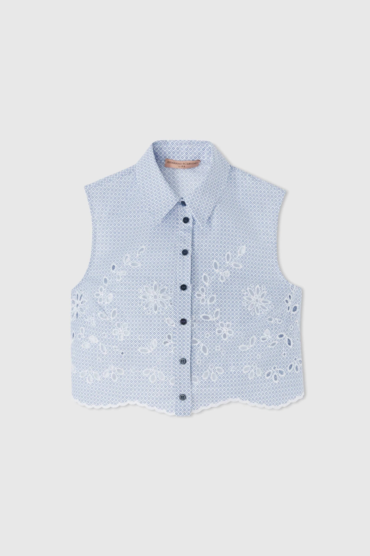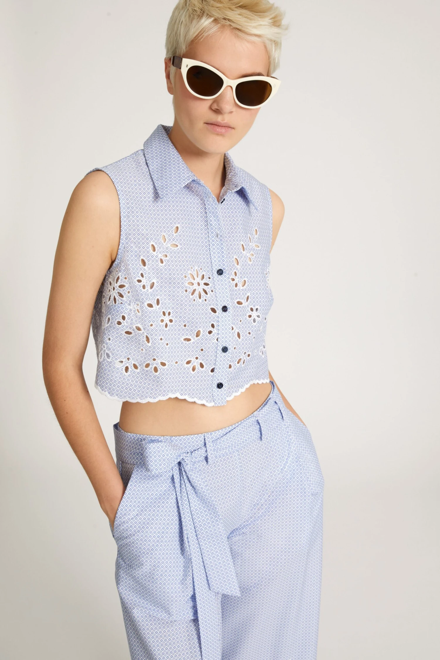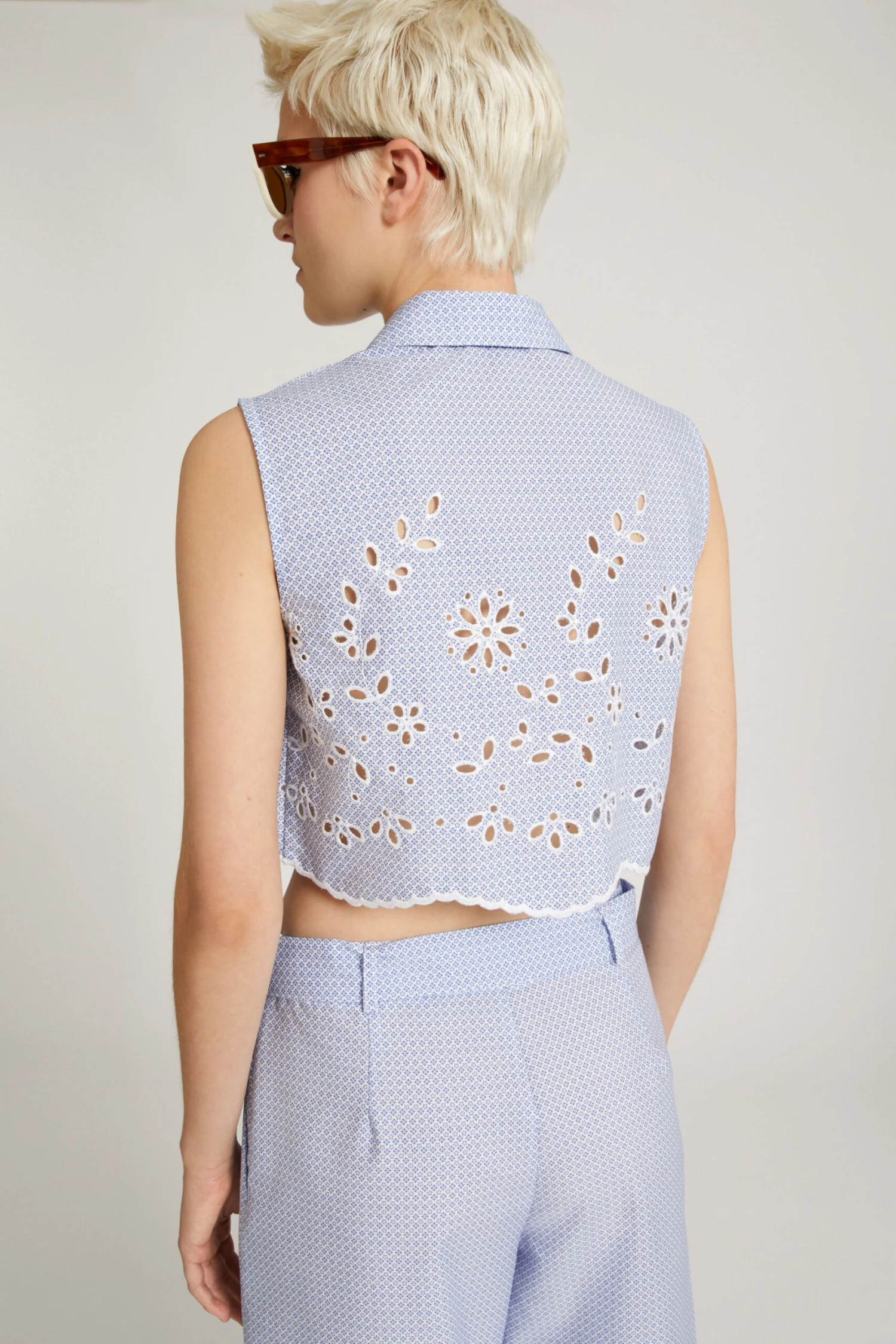 Sleeveless cropped blouse in pure cotton. The garment is enriched with sangallo lace details, which develop from the bottom and go up along the bust to breast height. The bottom is finished with scalloping and the summarys have a contrasting tone.