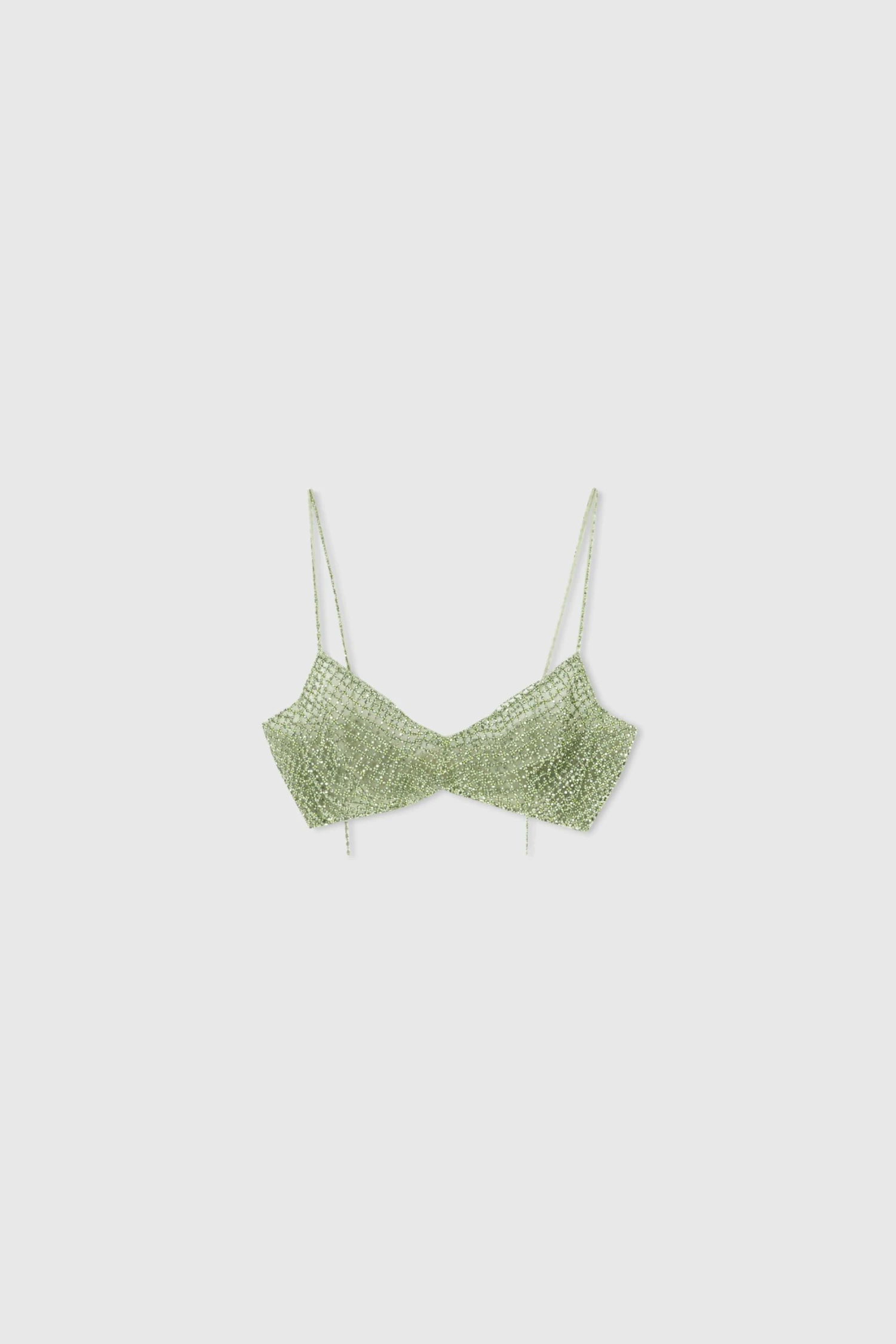 Deconstructed toulle bra with hook-and-eye fastening at the back. The micro crystal net that makes up the top is very special, completely handmade.
