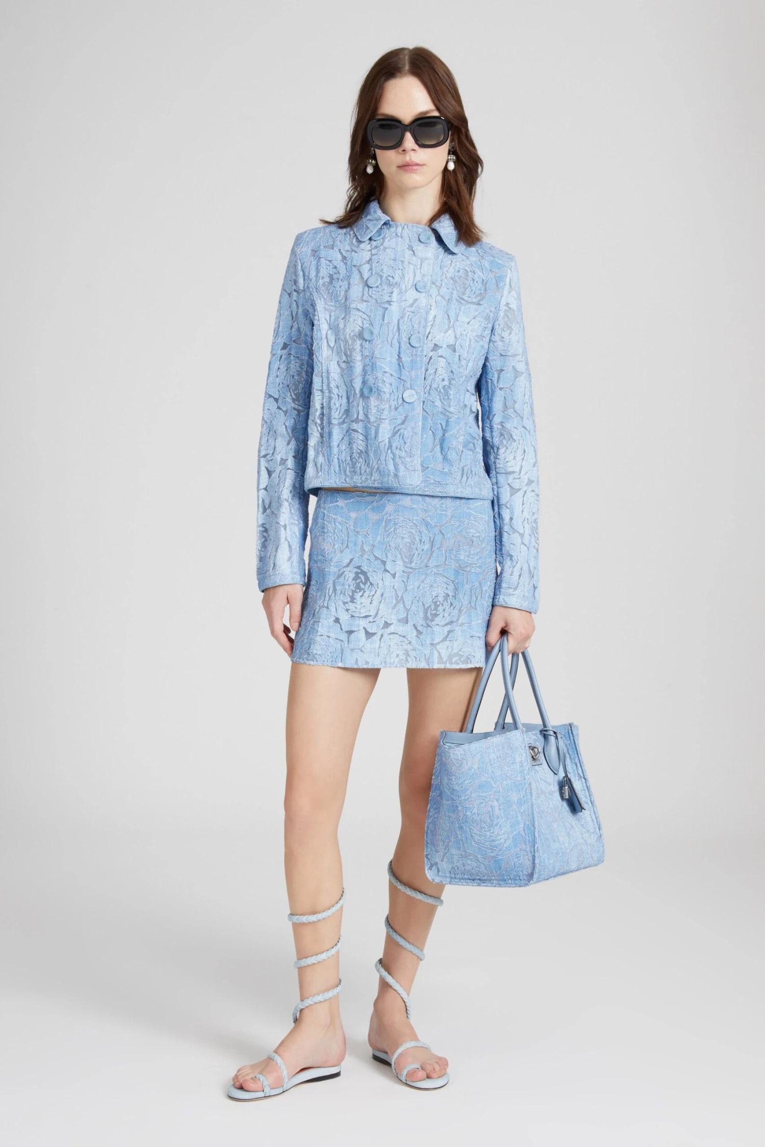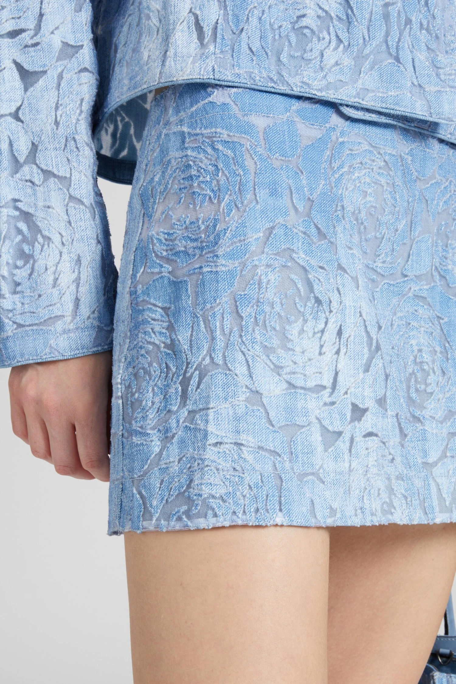 Denim miniskirt with hidden side zip. The floral motif is created using the special devore technique: a chemical process that corrodes the fibres of the fabric to compose a predetermined pattern.
