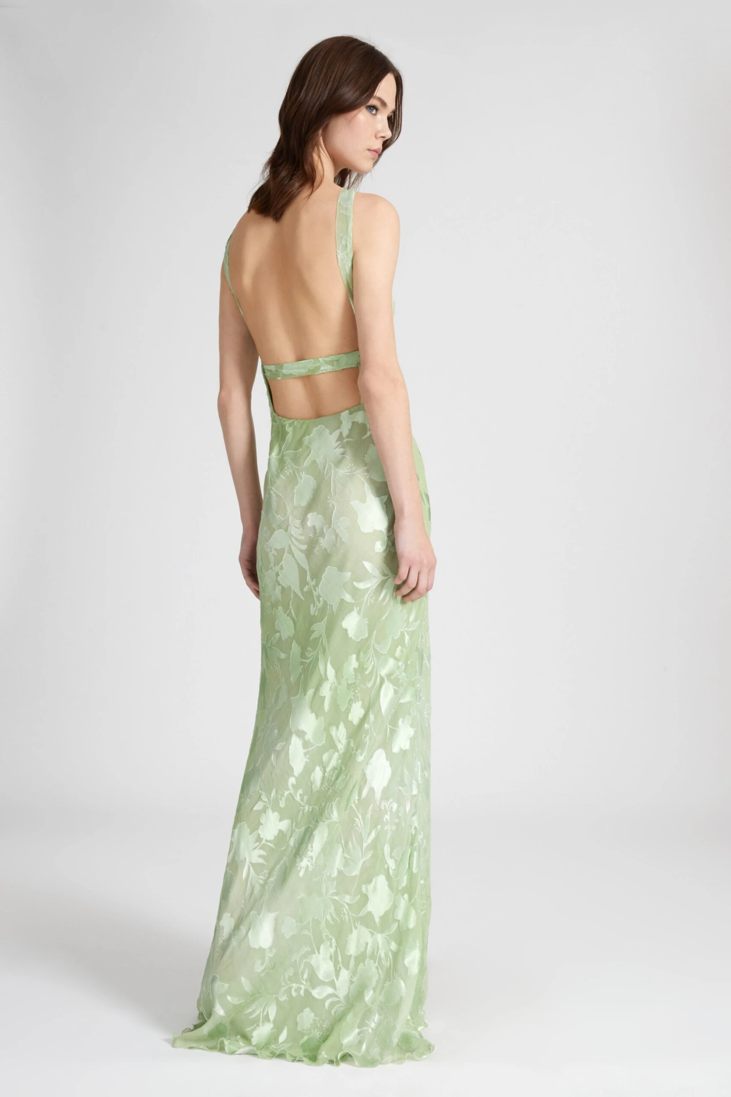 Silk-blend mermaid long dress with American neckline embellished with a sash and nude on the back. The particular floral motif is realised through the devore technique: a chemical process that corrodes the fibres of the fabric to compose a predetermined pattern.