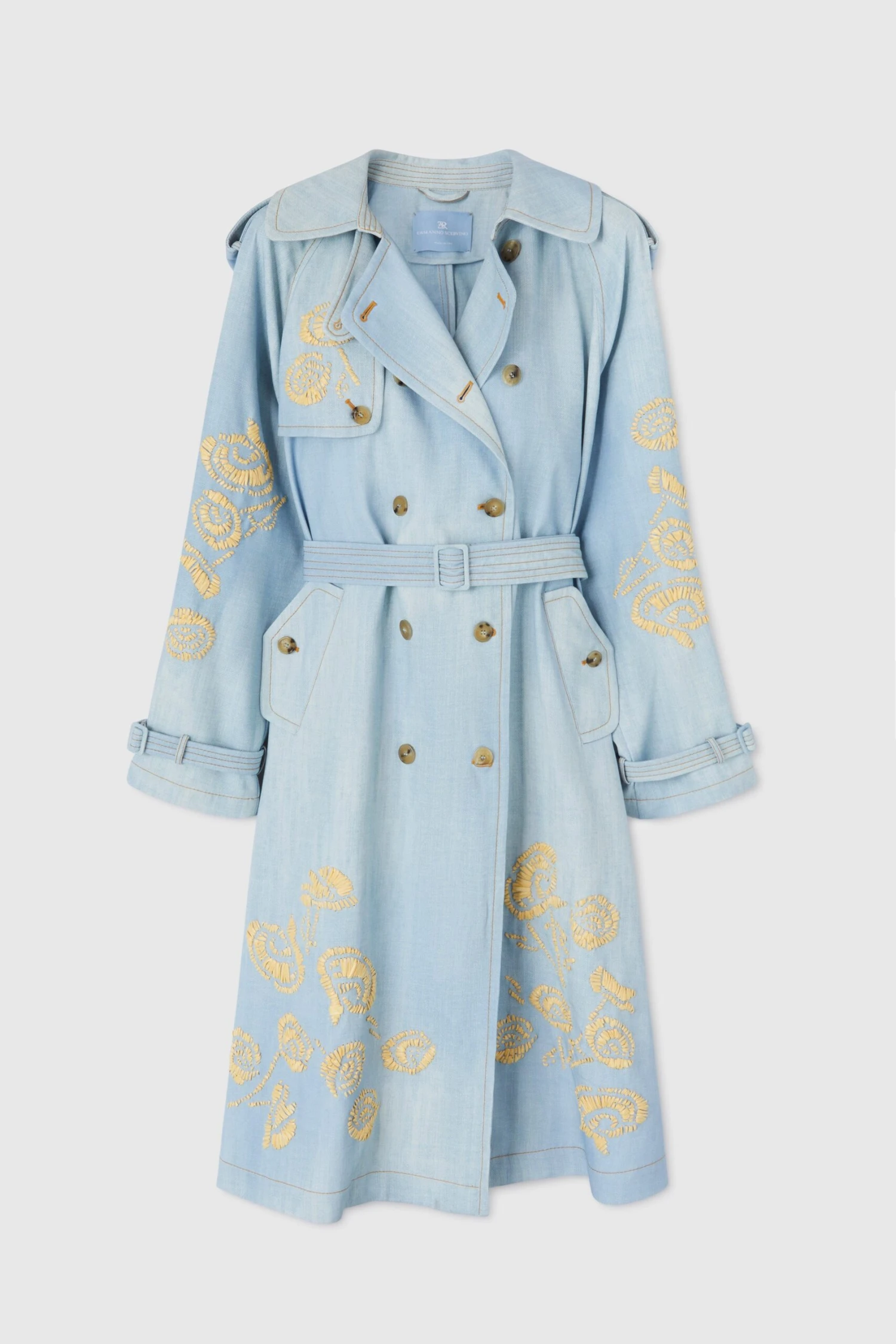 Double-breasted trench coat with contrasting summarys and waist belt. The garment is made of our iconic denim print viscose, crisp to the touch. Handmade rafia floral embroidery by our artisans embellishes the trench coat on the front, sleeves and back cape. The cuff is adjustable thanks to the tone-on-tone loop.