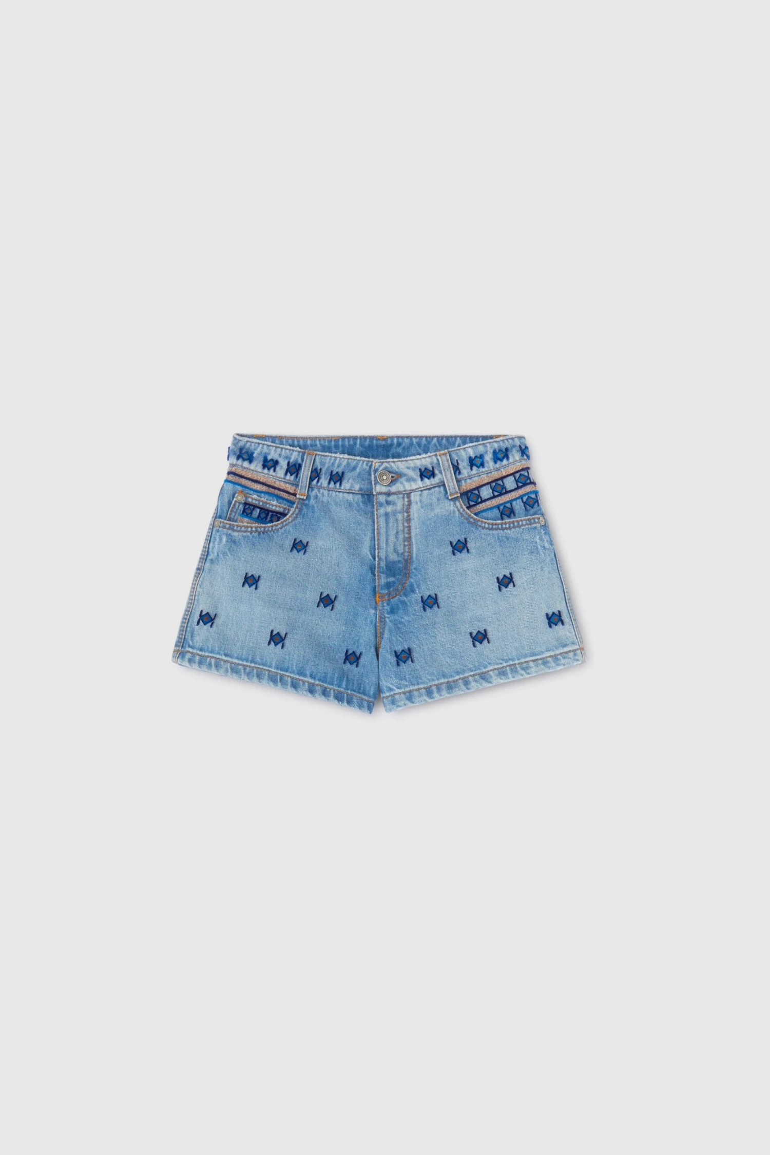 Denim shorts with allover hand-made geometric embroidery alternating threads of different colors for greater three-dimensionality; the embroidery detail is also present both on the pocket thread and on the inside.