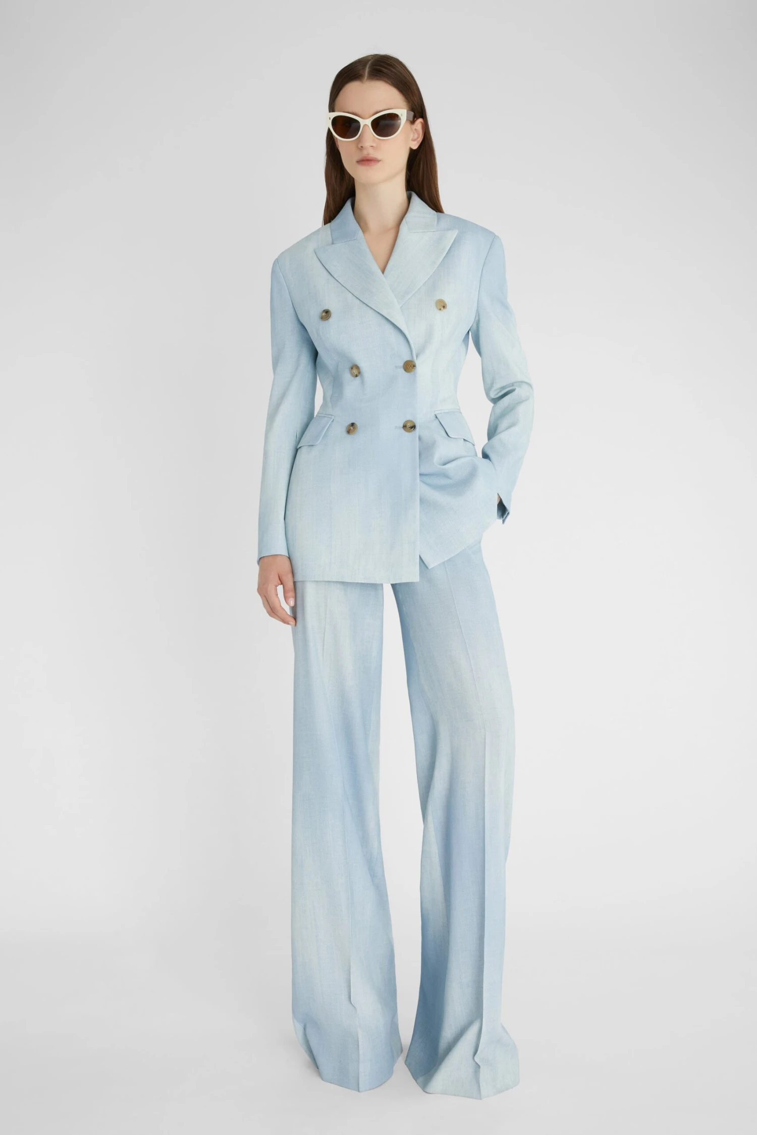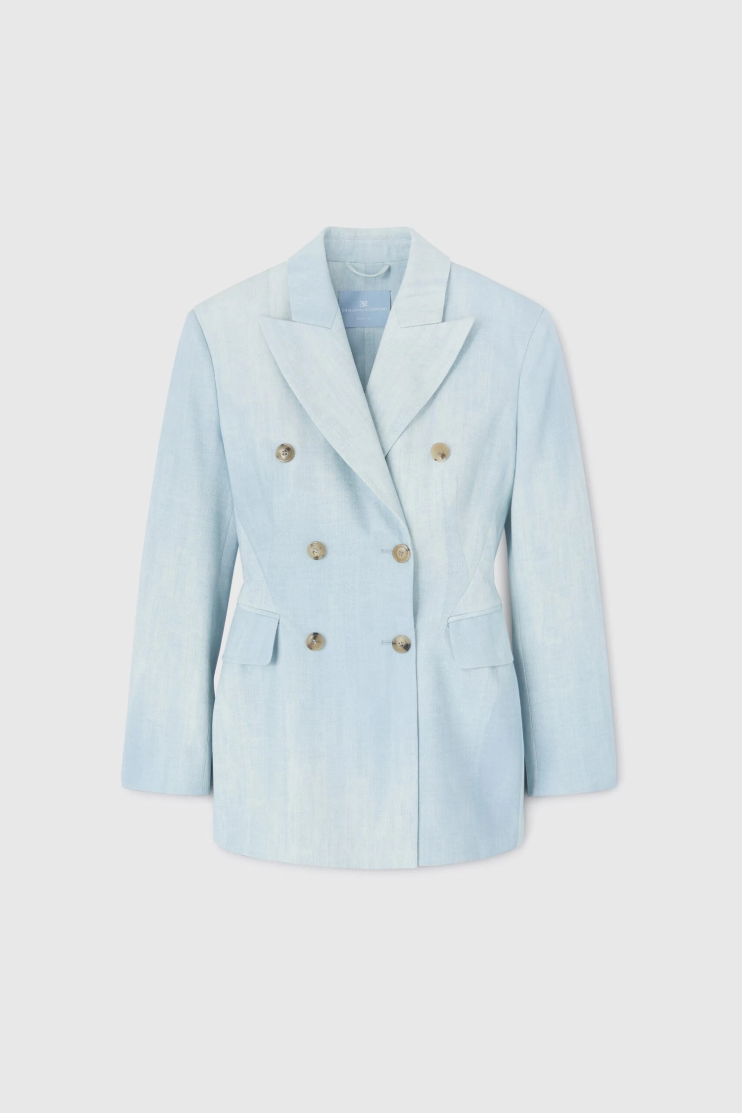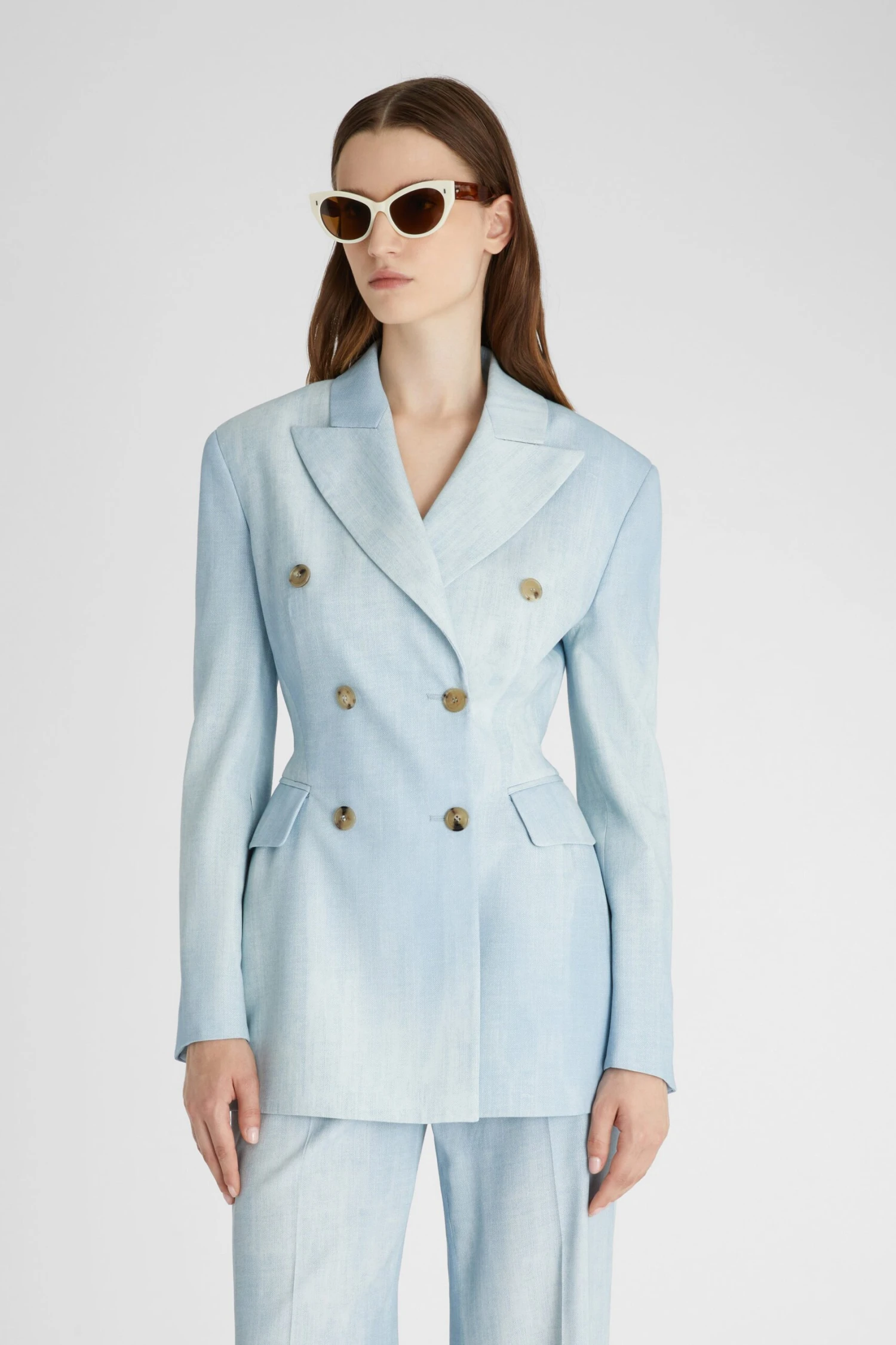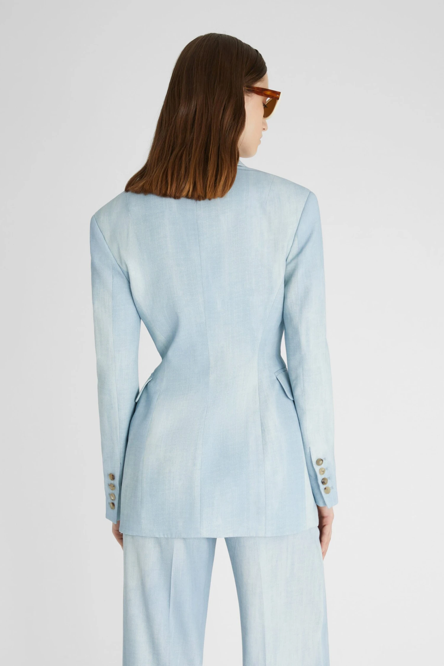 Double-breasted sculpture blazer in the iconic Ermanno Scervino marocain denim print: a contemporary tribute to the classic denim texture. The summarys are tortoiseshell for a contrasting effect against the light wash of the denim print.