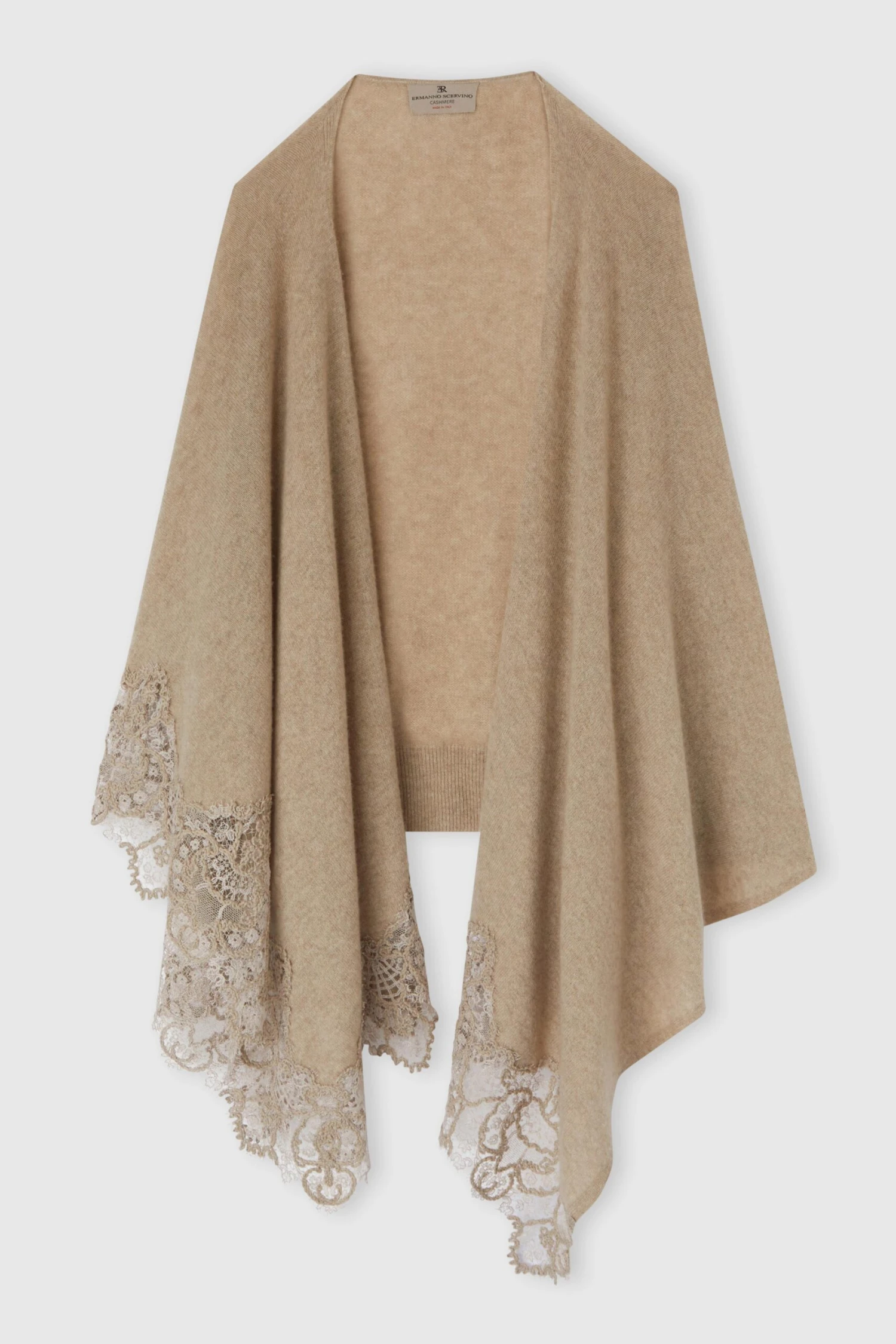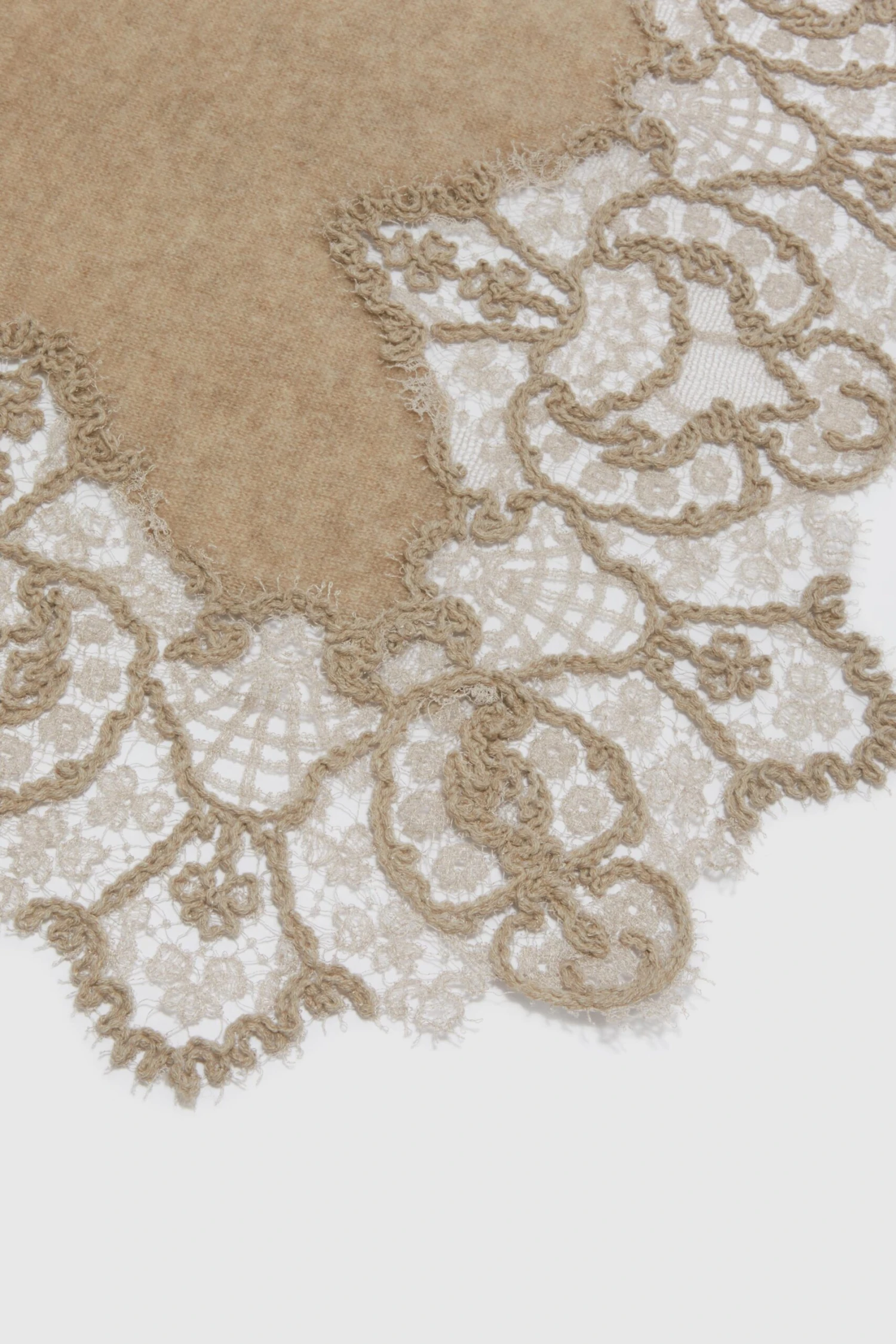 A distinctive detail is the hand-applied tone-on-tone wool rebrode lace border. The floral design, exclusive to the maison, creates a refined play of reliefs that adds depth and three-dimensionality to the garment. The interweaving of the full-bodied cashmere and the structured lightness of the lace makes the stole a unique accessory, capable of blending tradition and innovation.