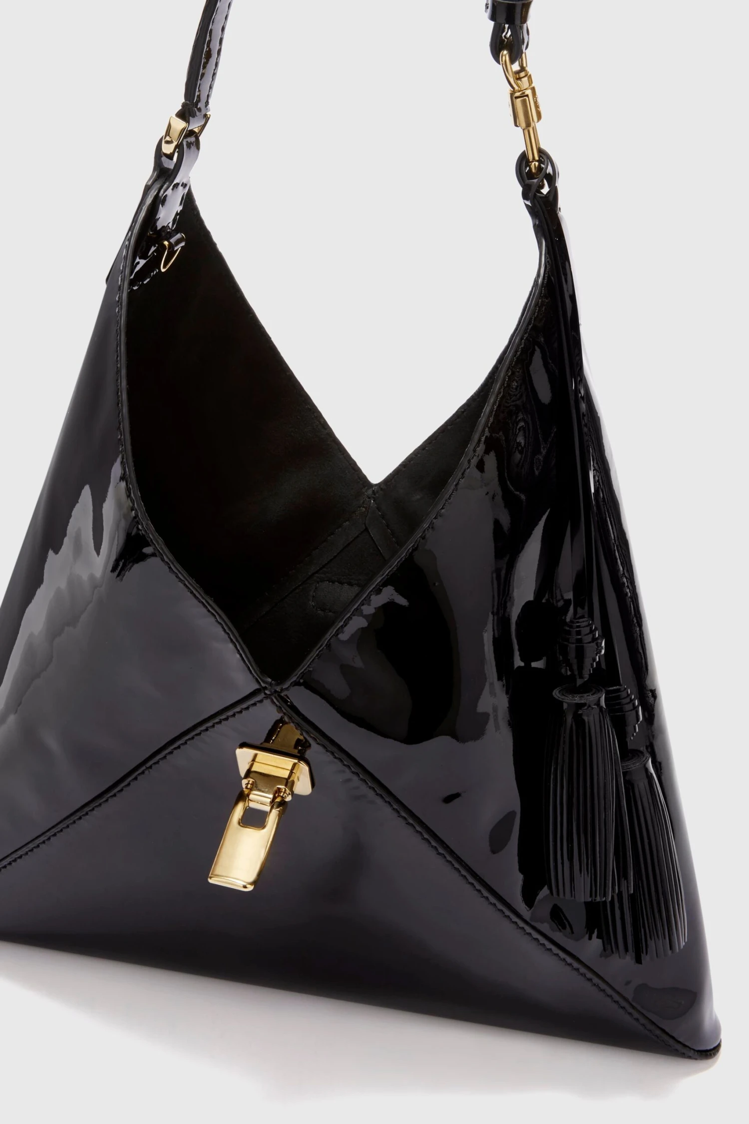 Minimalist elegance and uncompromising quality characterize the new version of the Dudu bag by Ermanno Scervino. Made of soft patent leather with a shiny finish that captures the light, this hobo bag combines functionality and style. The essential design is enriched by the new clip closure, developed specifically for the collection, which gives a modern and practical touch. The metal snap hook, in addition to ensuring safety, adds a distinctive style detail. Designed to be carried on the shoulder, it is the perfect versatile and chic accessory for any occasion.
