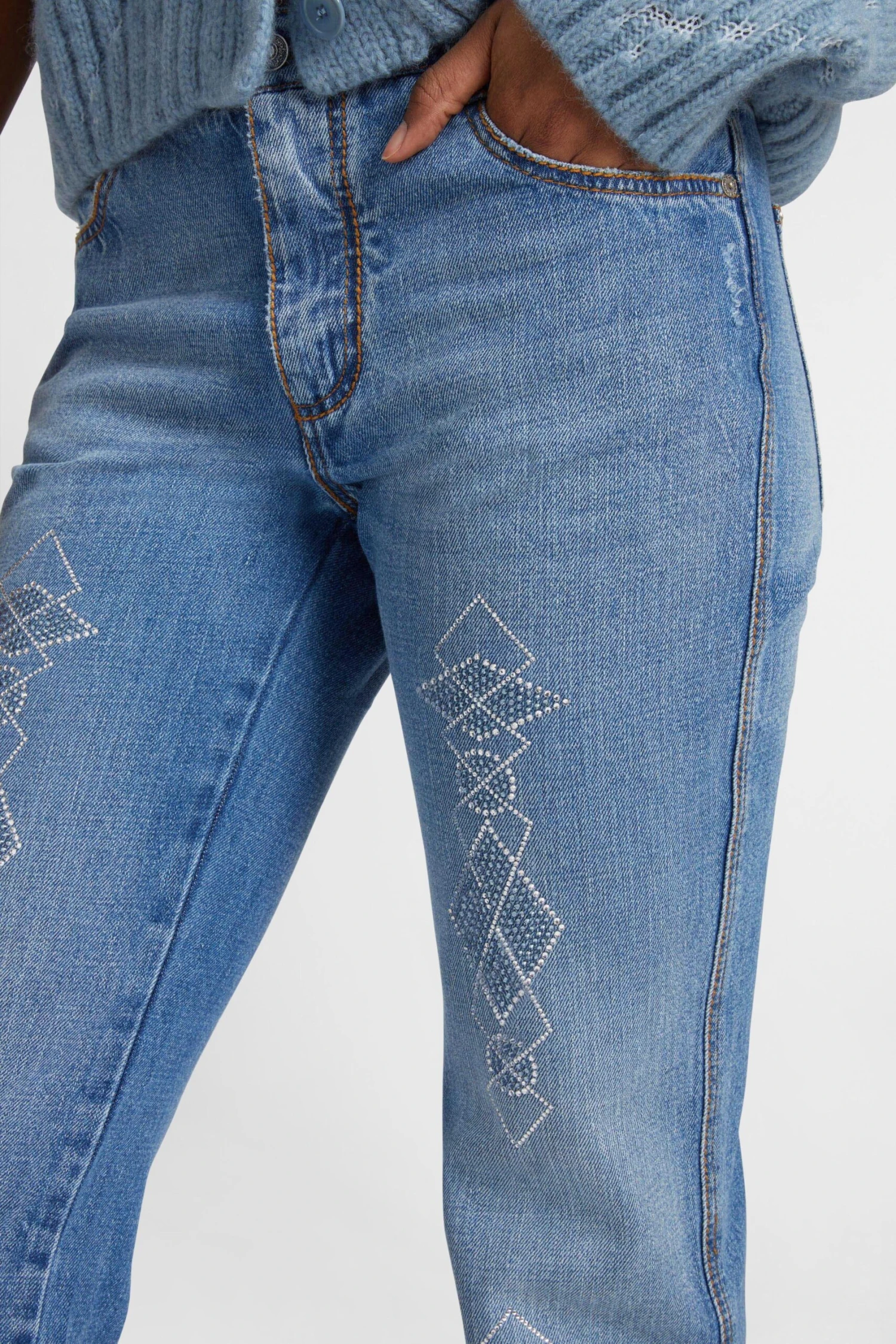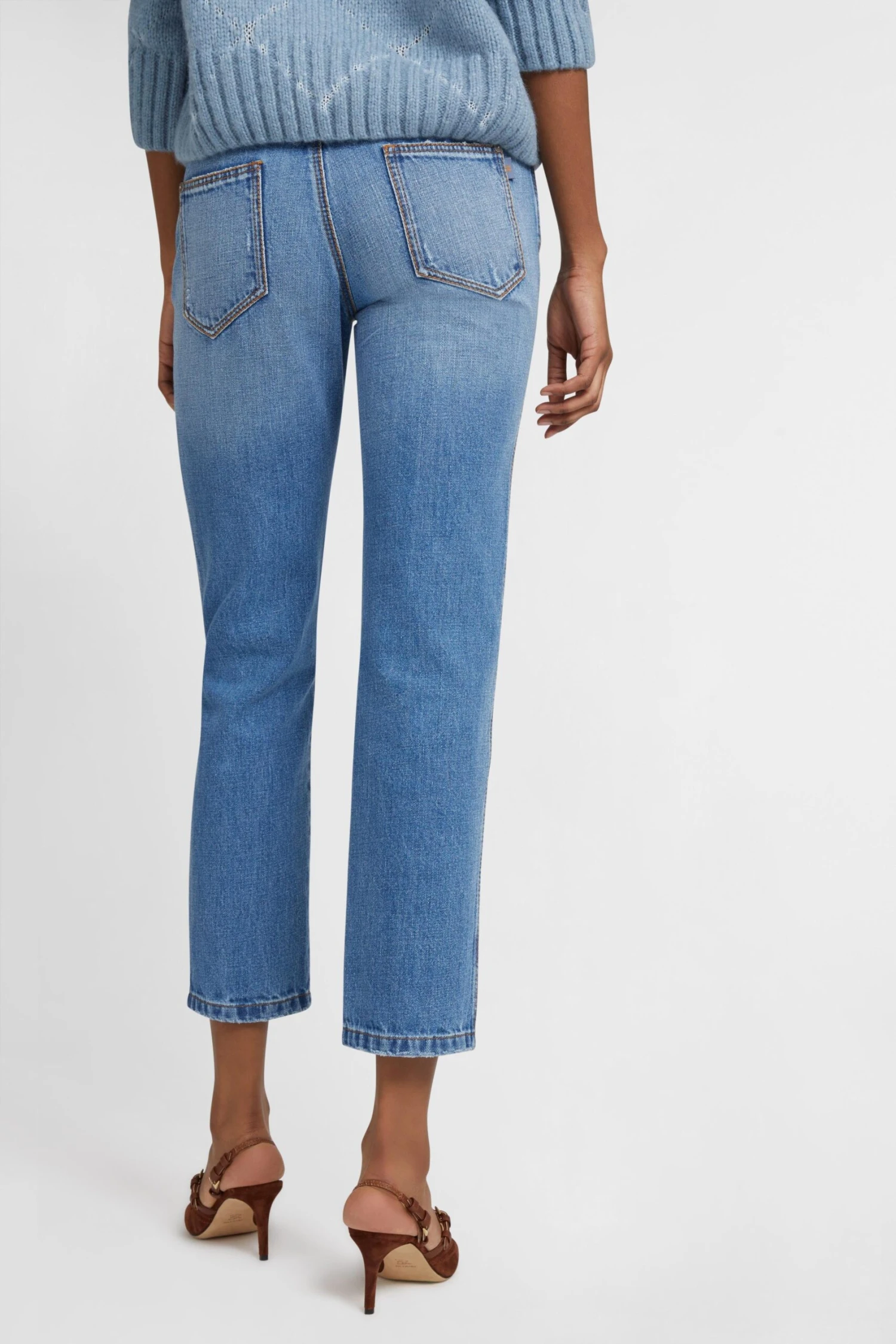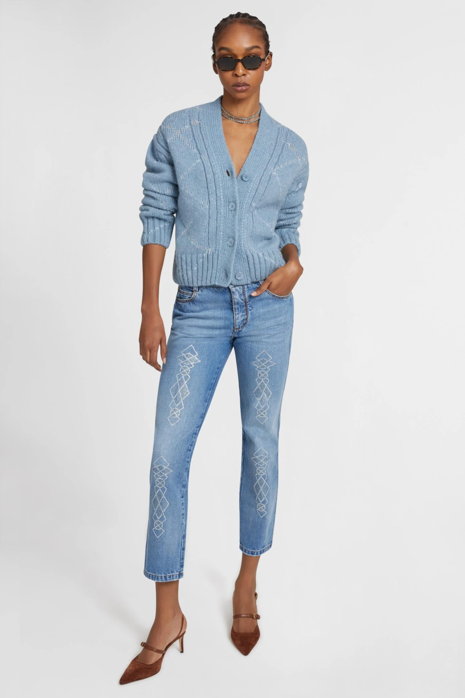 A tribute to light and craftsmanship: these five-pocket jeans reinterpret the classic model with a touch of pure magic. The high-quality denim, stiff at the right point, embraces the silhouette with sartorial rigor, while on the front an argyle motif comes to life composed of microcrystals, applied by hand to return luminous reflections with every movement. A garment that combines the essence of casual with a precious allure, perfect for those looking for a distinctive detail without sacrificing comfort.