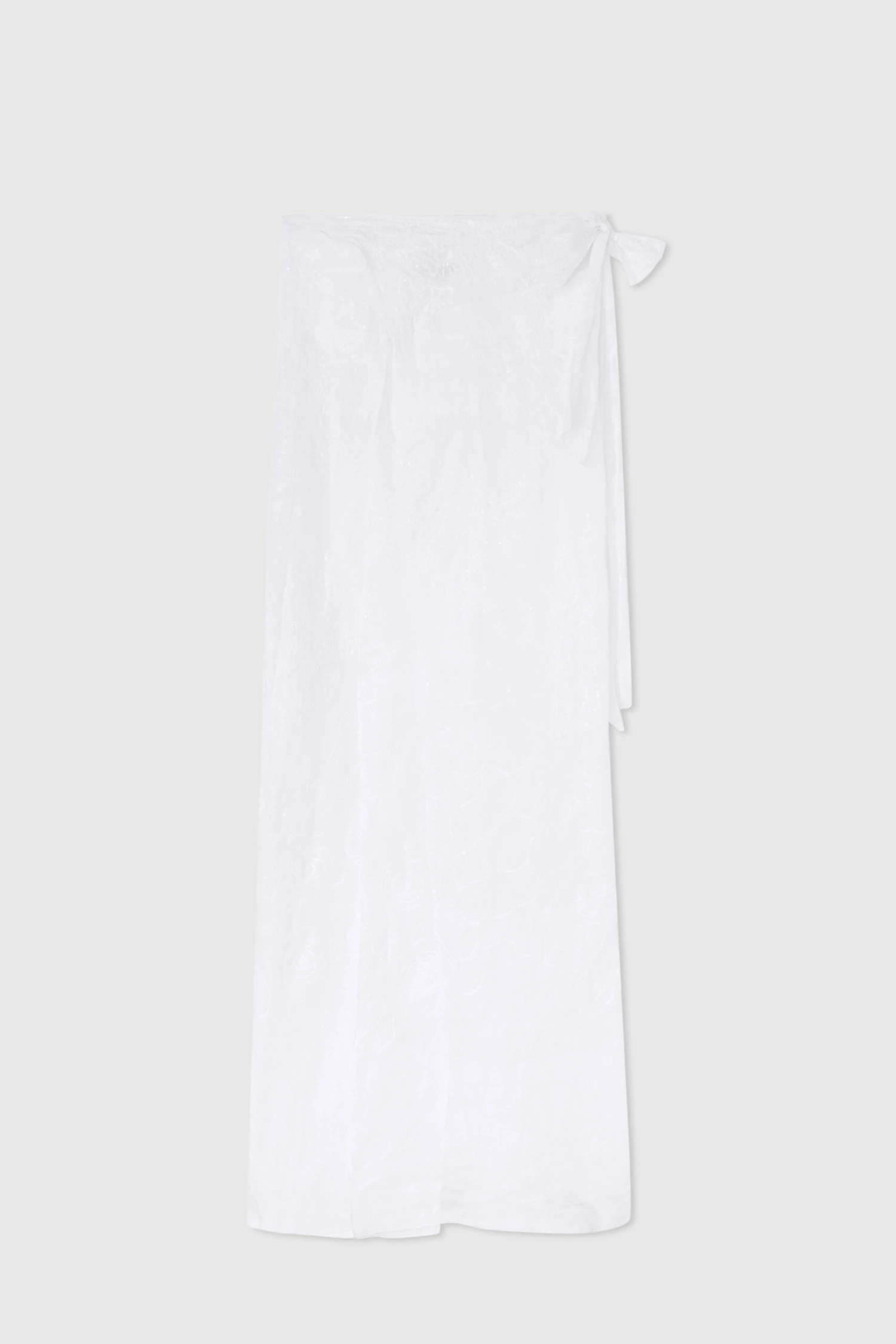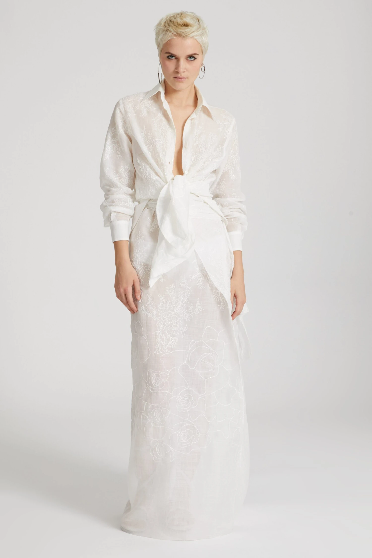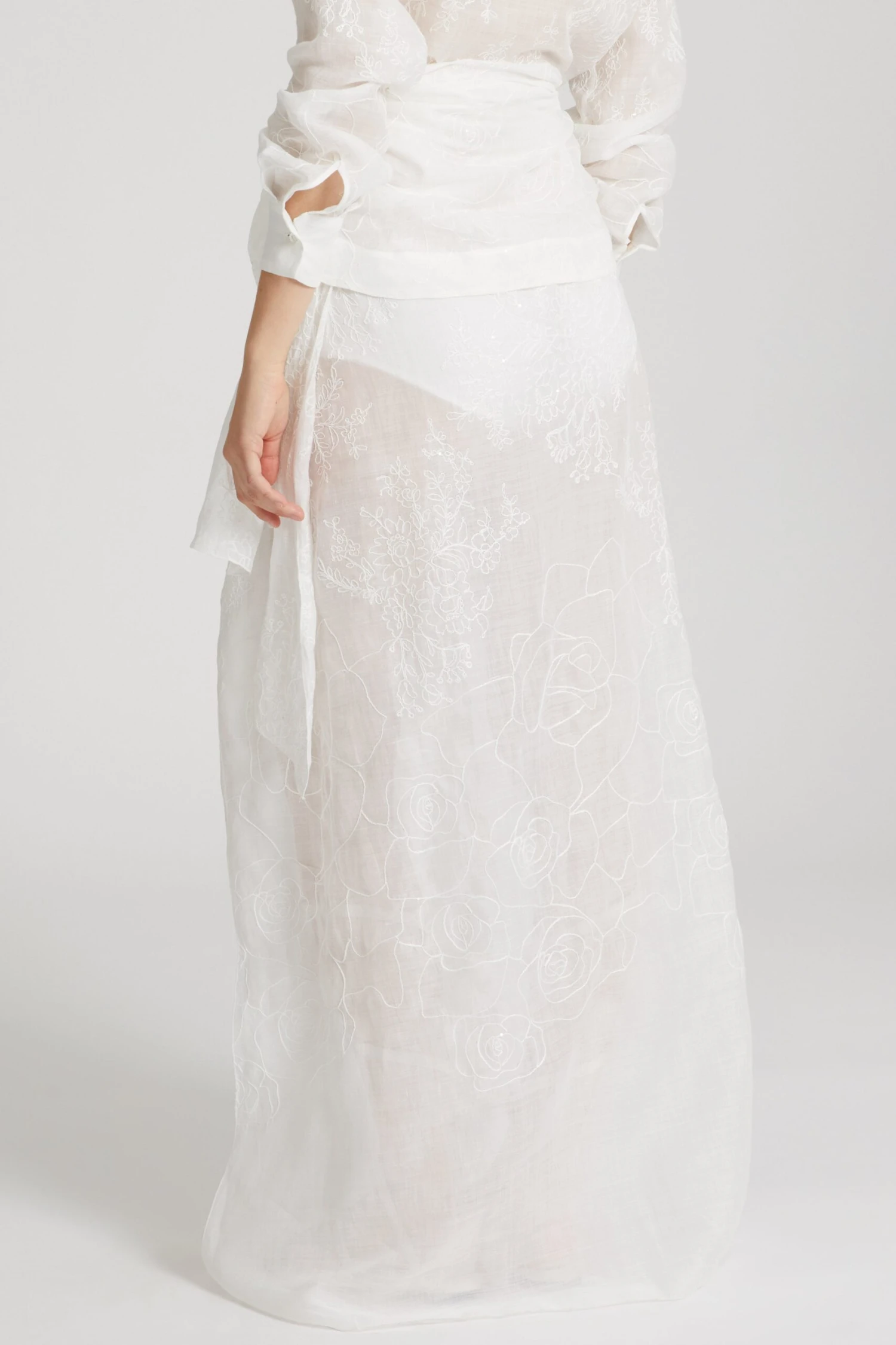 Pareo skirt in pure ramie, a natural white fibre, fine and lustrous like silk. The wallet-cut skirt fastens like a sarong, making a bow at the side. The garment is embellished with hand-made tone-on-tone embroidery, representing smaller flowers at the top and larger roses towards the bottom, to accentuate the volume.