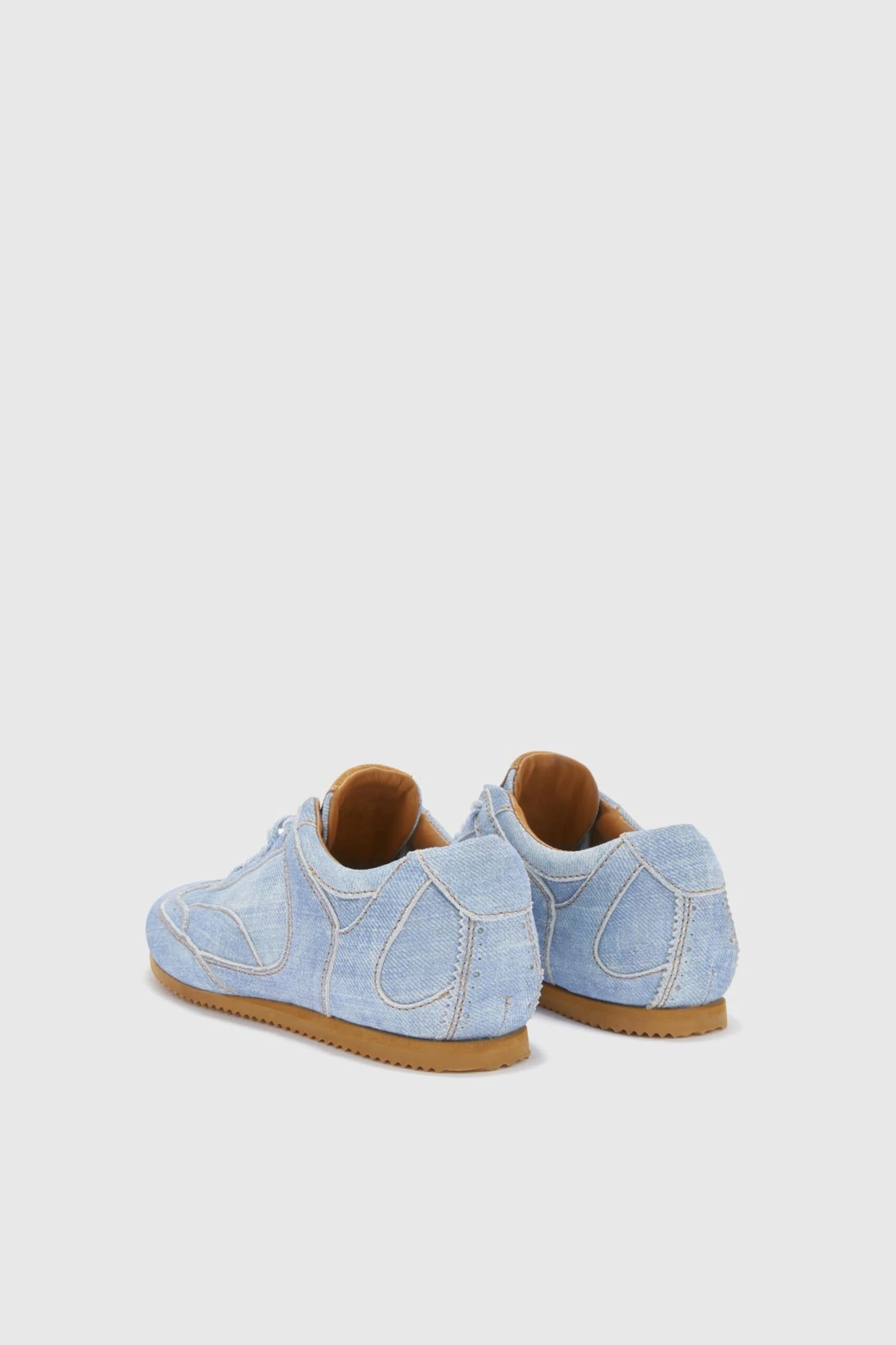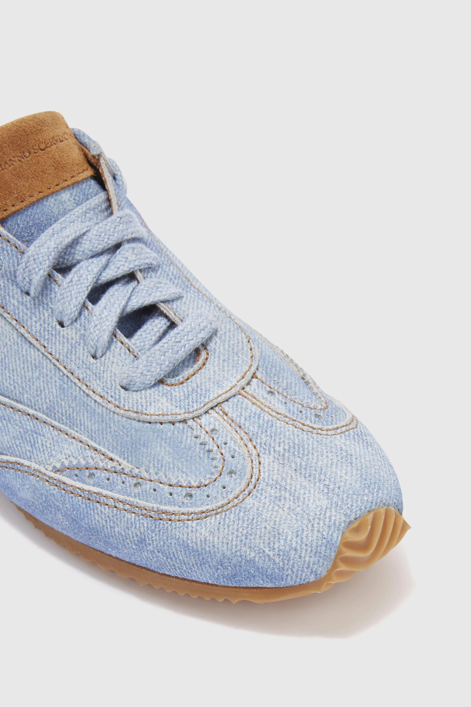This jeans print split leather Winner sneaker with amber rubber sole represents the perfect balance between style and comfort. Finished entirely by hand, the shoe stands out for the fine brogue motif on both the toe and heel, enriched by the swallowtail profile that gives it a luxurious and sophisticated character. The soft rubber of the bottom, combined with the padded insole, guarantees superior comfort throughout the day, making this sneaker an ideal choice for those seeking a casual but sophisticated look.