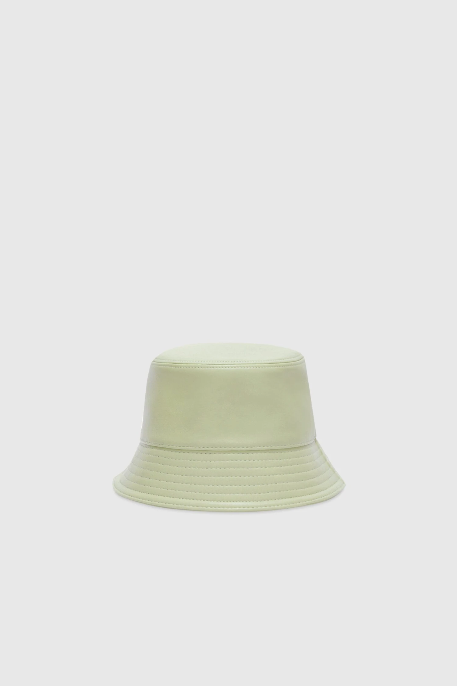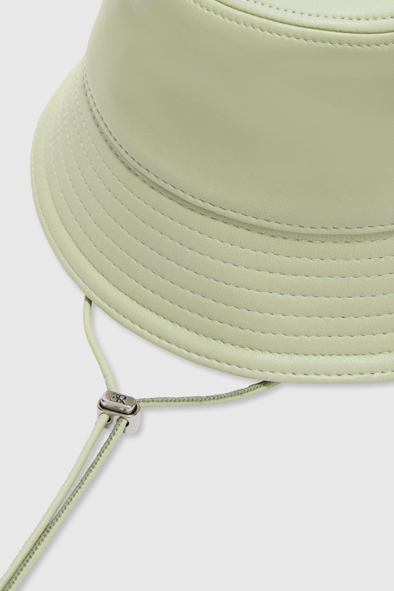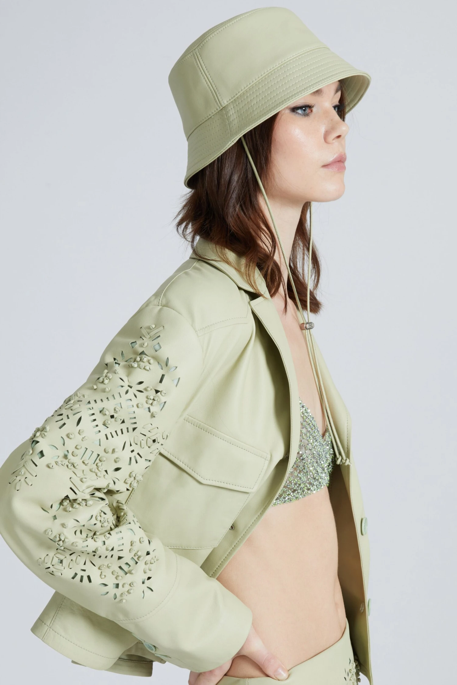 Lambskin bucket hat with adjustable leather ribbons on the side.