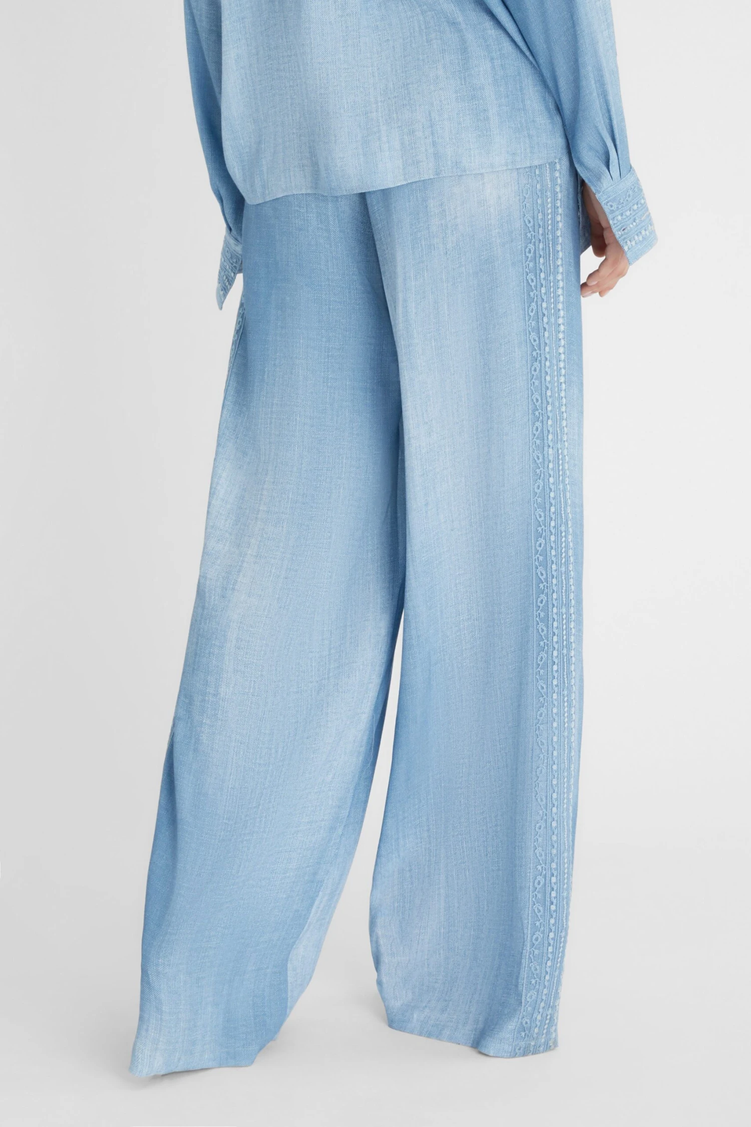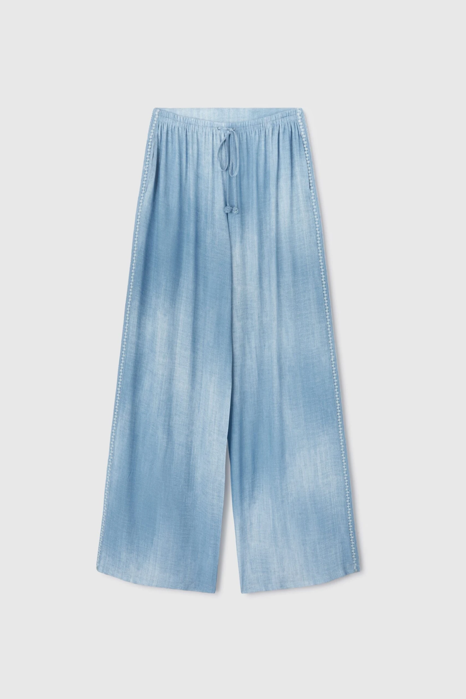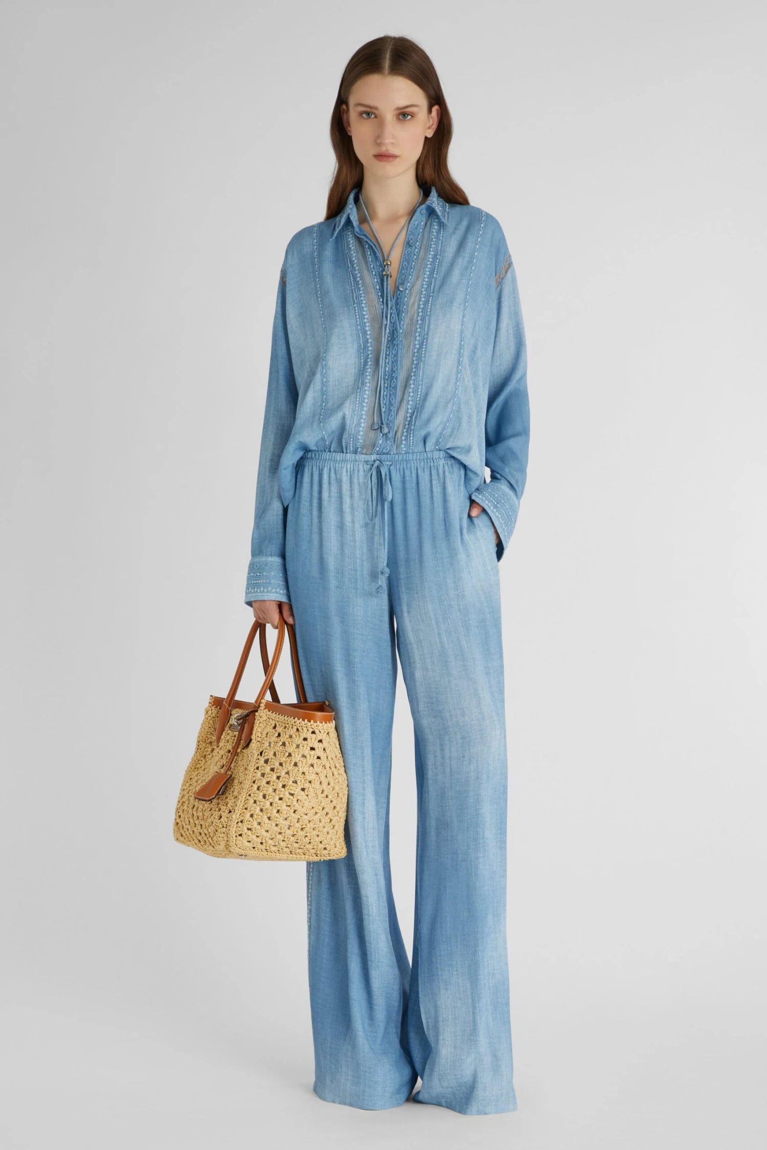 Palazzo trousers in our iconic marocain fabric with a light denim print, versatile in matching every look: perfect with a shirt for a chic pijama effect, but also with tops for a more everyday, casual look. The fit is comfortable thanks to the drawstring waist.
