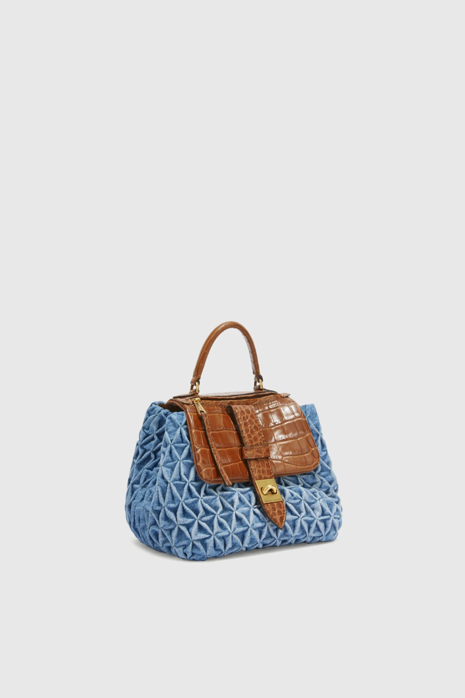 New Liza made with a double combination of materials: the body of the bag is in jeans with a special handmade smock stitch work, while the flap and handle are in crocodile print leather. The classic blue jeans fabric is treated with specific washes that make the canvas soft. The shades on the smock stitch work are handmade, making the bag unique. The top handle bag has a flap that functions as a zipped pocket and a personalised twist lock. The interior lining is in tone-on-tone split leather and there is a detachable leather shoulder strap. Measurements: 20*21*18.