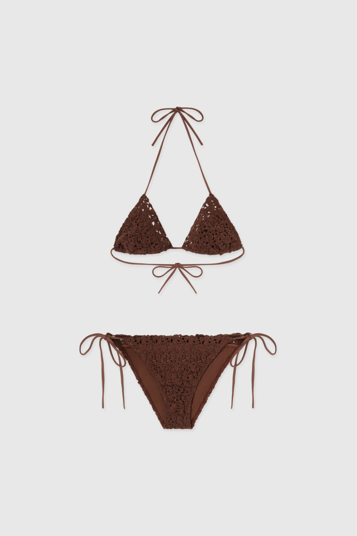 Bikini consisting of a triangle bra and regular briefs with fine ties. The swimming costume is made entirely of macrame lace in cappuccino colour.