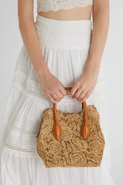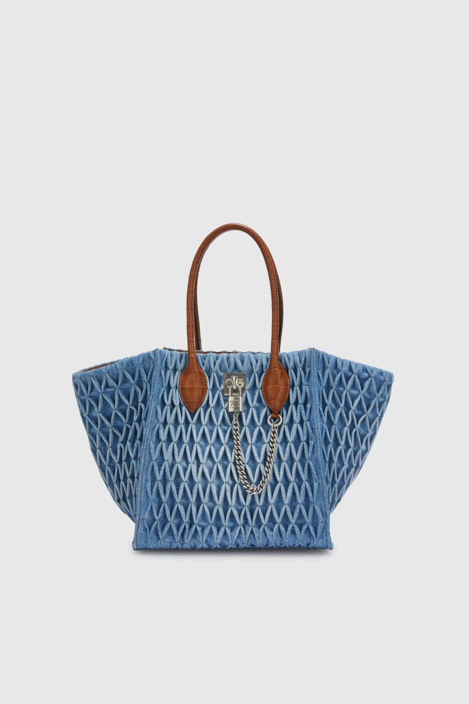 Maggie Media with a double combination of materials: denim on the body and crocodile-print leather on the handles. The denim canvas undergoes a treatment that makes it soft to the touch, while the aged effect is handcrafted and emphasises the handmade smock stitch work. The fastening is personalised and features a logoed lobster clasp with a metal chain, as do the feet that protect the bottom. Lining, pockets and details are in leather, as is the detachable shoulder strap. Measurements: 25*25*10