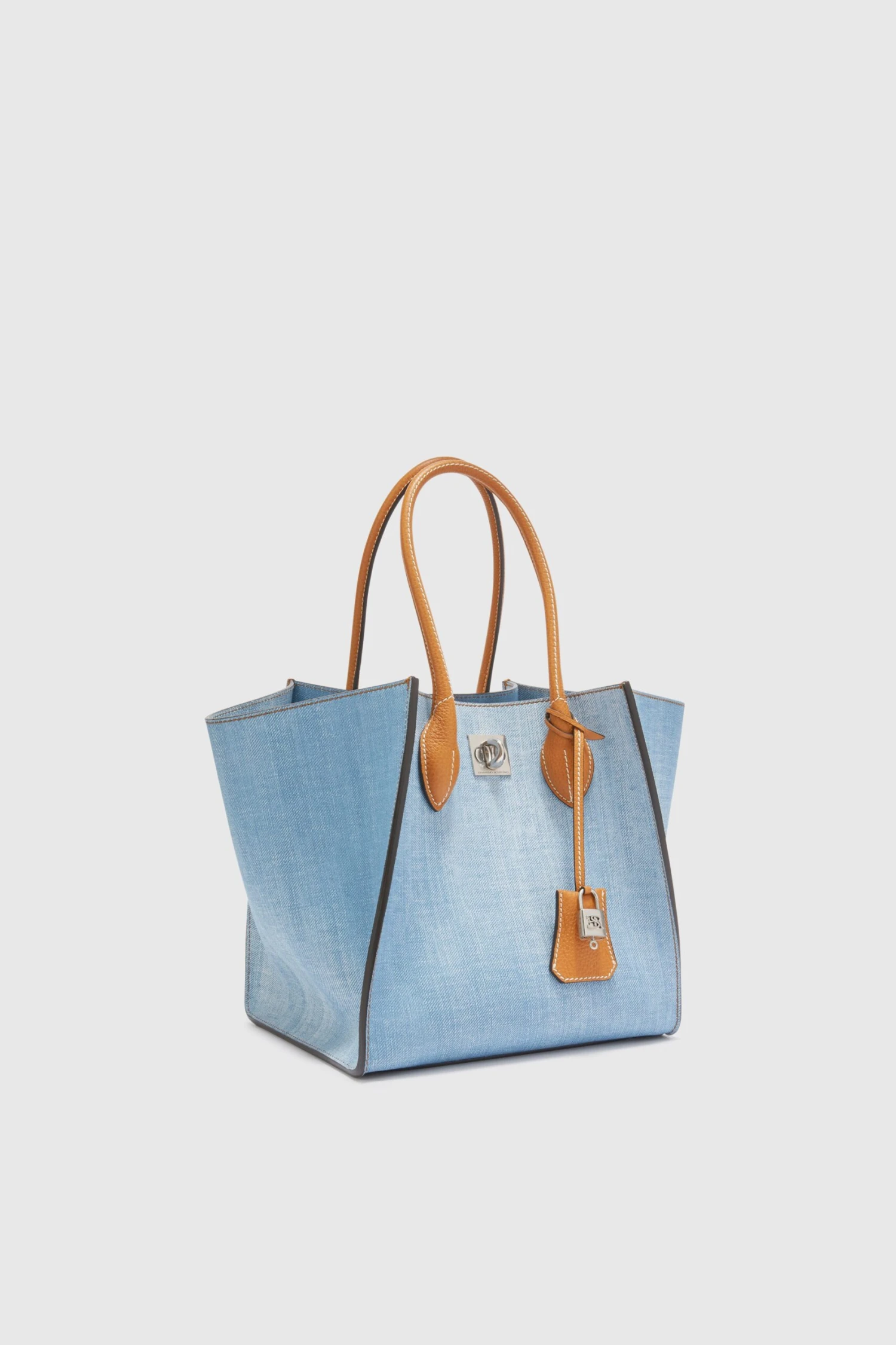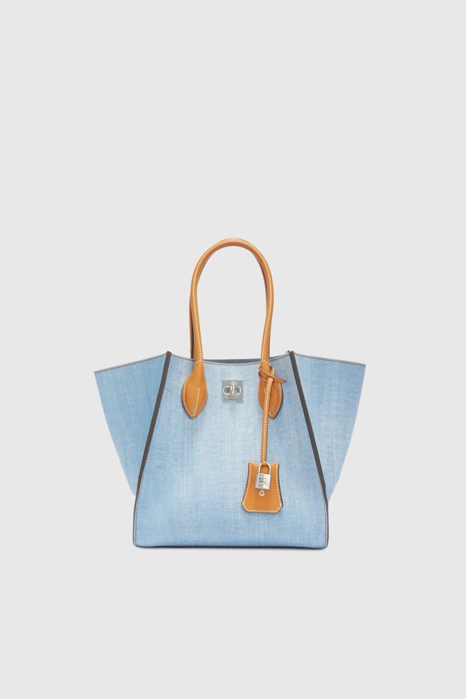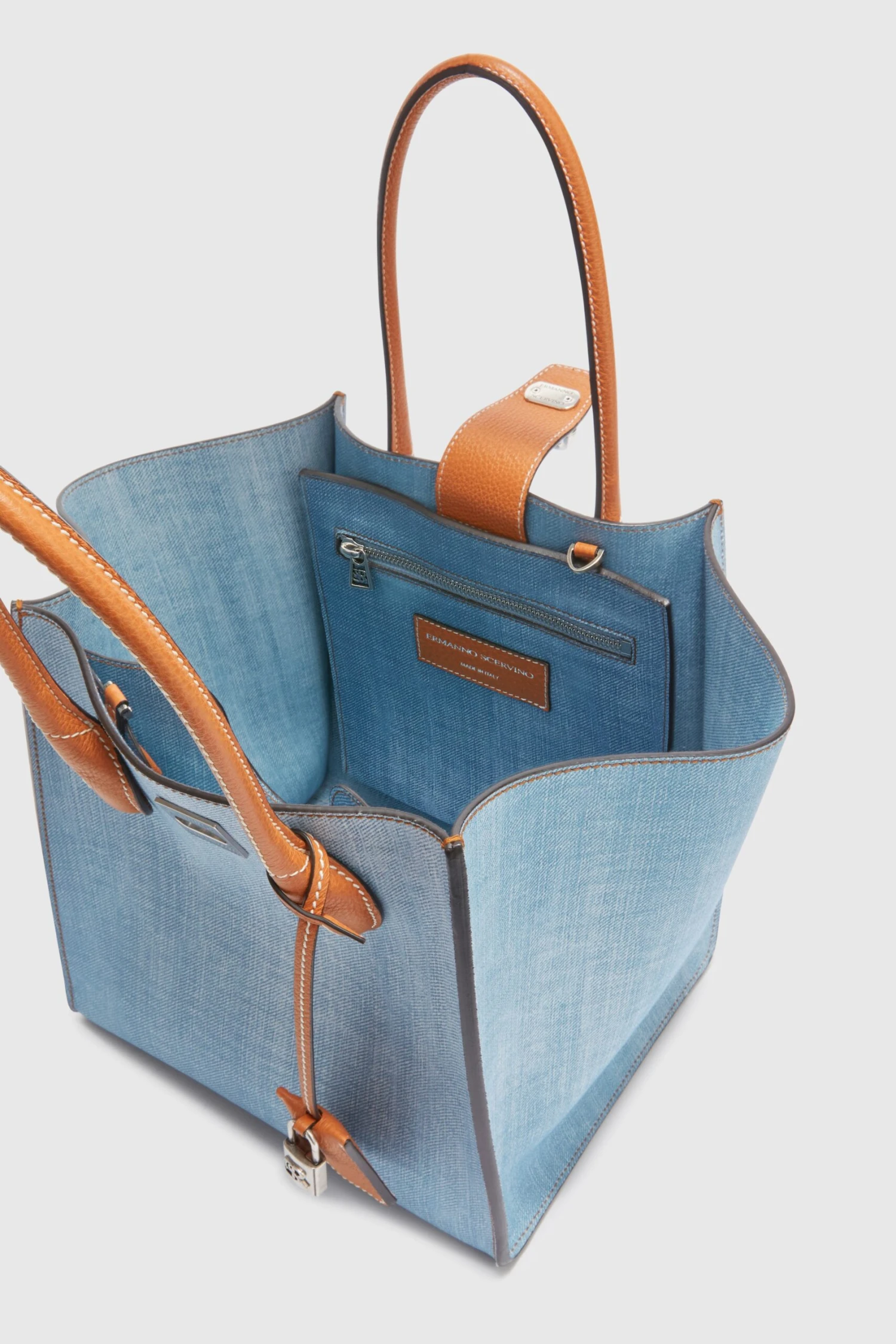 Maggie medium with double handle and made of marocain jeans print, both internally and externally. The closure of the bag is branded and has a carabiner lock with metal logo; the feet on the bottom are metal, while the internal pockets, leather inserts and service shoulder strap are in leather. The iconic marocain jeans print Ermanno Scervino is a contemporary tribute to the classic texture of denim. The jeans print on viscose offers a fluidity and lightness that reinterpret the traditional look of jeans in a modern and sophisticated way. The dimensions are 25*25*18.