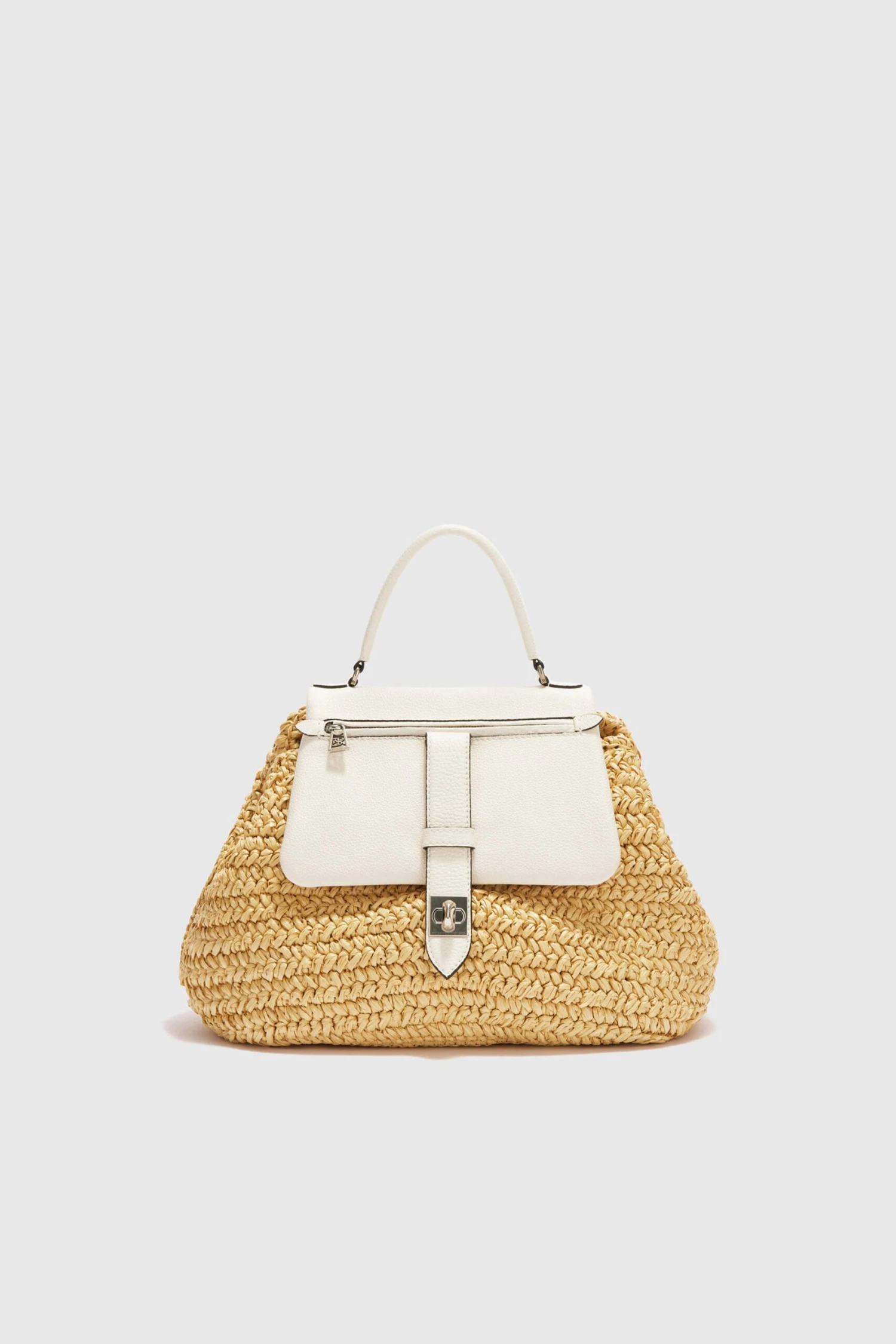 Medium Liza with entirely hand-woven raffia body and flap that functions as a zipped pocket. Closure with personalised swivel; single handle and shoulder strap in the same material as the flap. The interior lining is in rafia matting. The bag is embellished with floral embroidery made by hand with woven rafia threads. The measurements are 33*20*19.