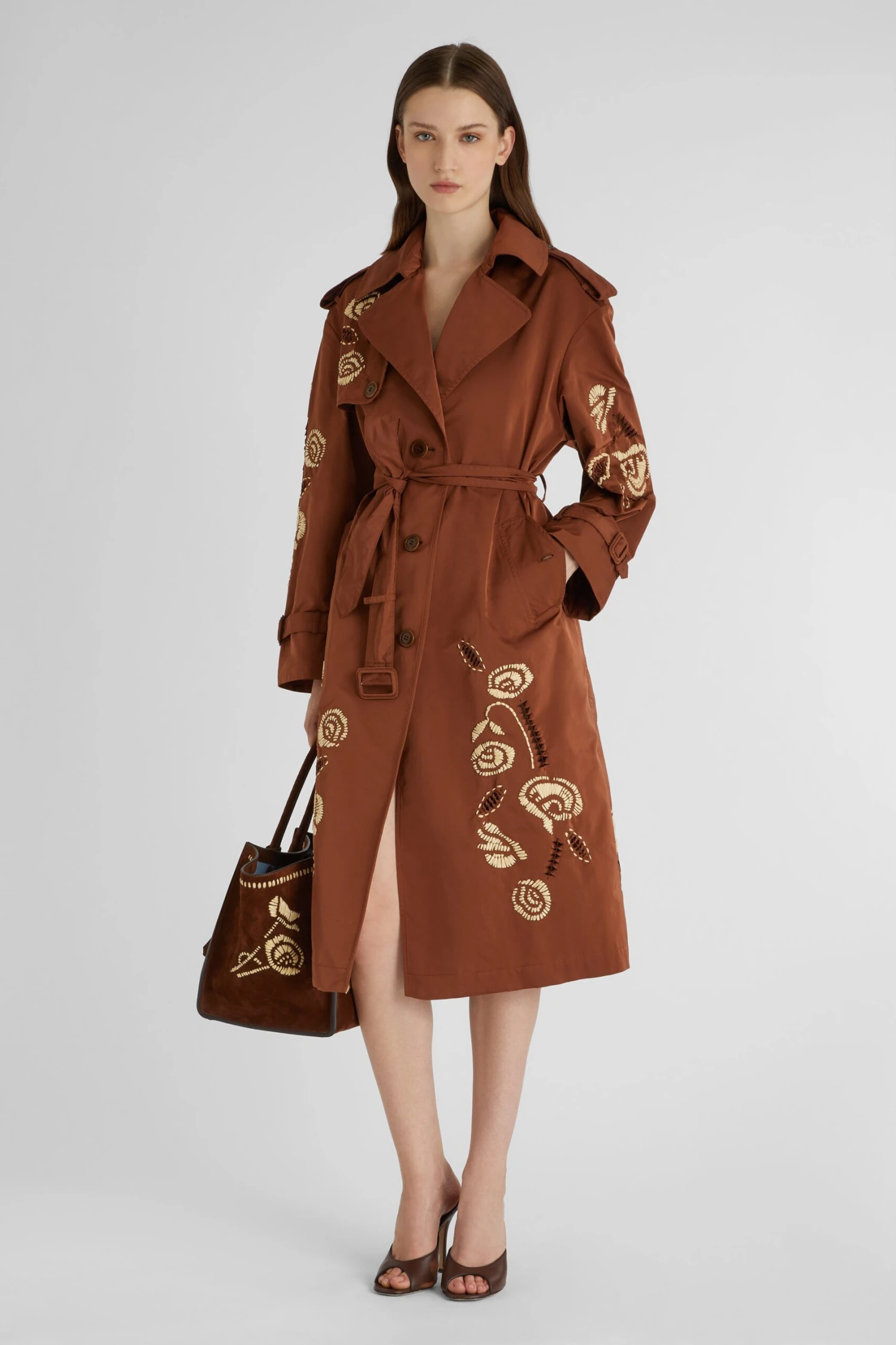 ERMANNO SCERVINO Midi Trench Coat In Technical Fabric With Handmade Embroidery