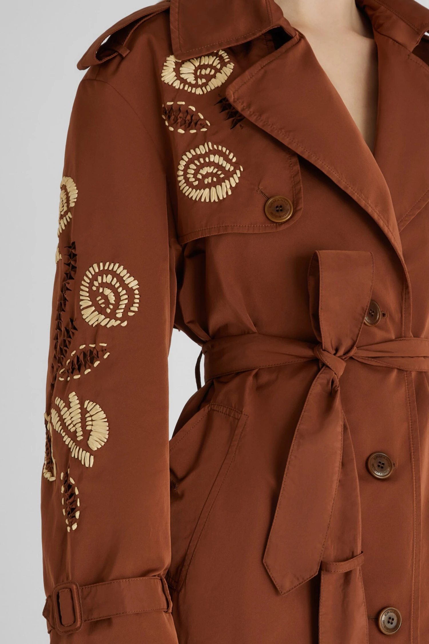 Single-breasted trench coat in waterproof technical fabric with tone-on-tone summarys and waist belt, made in the same material as the garment. The trench coat is embellished with rafia and cut-out floral embroideries handmade by our craftsmen. The embroideries are placed on the sleeves, on the front and on the cape at the back. The cuff of the sleeve can be adjusted thanks to the tone-on-tone loop.