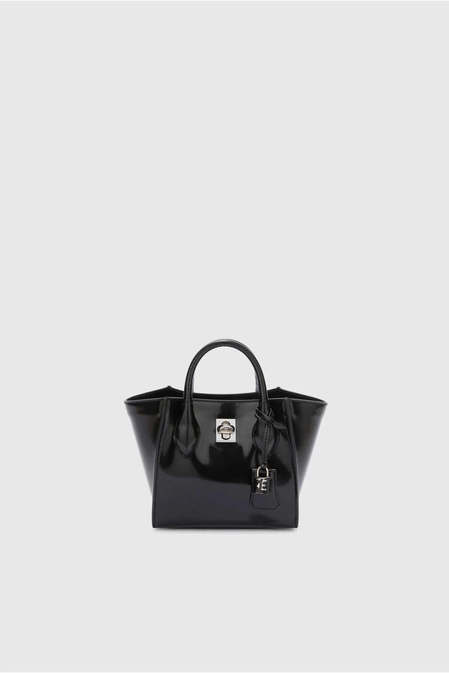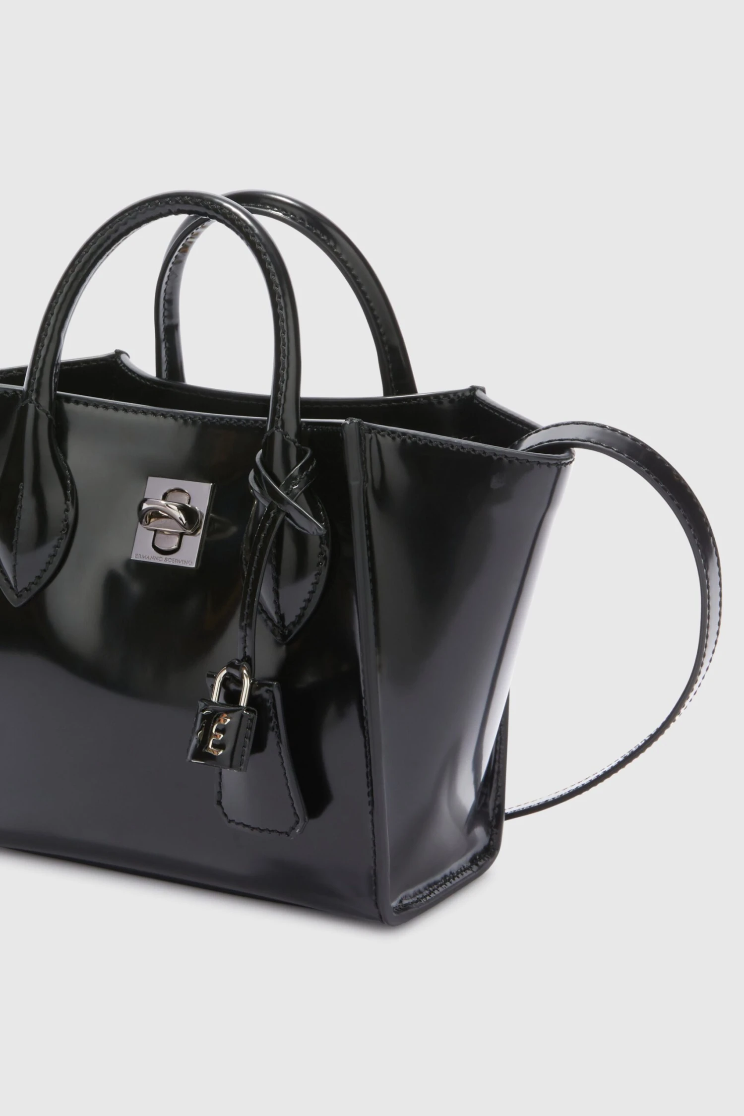 Mini Maggie in brushed calfskin with double handle and matching crust interior. The closure is personalised with a logo-embossed padlock, while the bottom has metal feet. Detachable leather shoulder strap. The dimensions are 19*17*10.