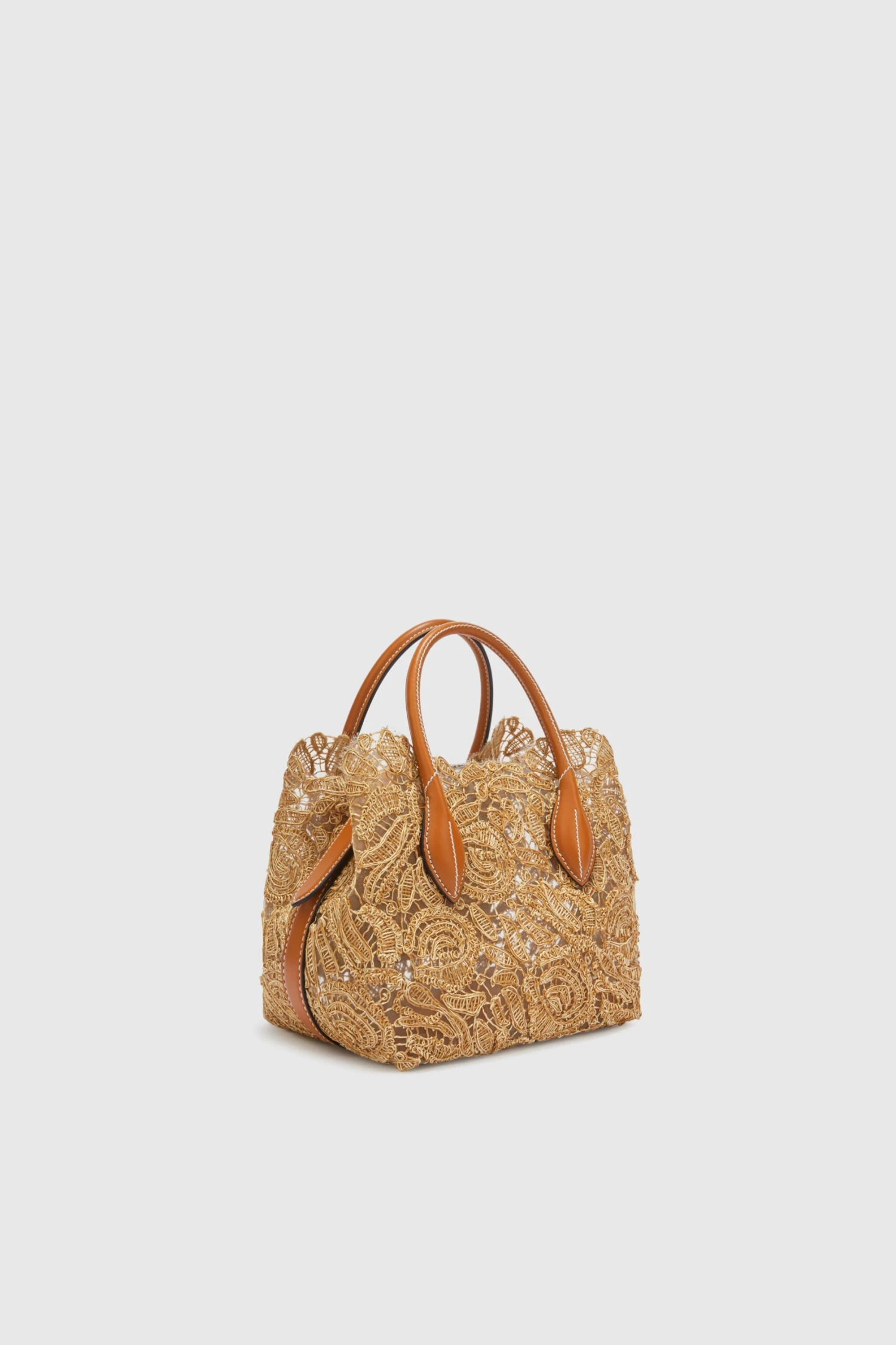 Mini Margot in rafia lace, unlined and with leather handles. The internal pocket is in lace like the outside of the bag, while the closure is branded and has a snap-hook padlock with logo. This season’s rafia lace features an exclusive design with poppies. In this case, rafia, a material chosen for its strength and unique texture, gives the lace a distinctive and natural look. The natural variant is particularly fascinating, created by intertwining two rafia threads of different shades, one darker and one lighter. This contrast of colors emphasizes the beauty of the floral motifs and adds depth to the design, allowing the poppies to emerge from the background. The dimensions are 21*22*17.