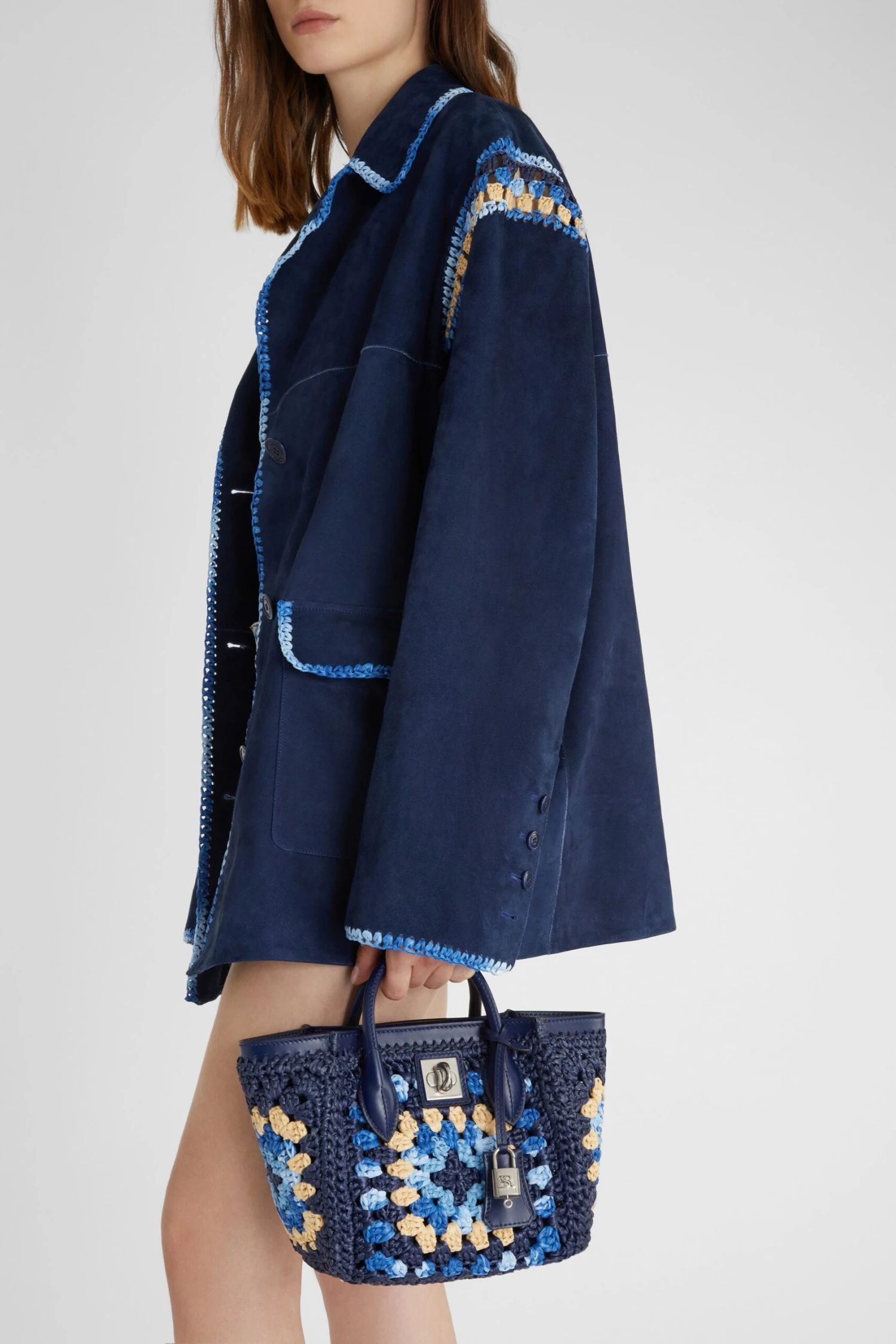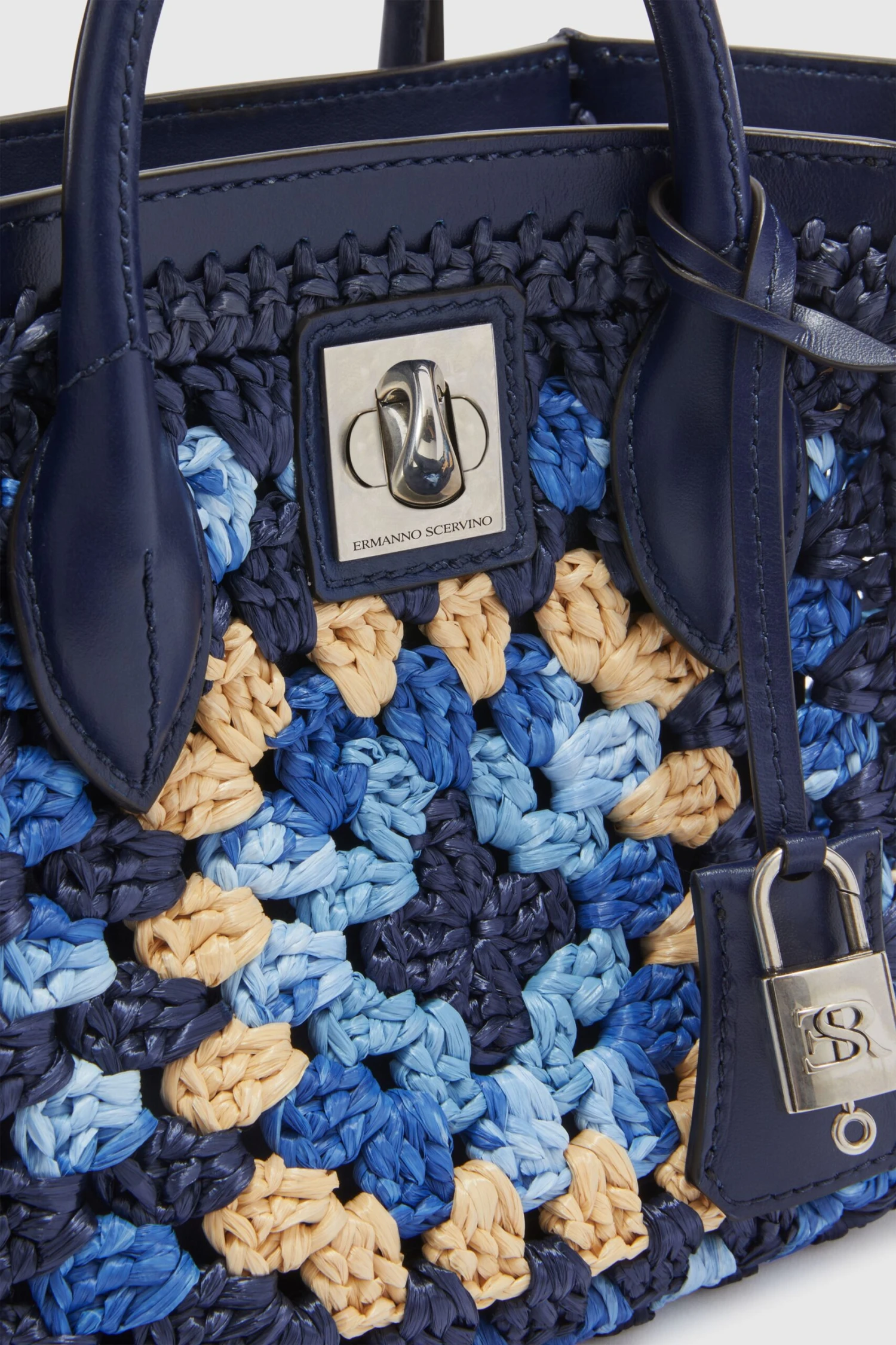 Mini bag with double handle, unlined and shell made of natural rafia with crochet weave. The closure is branded and has a snap-hook padlock with logo; the feet on the bottom are metal, while the pockets, inserts and shoulder strap are leather. The crochet weave in rafia used this season is a refined technique made by hand. This weave uses the “high mesh” stitch, which creates a three-dimensional texture and a visual effect of great impact. Multicolor rafia offers a sophisticated play of colors and a stylistic versatility that adapts to different occasions. The dimensions are 19*17*10.