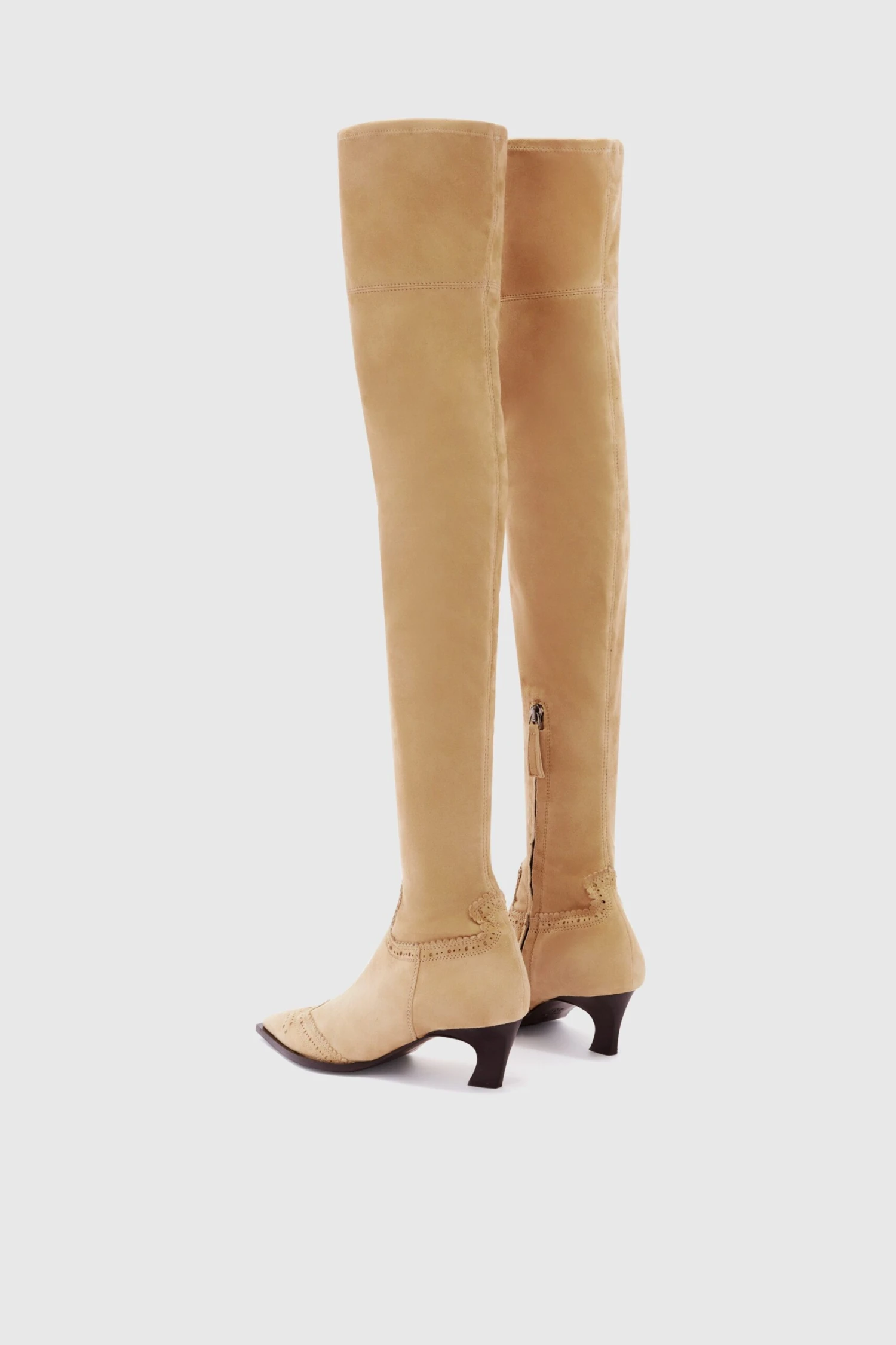 New over-the-knee Texan in stretch suede with a perforated toe and decorated with a rounded hem. The closure consists of a hidden zip on the inside. The 5cm comma heel is very particular.