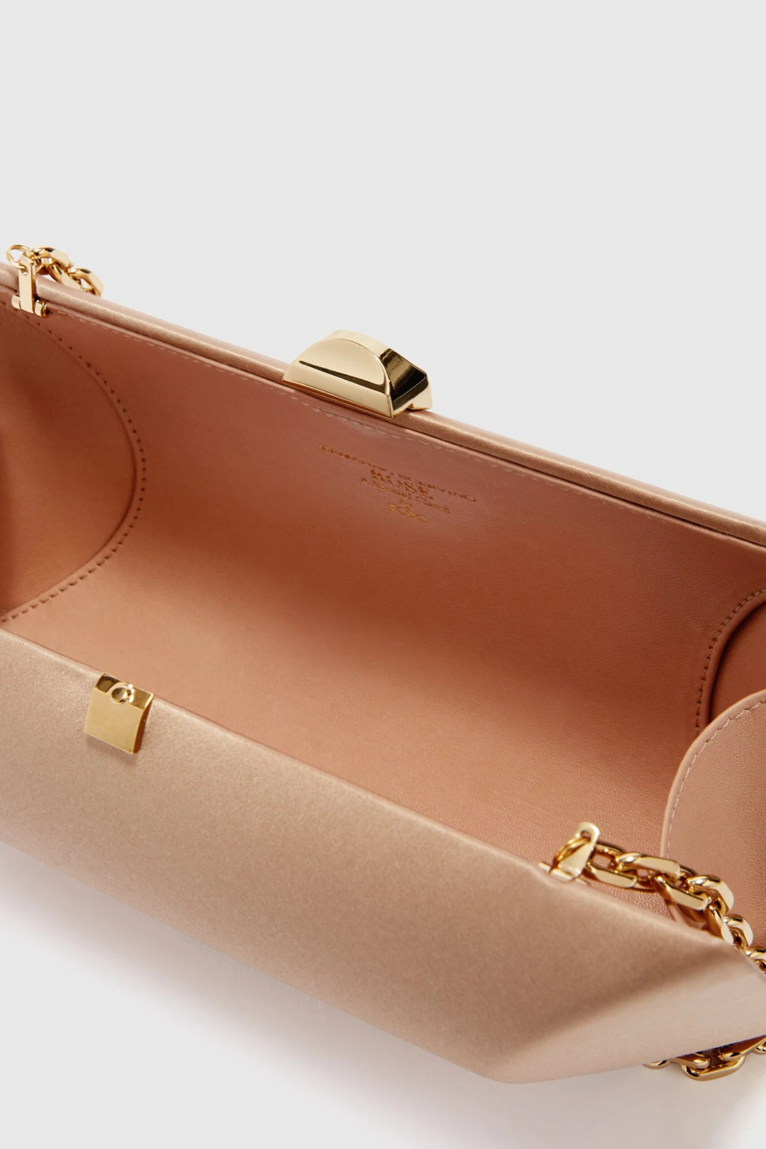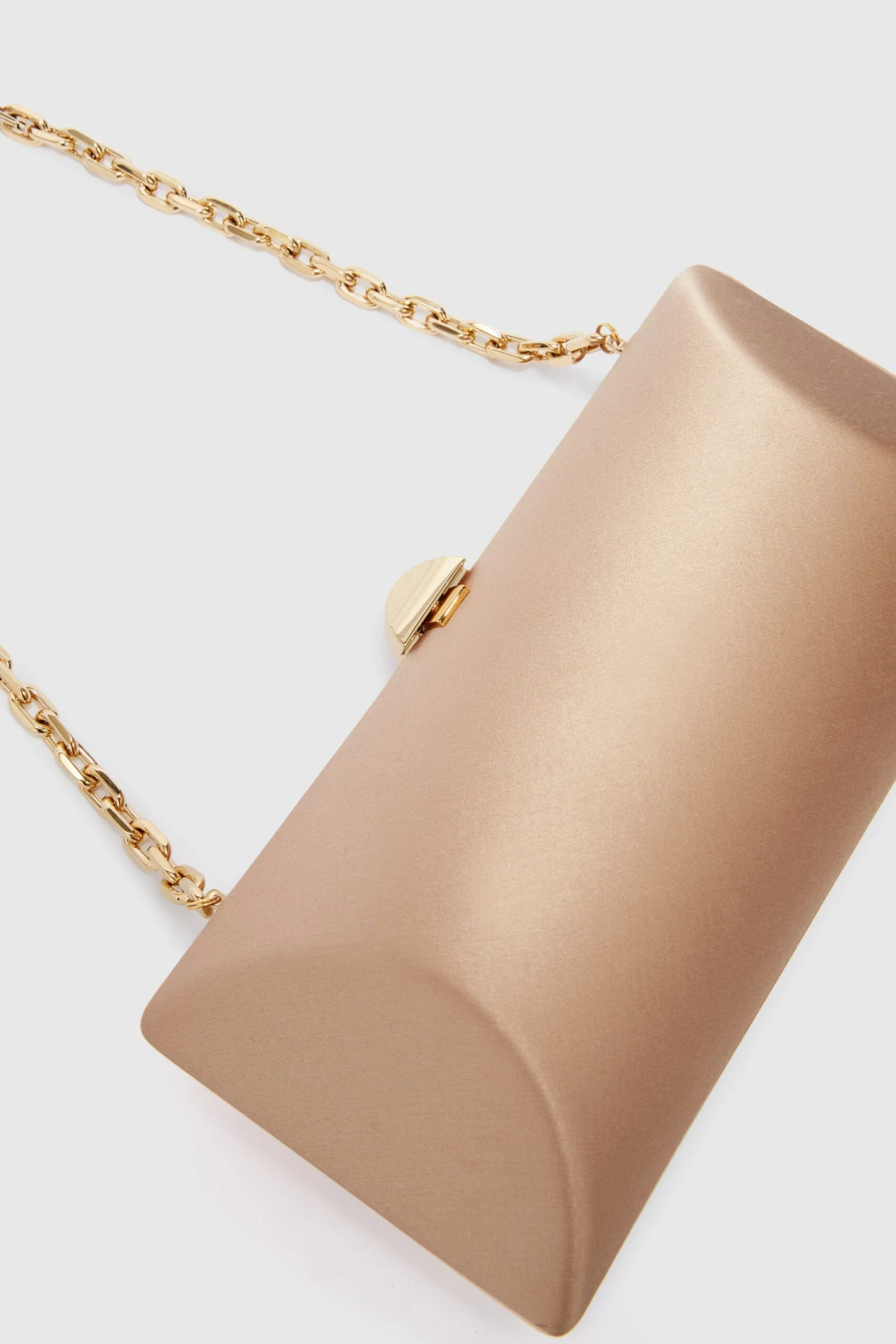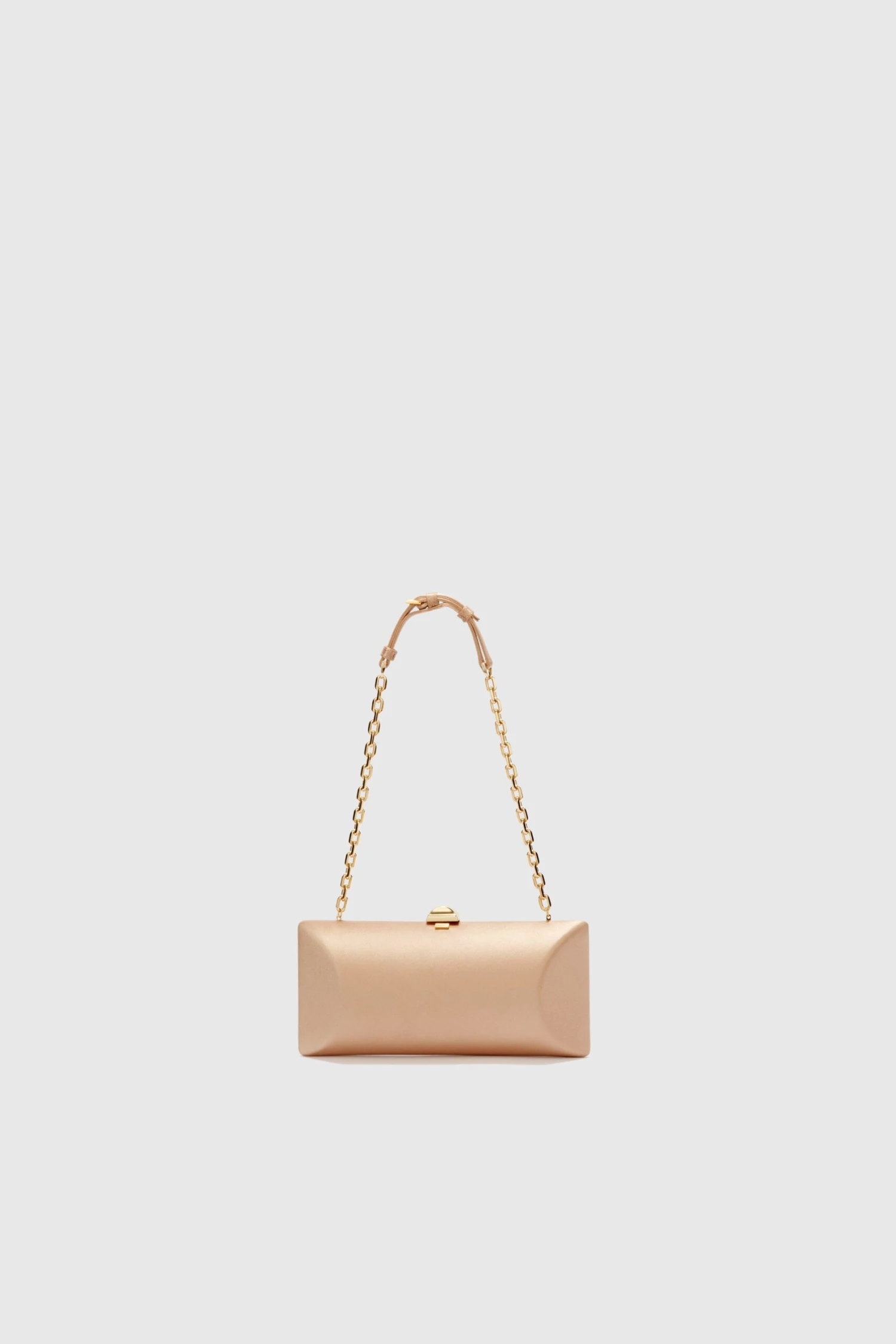 Ermanno Scervino presents Rose, the new rigid clutch with a rectangular shape flared at the sides, inspired by the silhouette of a baguette. The clasp features a logo-embossed metal skip, adding a touch of sophistication and security. The dimensions are: 22*10*7.