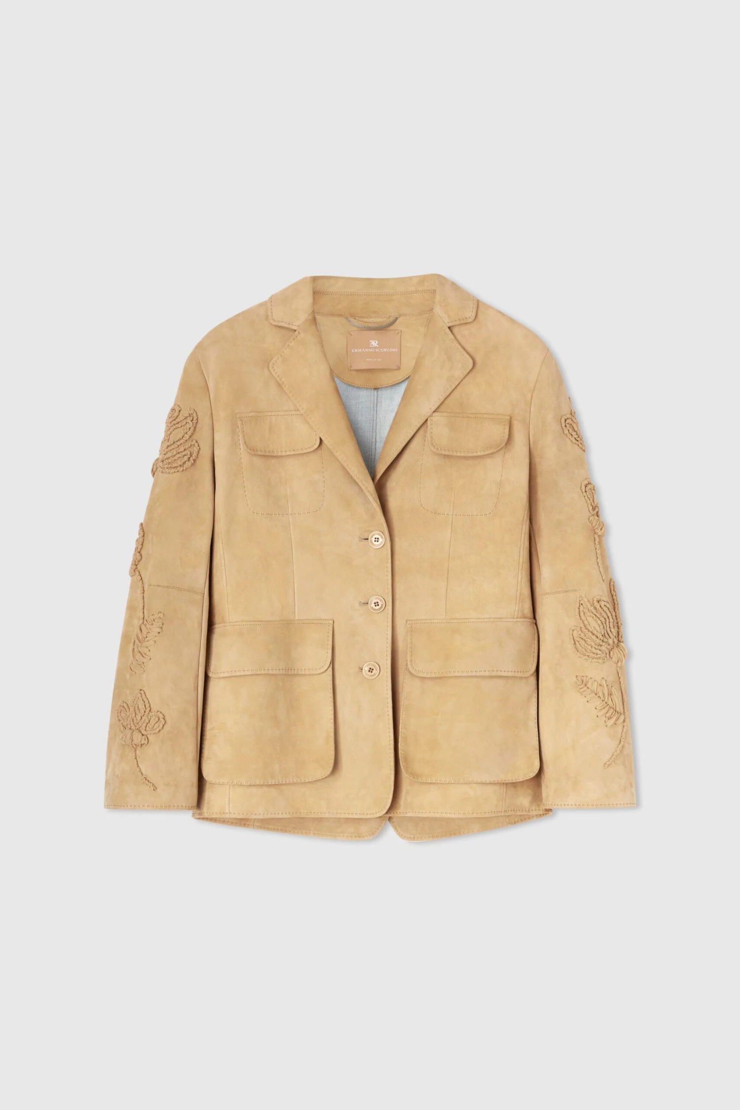 ERMANNO SCERVINO Nuvolato Suede Single-breasted Sahariana With Handmade Floral Embroidery On The Sleeves.