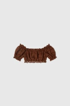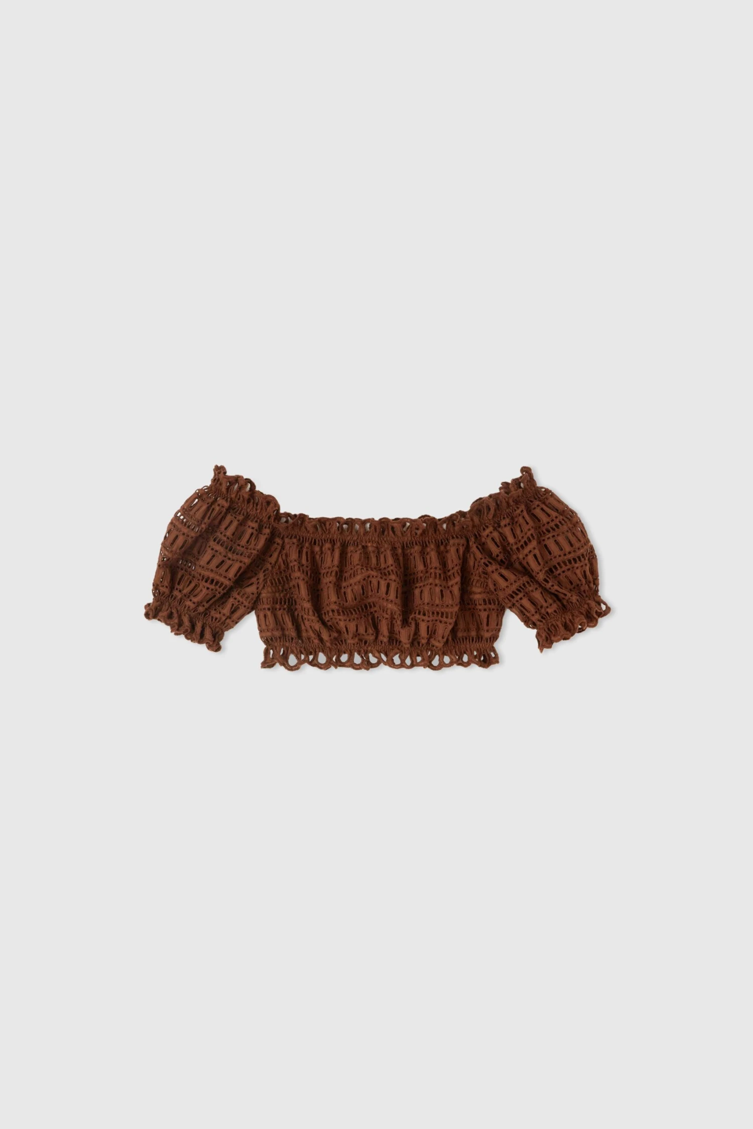 Off shoulder top with slightly puffed sleeves. The garment features an unusual sangallo geometric pattern with an all over a jour effect.