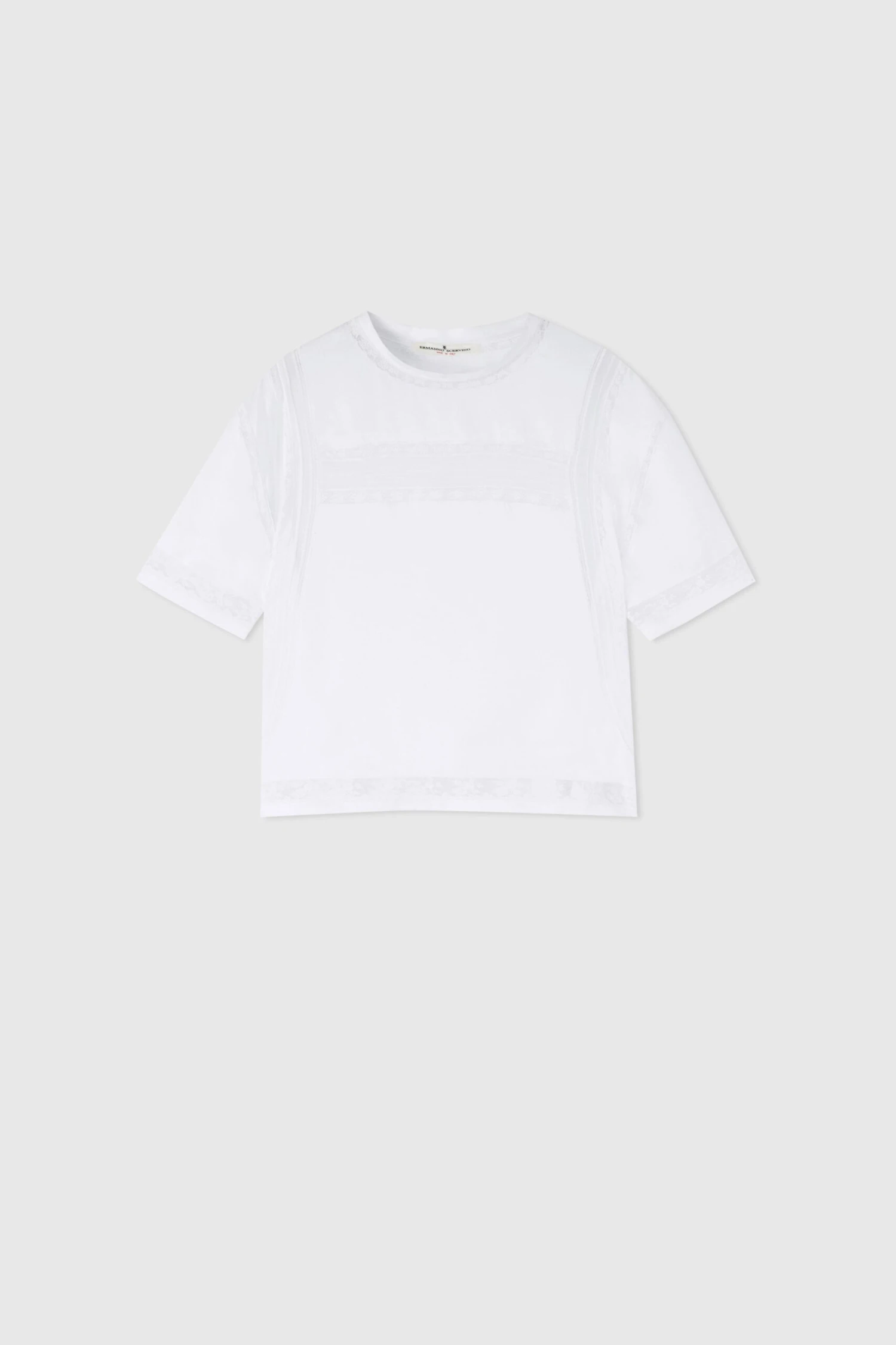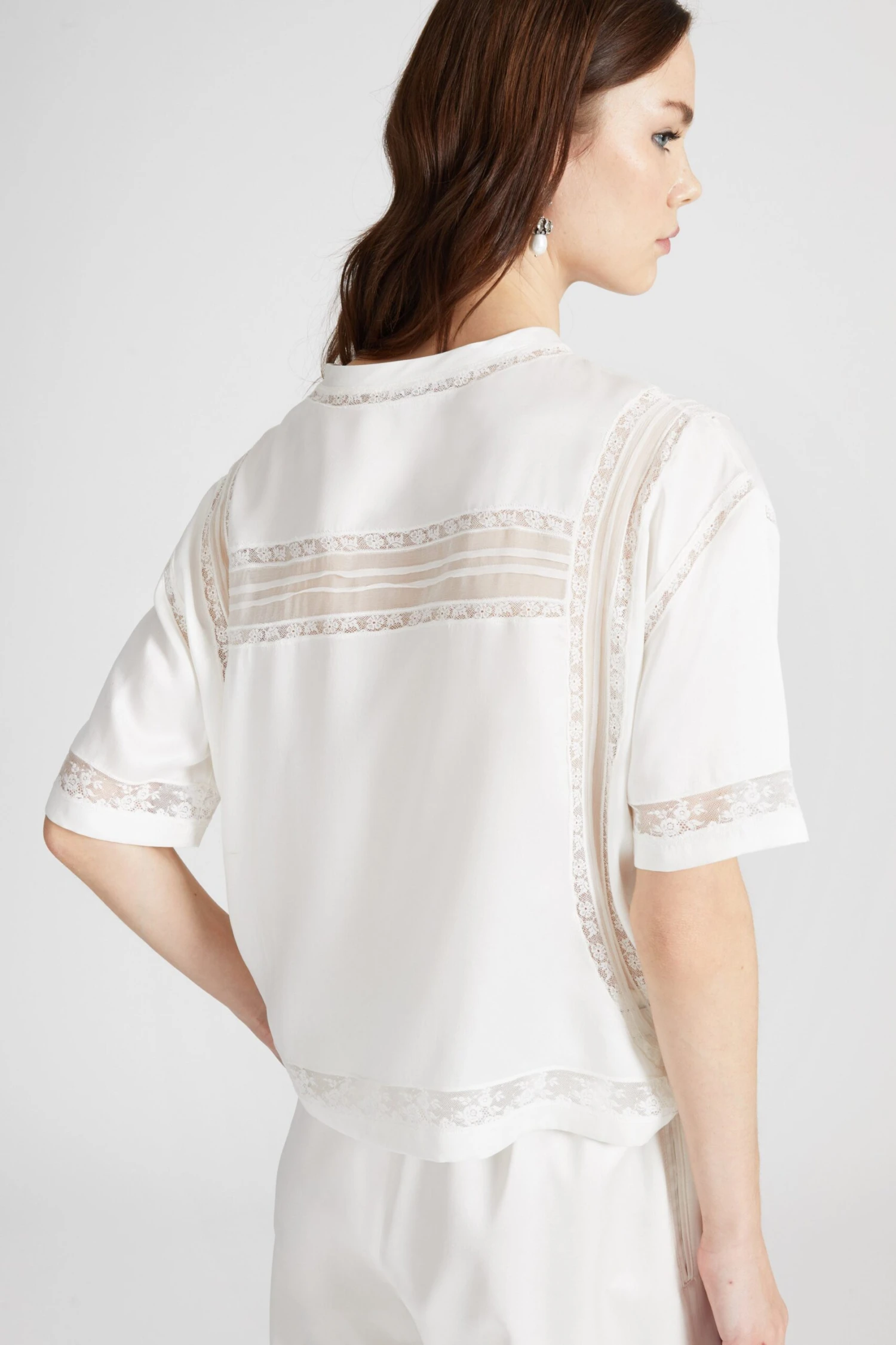 Oversize T-shirt in pure silk with half sleeves and an even neckline. Making the garment precious are the numerous tone-on-tone details of Valencienne lace, which are found at the sleeves and shoulders, but also on the edge of the collar and on the front and back.
