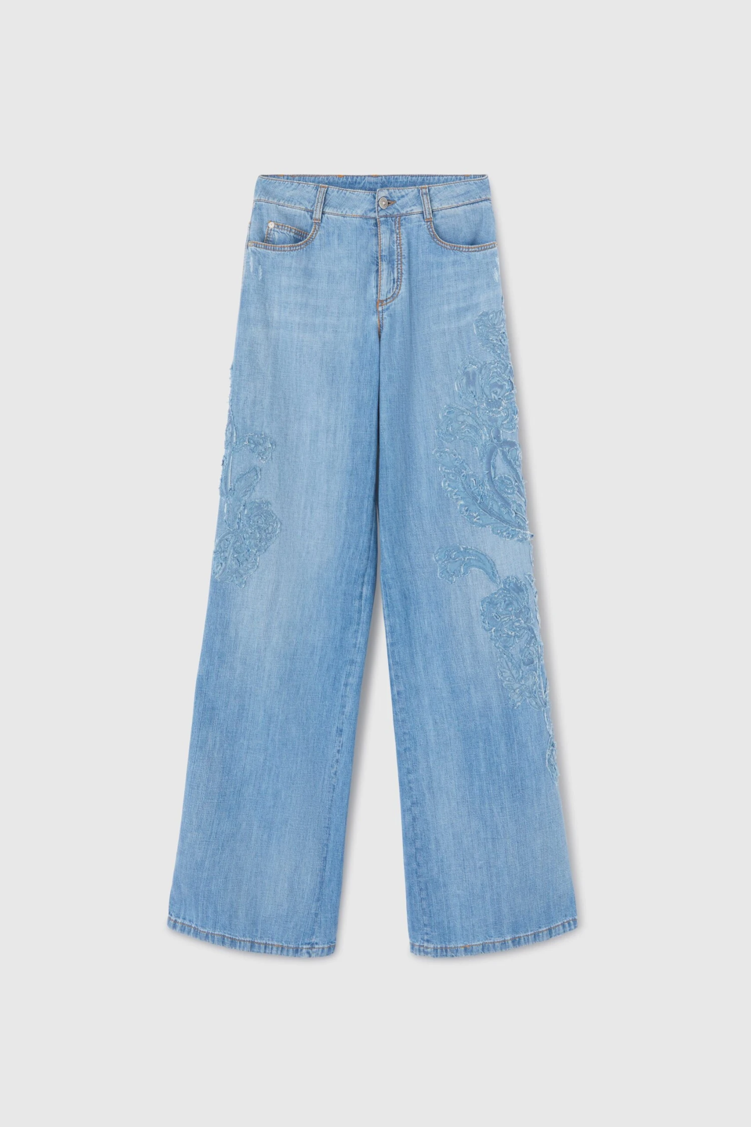 Palazzo jeans with a light feel and regular waist. The denim lace detail made entirely by hand and placed on the side is very particular, to accentuate the slender effect of the leg.