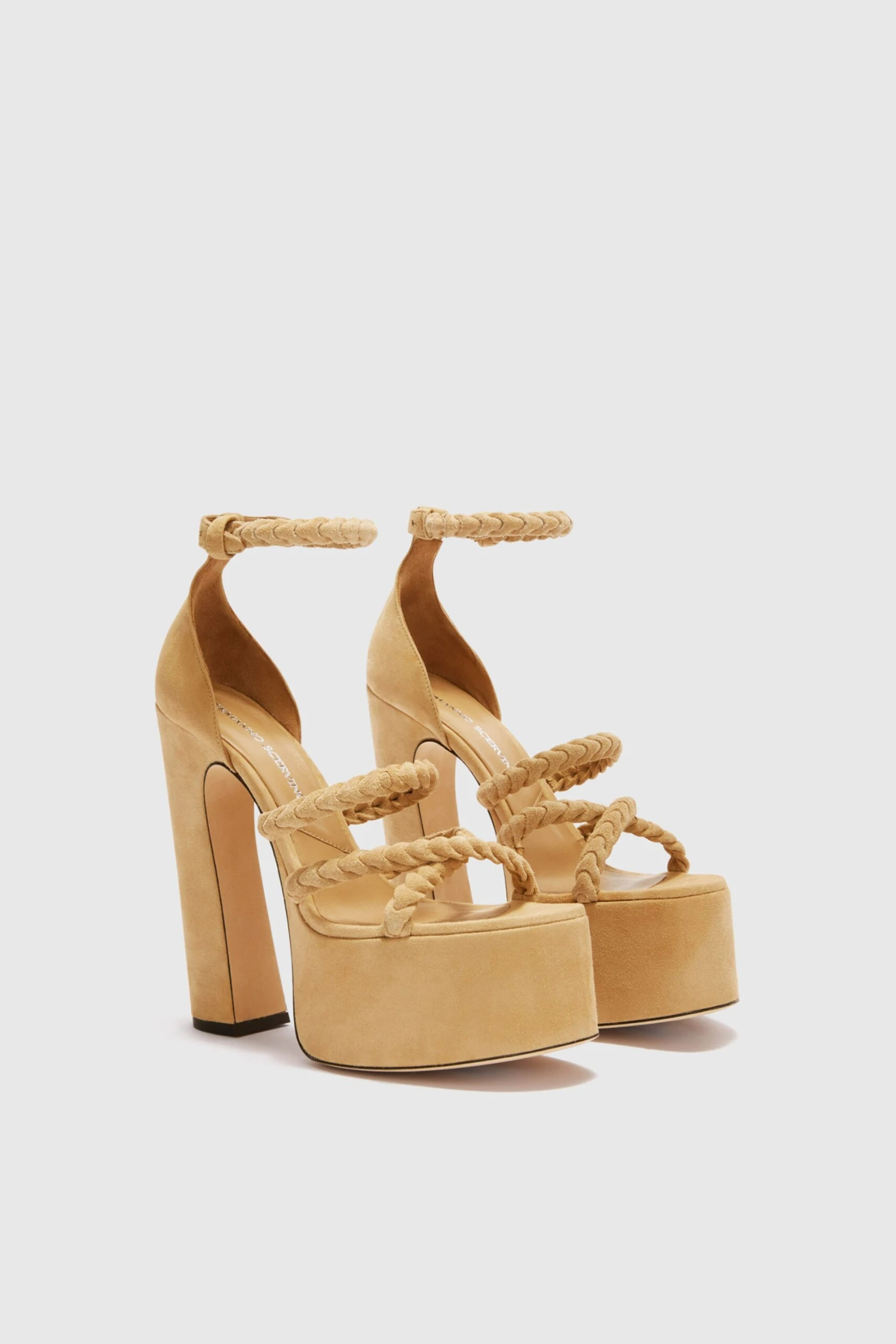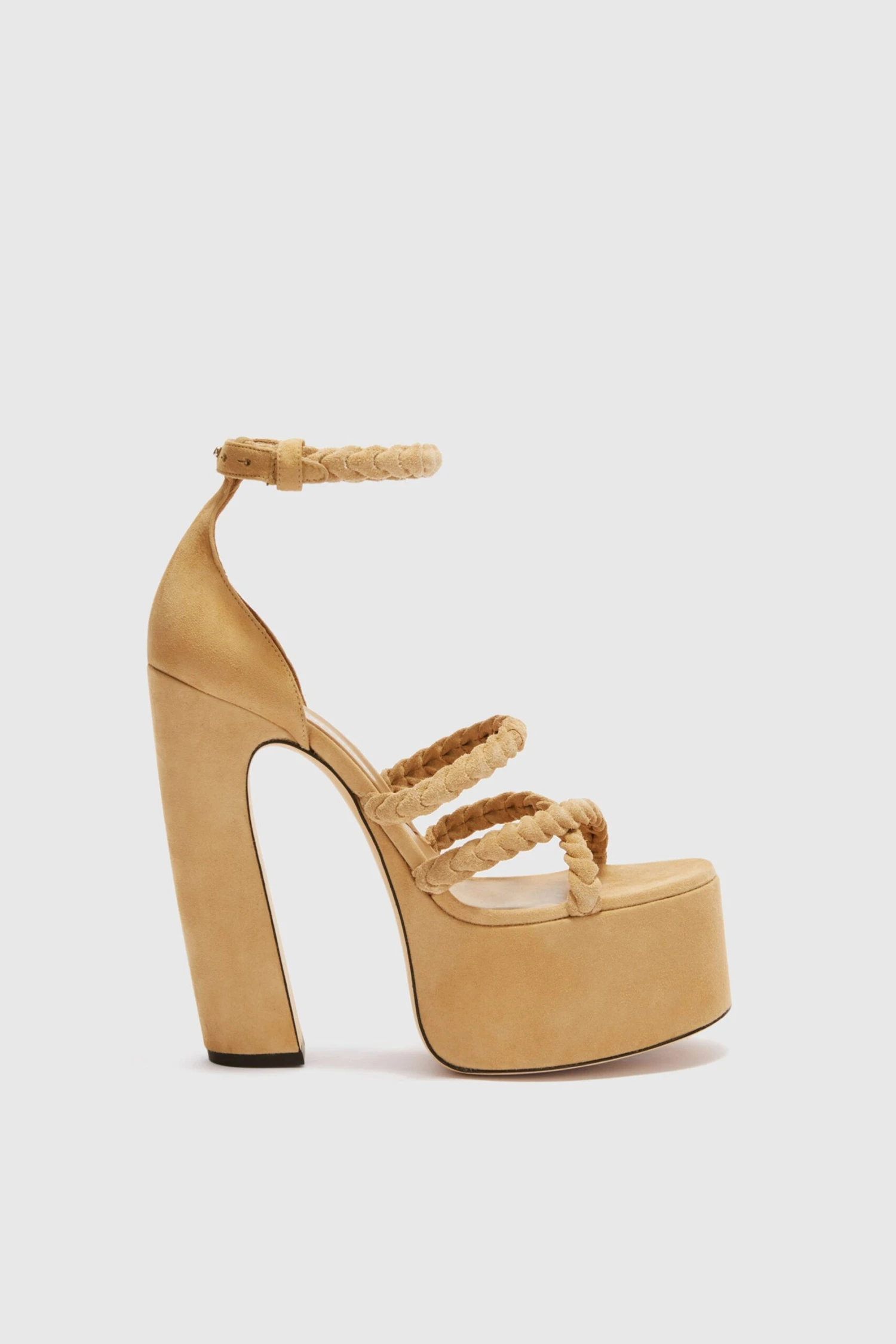 Platform in beige nuvolato suede. The sandal is made up of a manual threading handcrafted with a high leather goods method and a closure on the back of the ankle consisting of an adjustable cufflink. The strap ends with a workmanship that resembles the head of a snake, which can be blocked with a loop. The chunky comma heel is 16cm high.