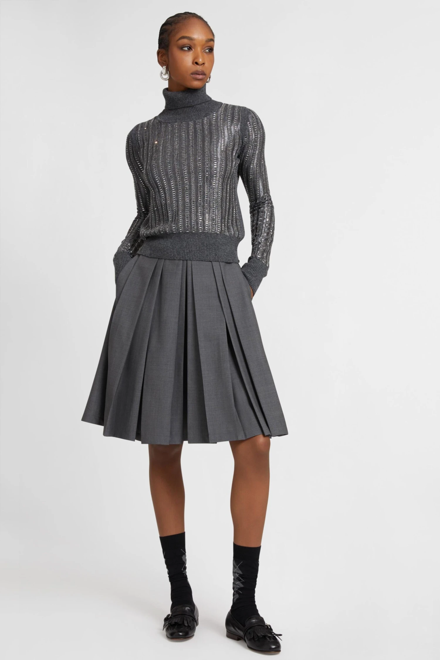 With its timeless charm, this skirt in cool wool reinterprets the collegiate style with contemporary elegance. The pleated construction gives movement and lightness to the silhouette, while the knee-length makes it a versatile and refined garment, an expression of the distinctive tailoring of Ermanno Scervino. Perfect when paired with the light blue cropped shirt and the argyle-patterned sock loafer, for a preppy-inspired but sophisticated look.