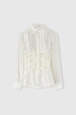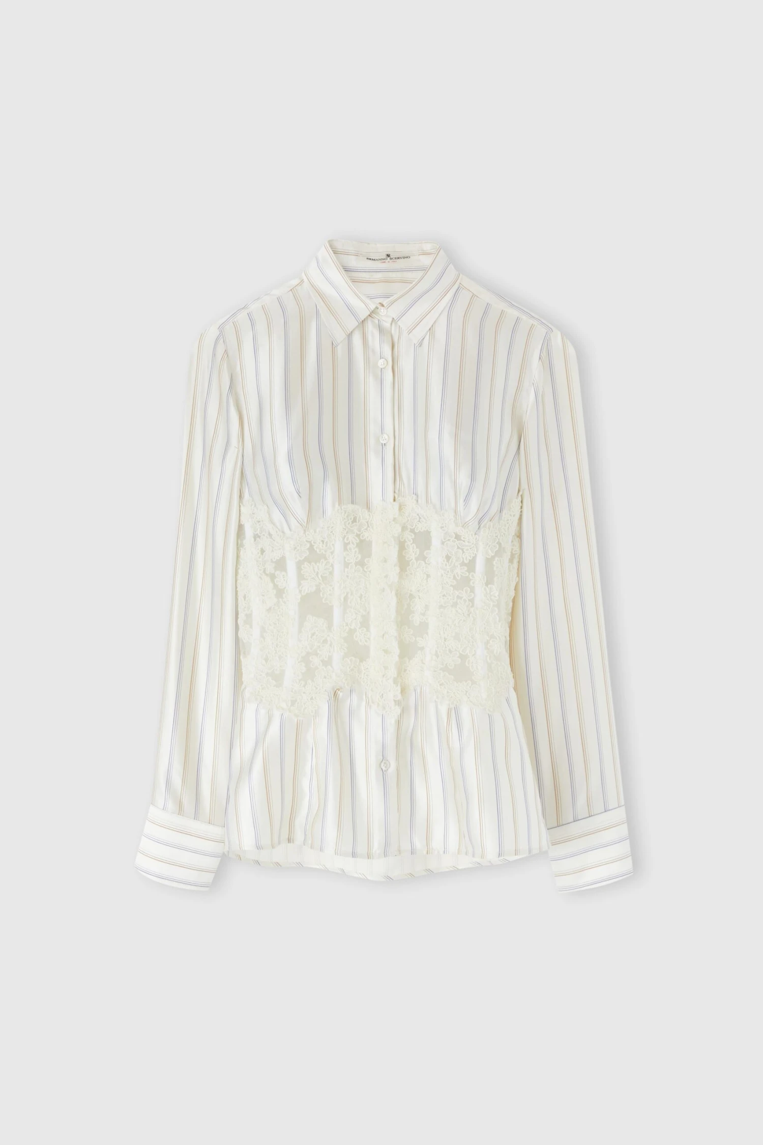 A shirt that expresses femininity and elegance through a refined combination of materials and workmanship. Made of pure silk with a delicate multicoloured micro-striped print, it is embellished with a corset-effect bustier in rebrode lace mounted on tulle, which enhances the floral motif with an evocative play of transparencies. The lace design is an exclusive creation of the Ermanno Scervino maison, testifying to unique craftsmanship.