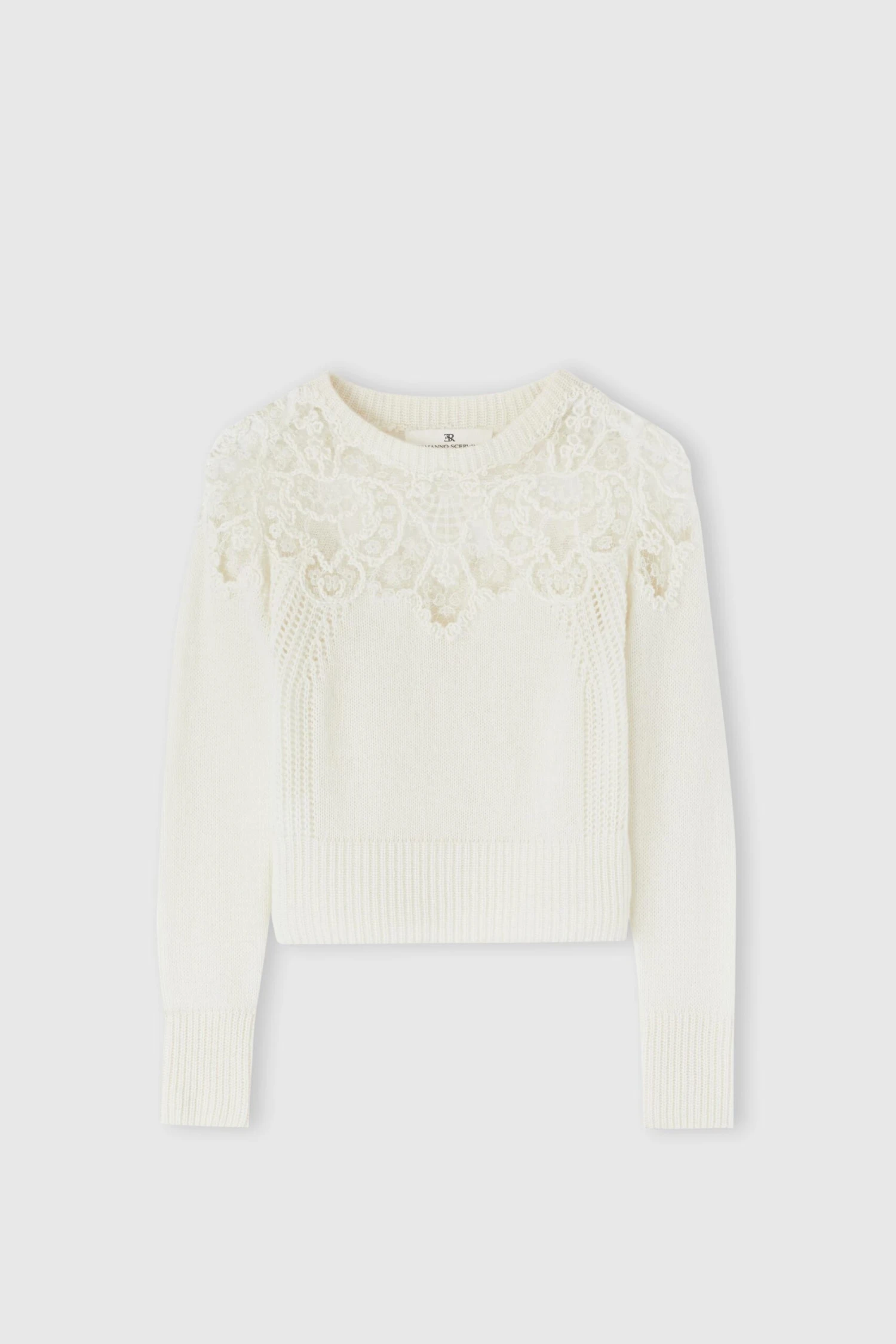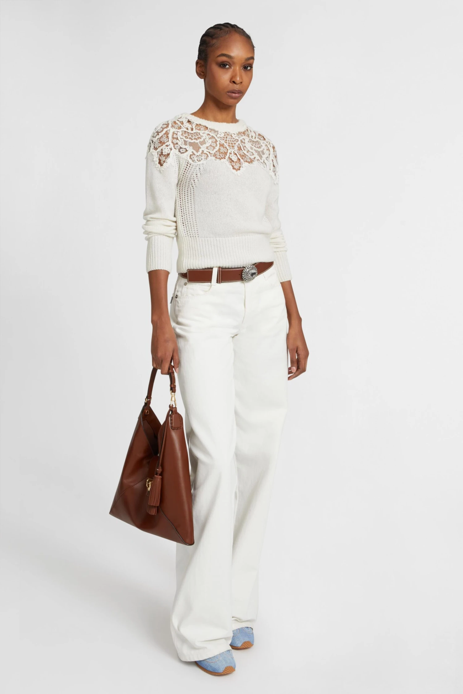 The garment is embellished with an incrustation of rebrode lace in wool, handmade, which develops with discreet elegance on the upper part of the bust, both on the front and on the back. The floral motif of the lace, exclusive to the Ermanno Scervino fashion house, introduces a romantic and refined note, which enhances the linearity of the sweater with a delicate play of textures. The design is completed by two side inserts with micro-holes, positioned along the sides, which give lightness and movement to the silhouette with a sophisticated transparency.