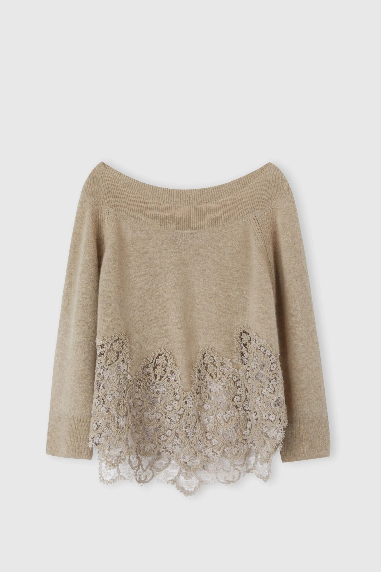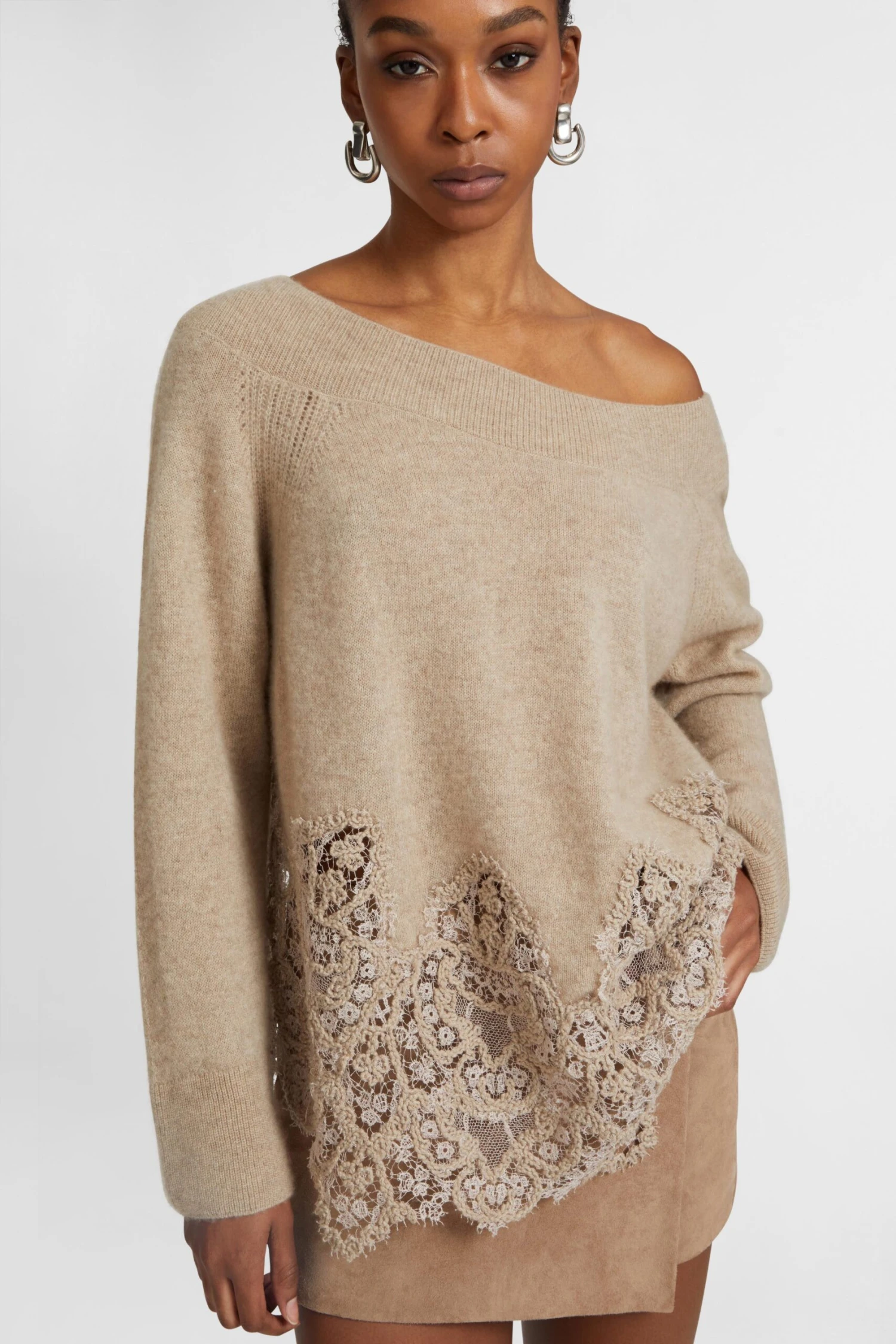 Sensual and refined, this pure cashmere sweater interprets the feminine spirit of Ermanno Scervino with natural elegance. The soft fit and wide neckline, designed to caress the line of the shoulders, make the garment extremely versatile: it can be worn naturally even with one shoulder uncovered, for a relaxed but sophisticated look. The full feel of the cashmere envelops the body with softness, while the essential construction of the silhouette enhances its timeless elegance.