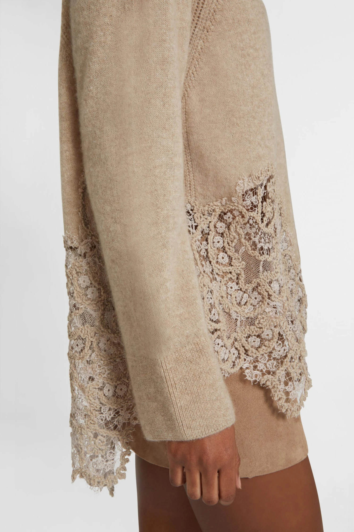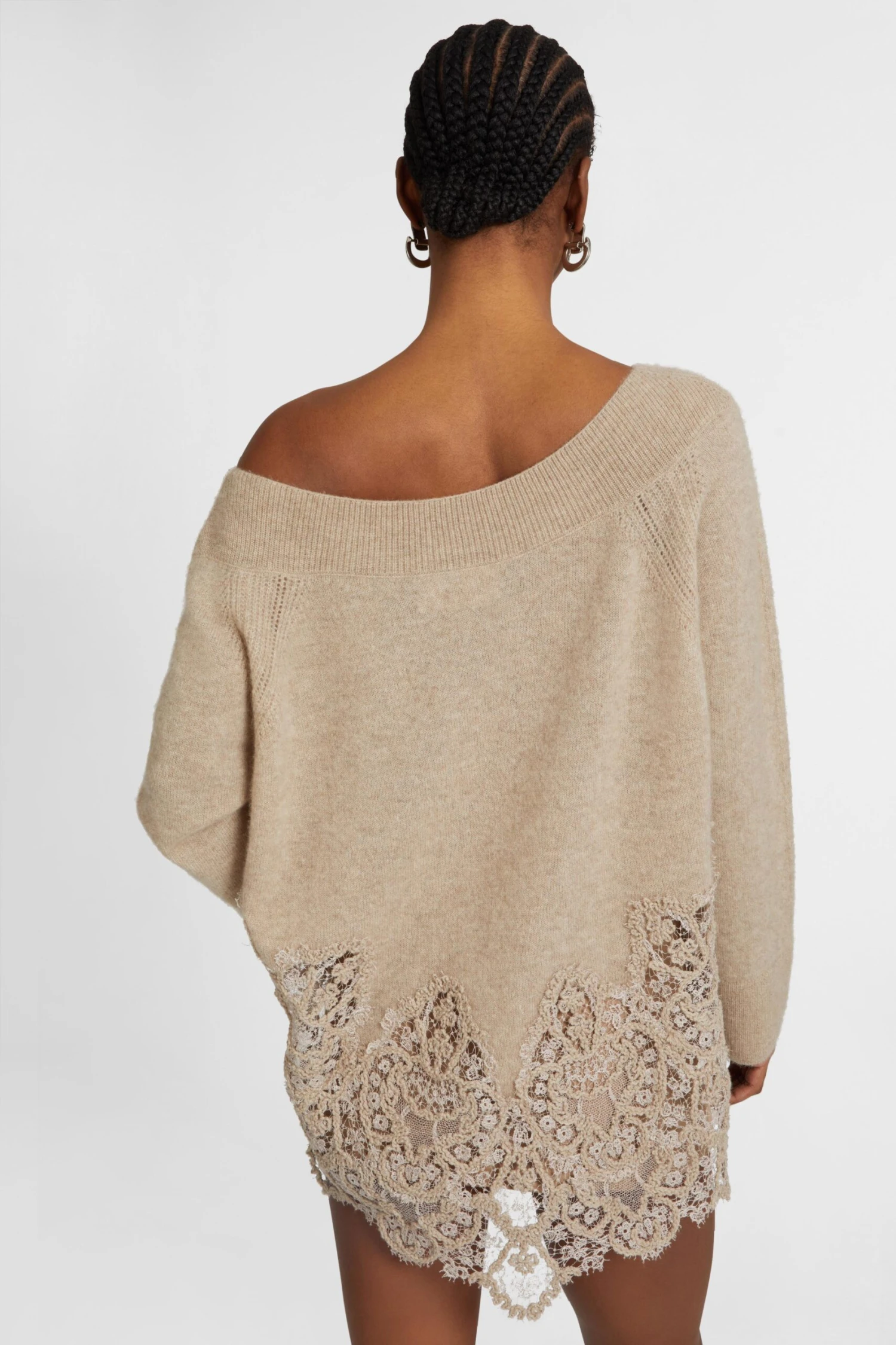 A distinctive detail of the sweater is the wool rebrode lace inlay, applied by hand with artisanal mastery. The floral motif, exclusive to the Ermanno Scervino fashion house, adds a romantic and precious touch, playing in refined contrast with the materiality of the yarn. The tight ribbing on the edge of the neckline and on the cuffs guarantees comfort and elasticity, maintaining the soft but well-defined line.