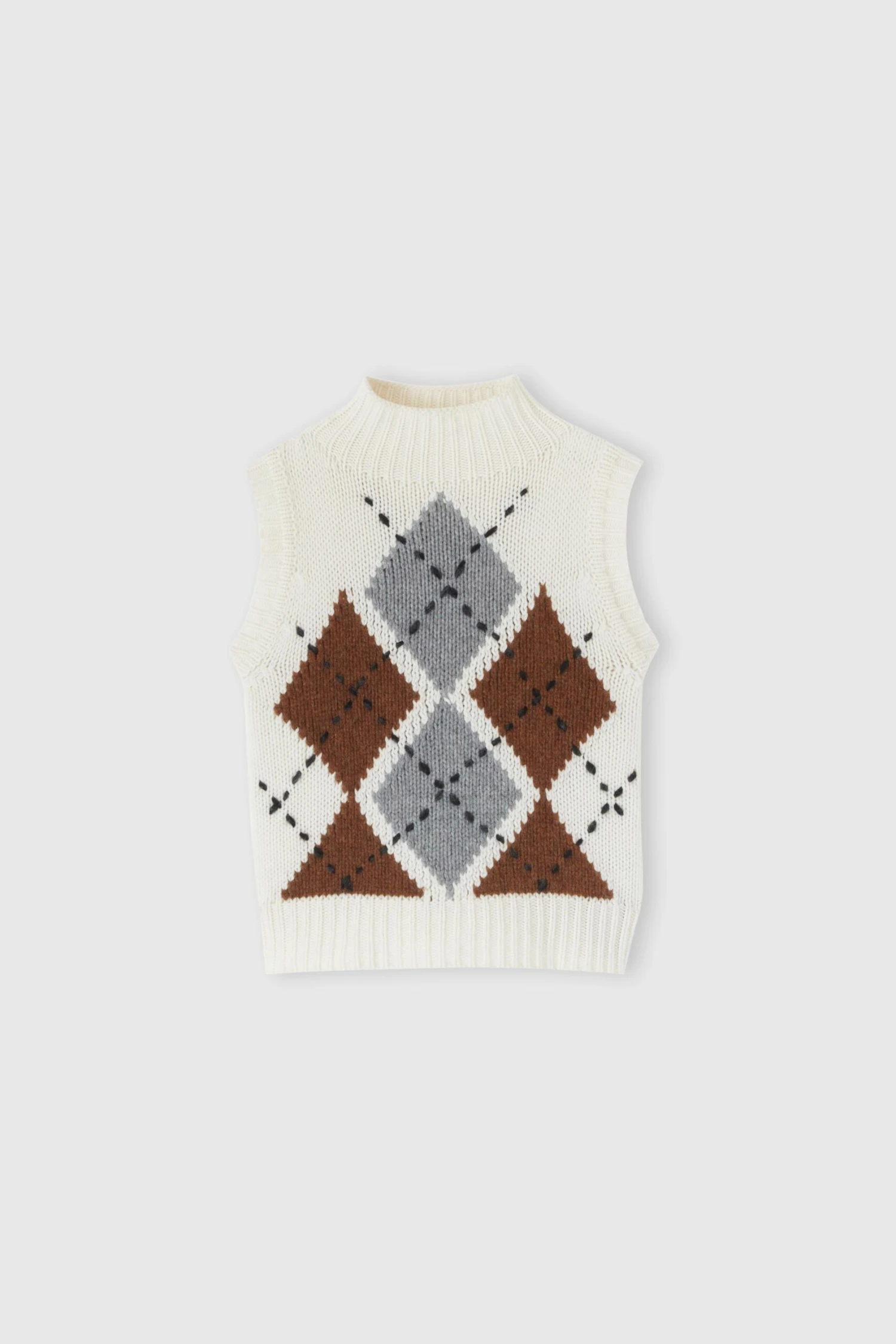 The argyle motif, a key element of the collection, decorates both the front and back of the piece in a sophisticated two-tone version in shades of gray and brown. Inspired by British tradition and reinterpreted with an architectural gaze, the pattern gives life to a contemporary geometry that renews the preppy design with balance and character.