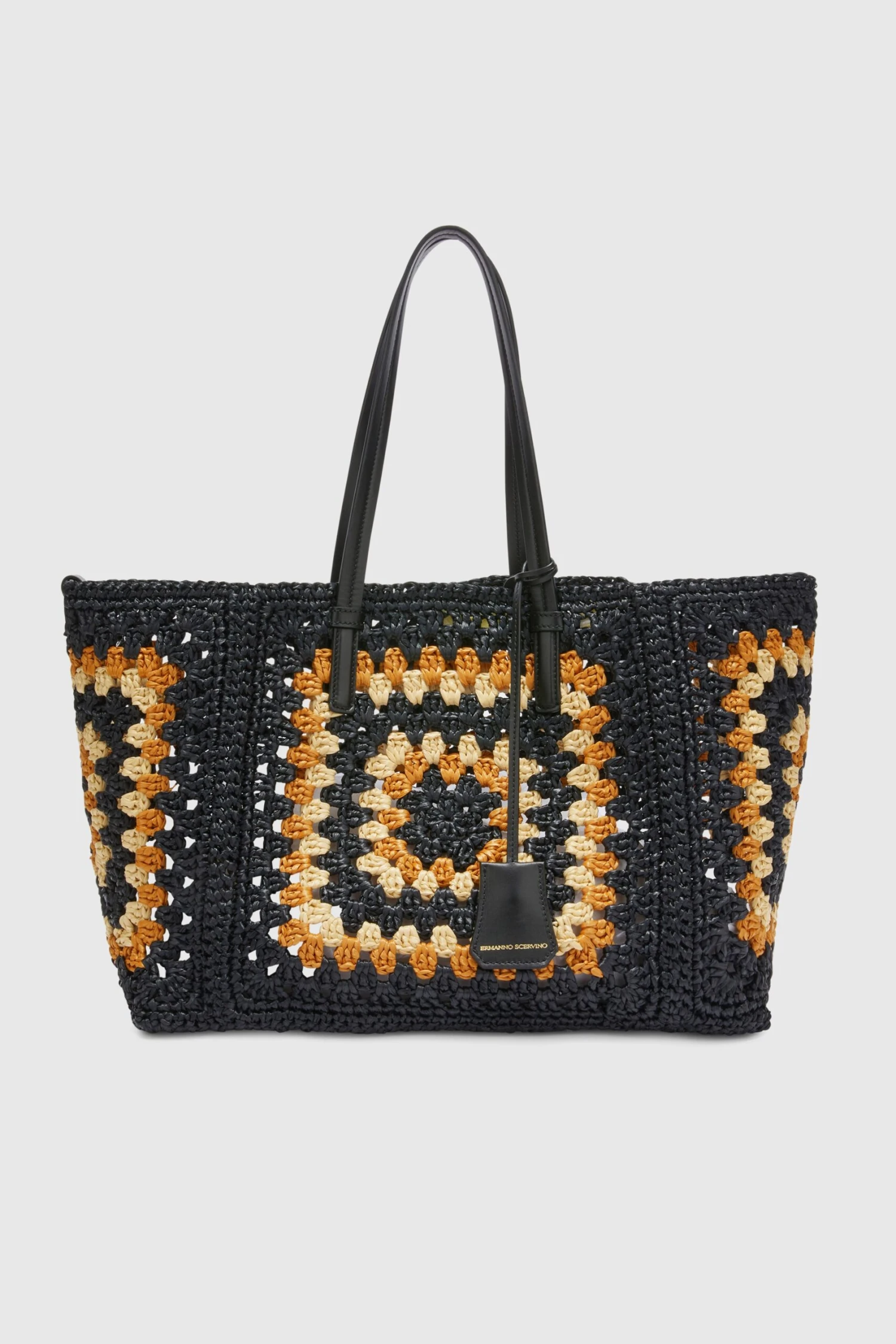 Unlined and unstructured shopping bag, with smooth calfskin handles and a shell made of rafia with multicolored crochet workmanship. The bag features a leather bell with a logo padlock. The crochet workmanship in rafia used this season is a refined technique made by hand. This workmanship uses the “high mesh” stitch, which creates a three-dimensional texture and a visual effect of great impact. The dimensions are 38*30*19.