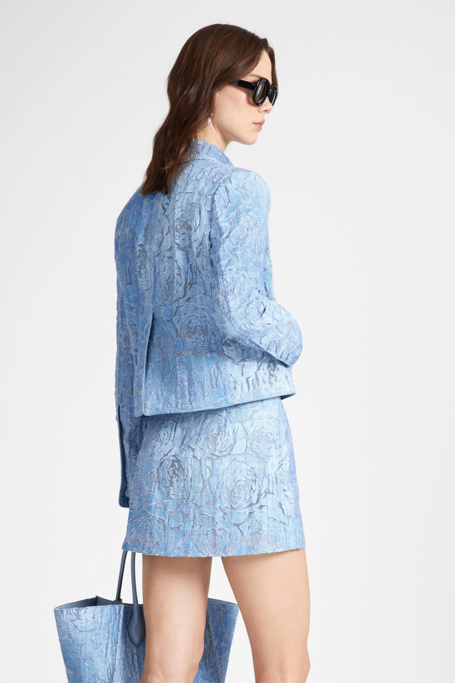 Short double-breasted jacket with rounded collar. The particular floral motif is created through the devore technique: a chemical process that corrodes the fibres of the fabric to compose a pre-established design. The summarys are wrapped in the same material.
