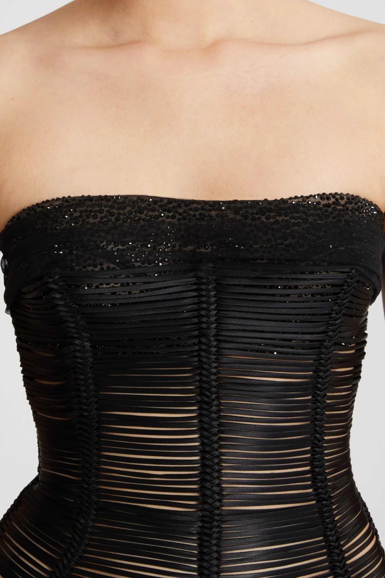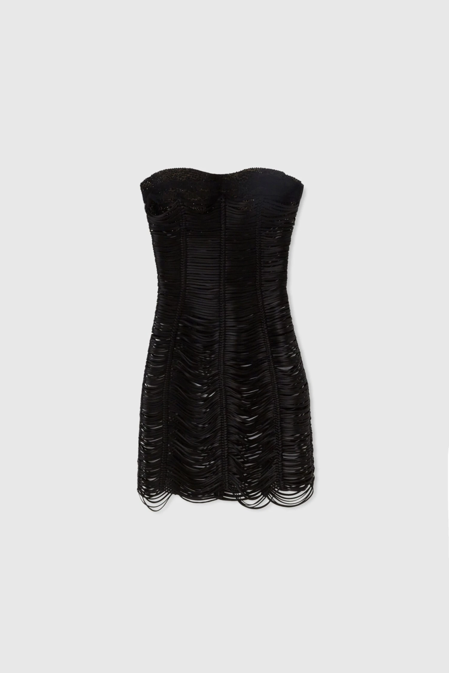 Stretch silk short bustier dress with concealed back zip fastening. The top is special, made of toulle and studded with matching micro crystals for a layer effect. The dress is handcrafted using the special technique of soutache: a flat silk tape cord is created and sewn, twisting it around itself. The final effect is the result of manual work aimed at assembling all the flat cords that make up the garment.